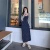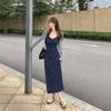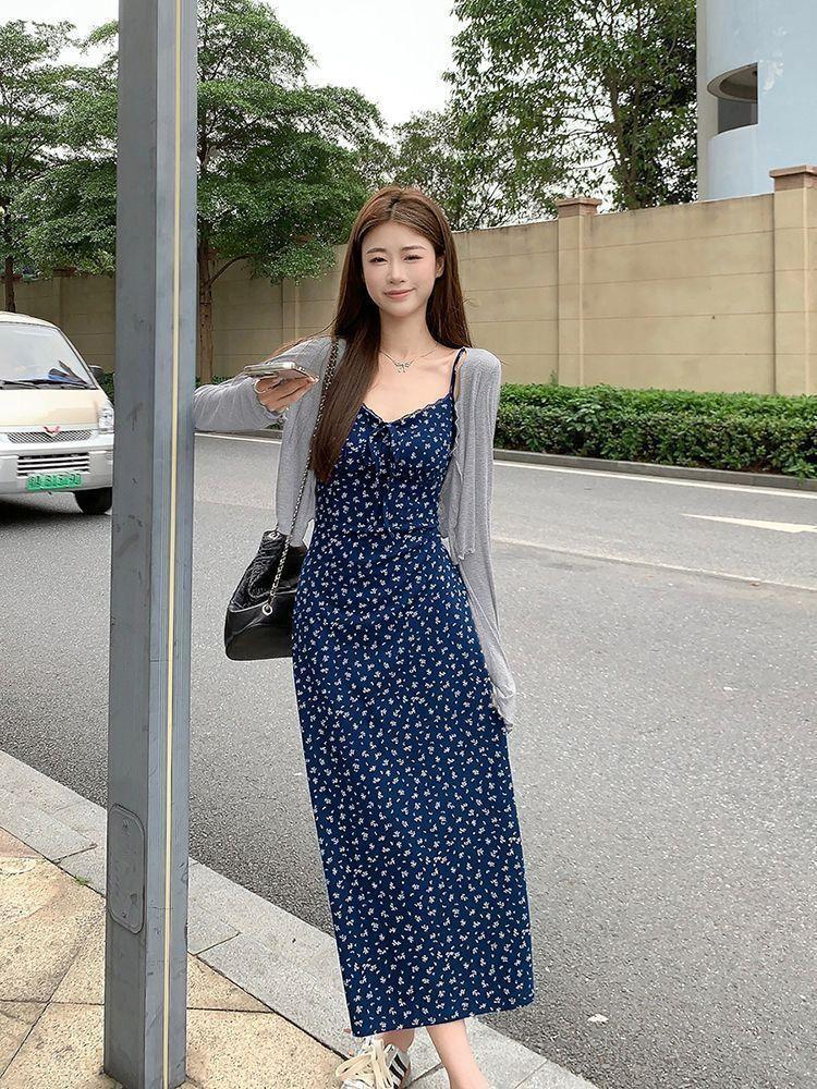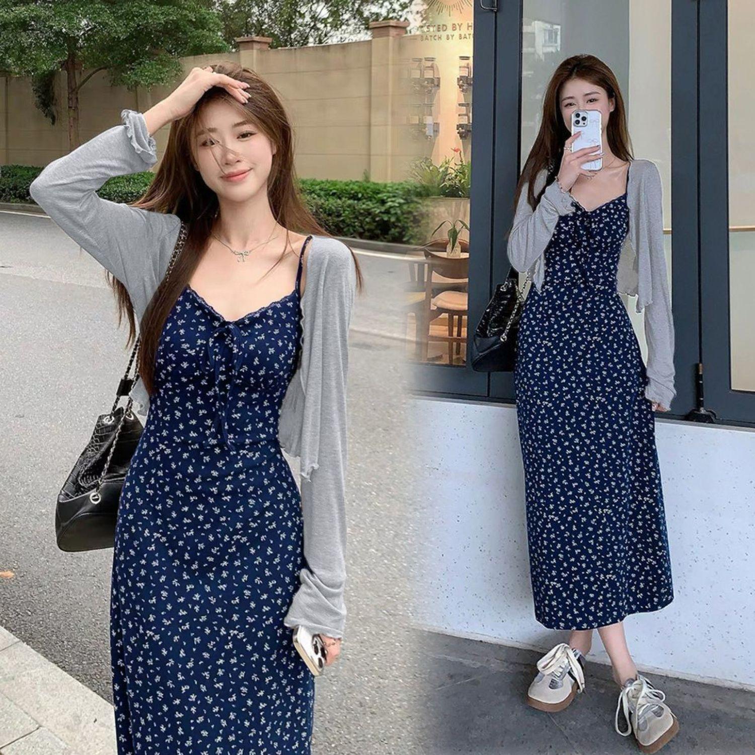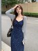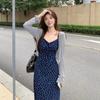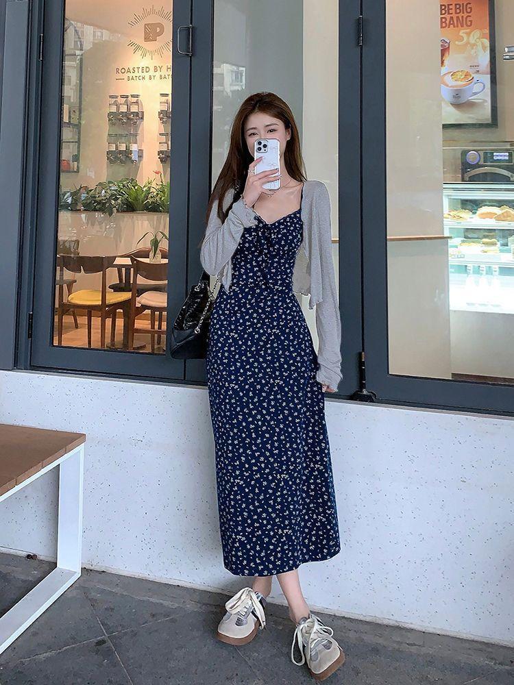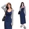 Conjunto de otoño, un conjunto de temperamento suave estilo coreano adelgazante vestido floral mujeres cárdigan tirantes vestido largo conjunto de dos piezas