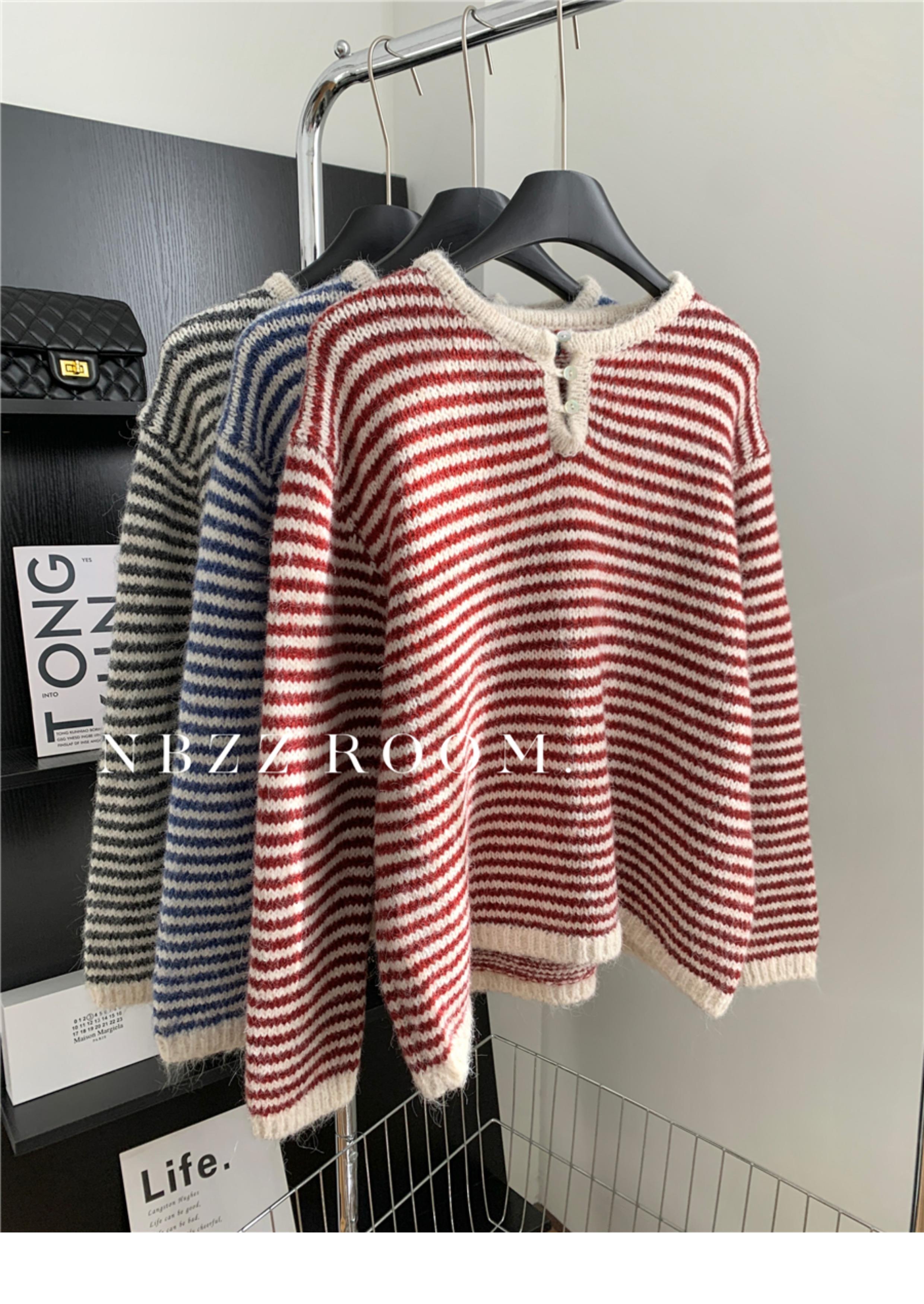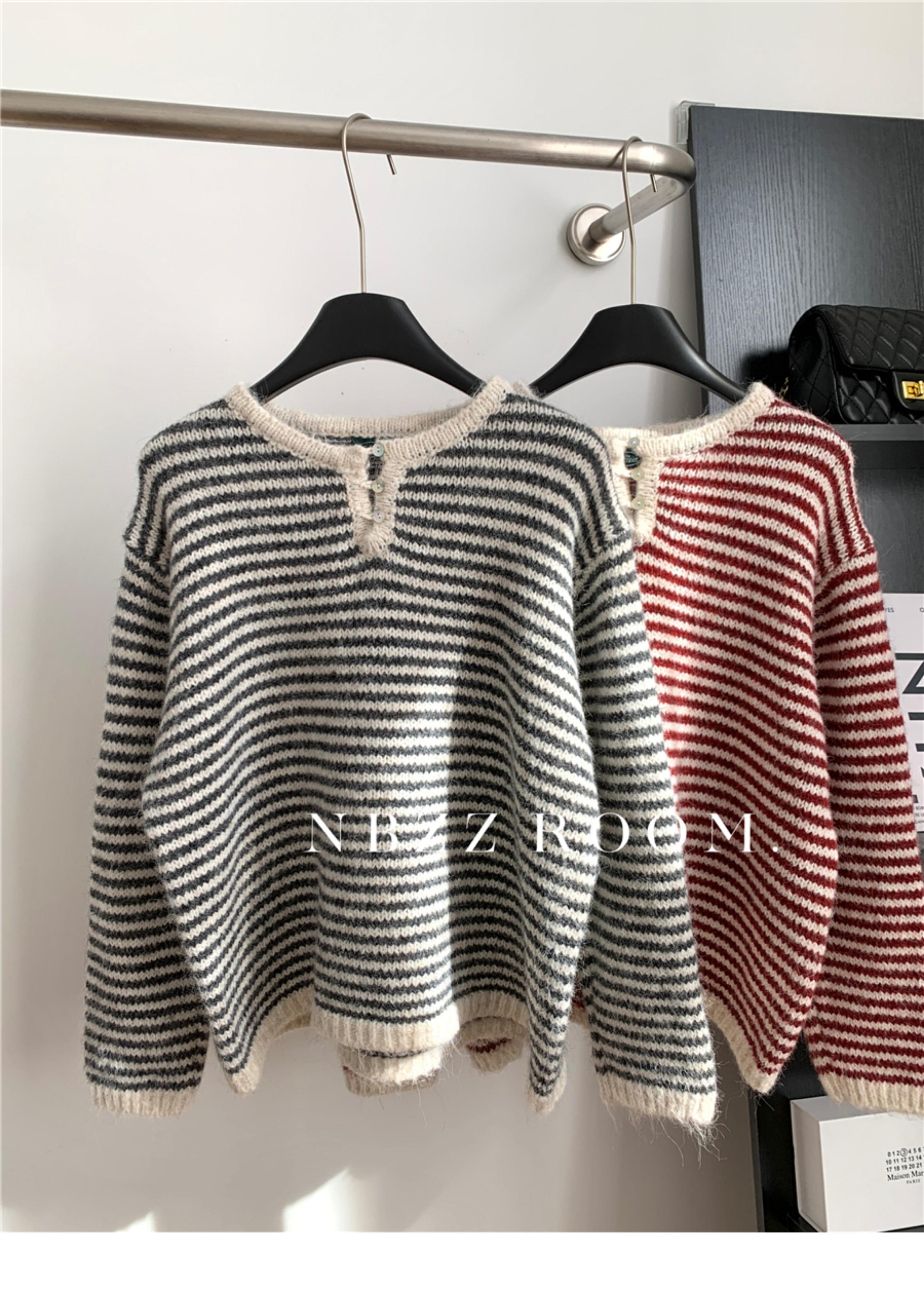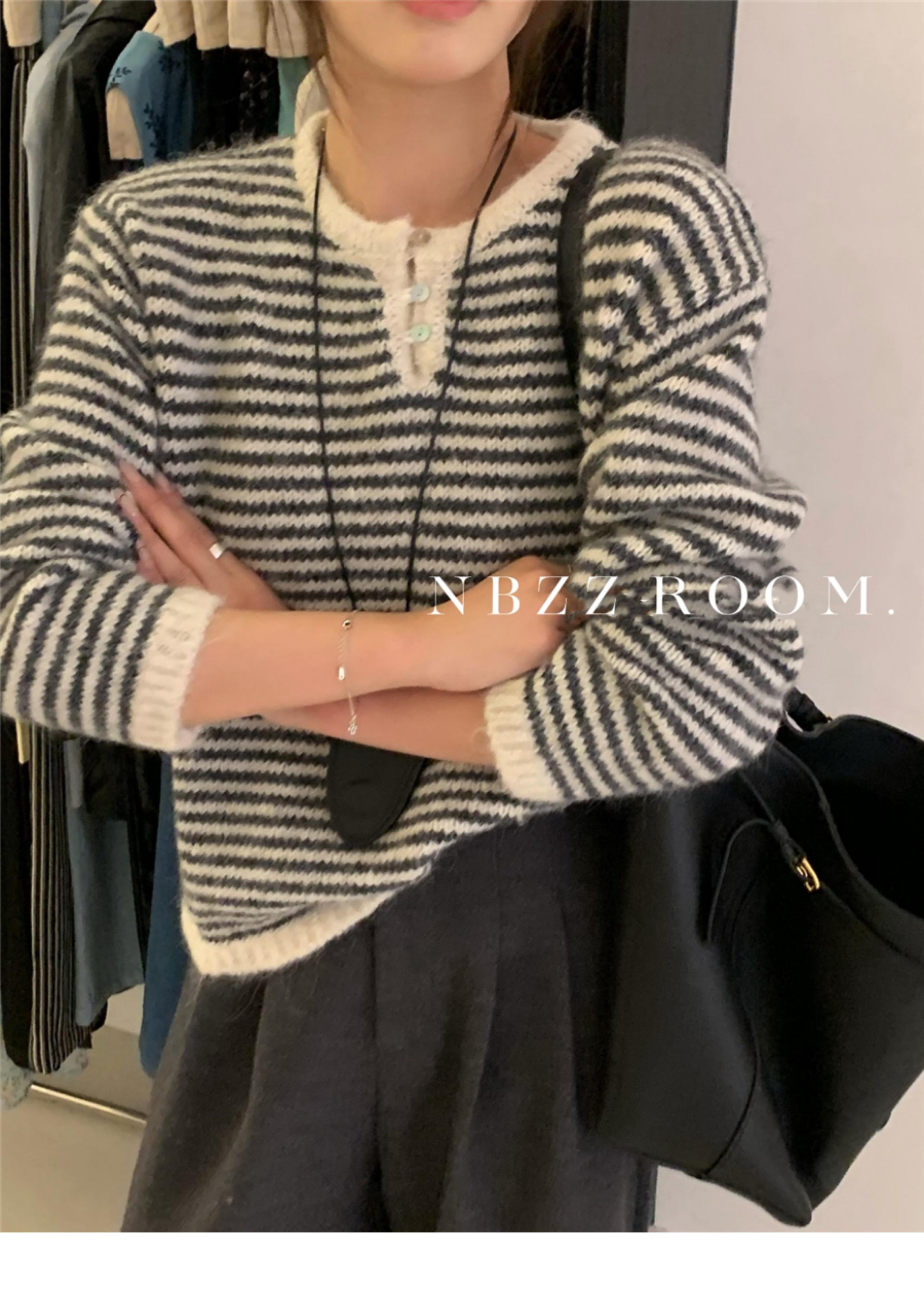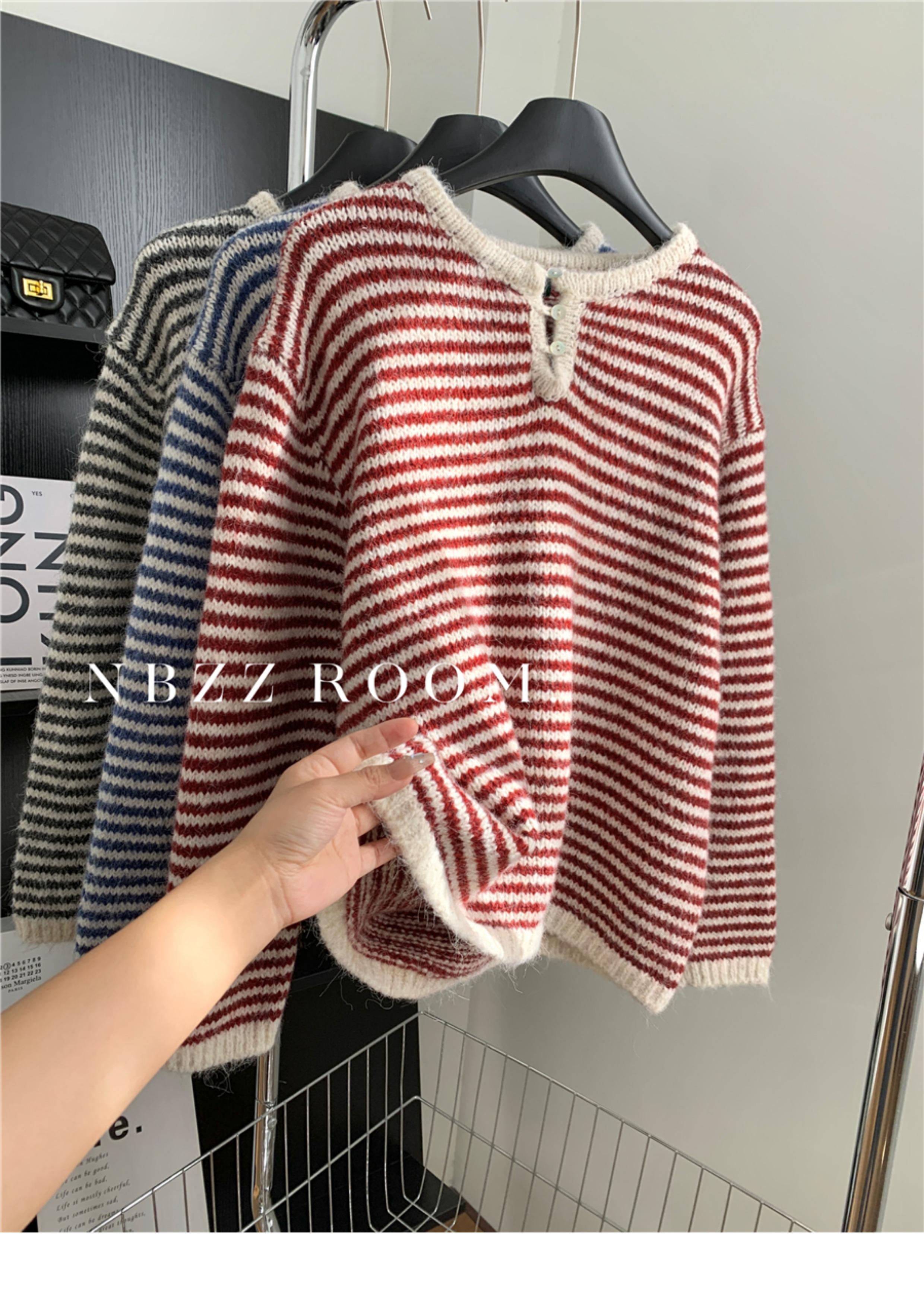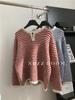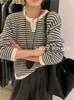 Suéter de rayas con hebilla de concha perezosa retro de principios de primavera 2025 para mujer, estilo coreano, combinable con todo, corte ajustado, manga larga