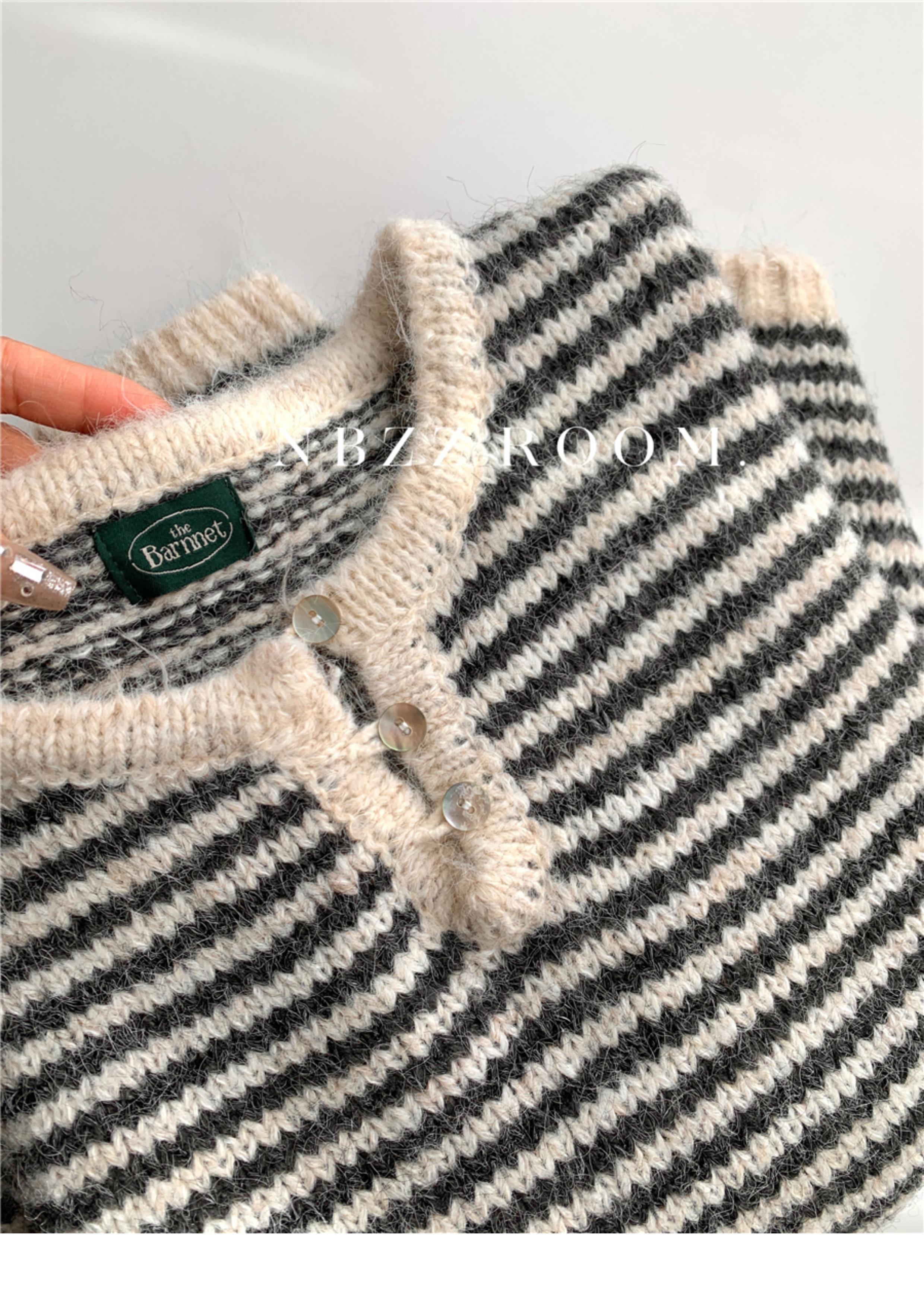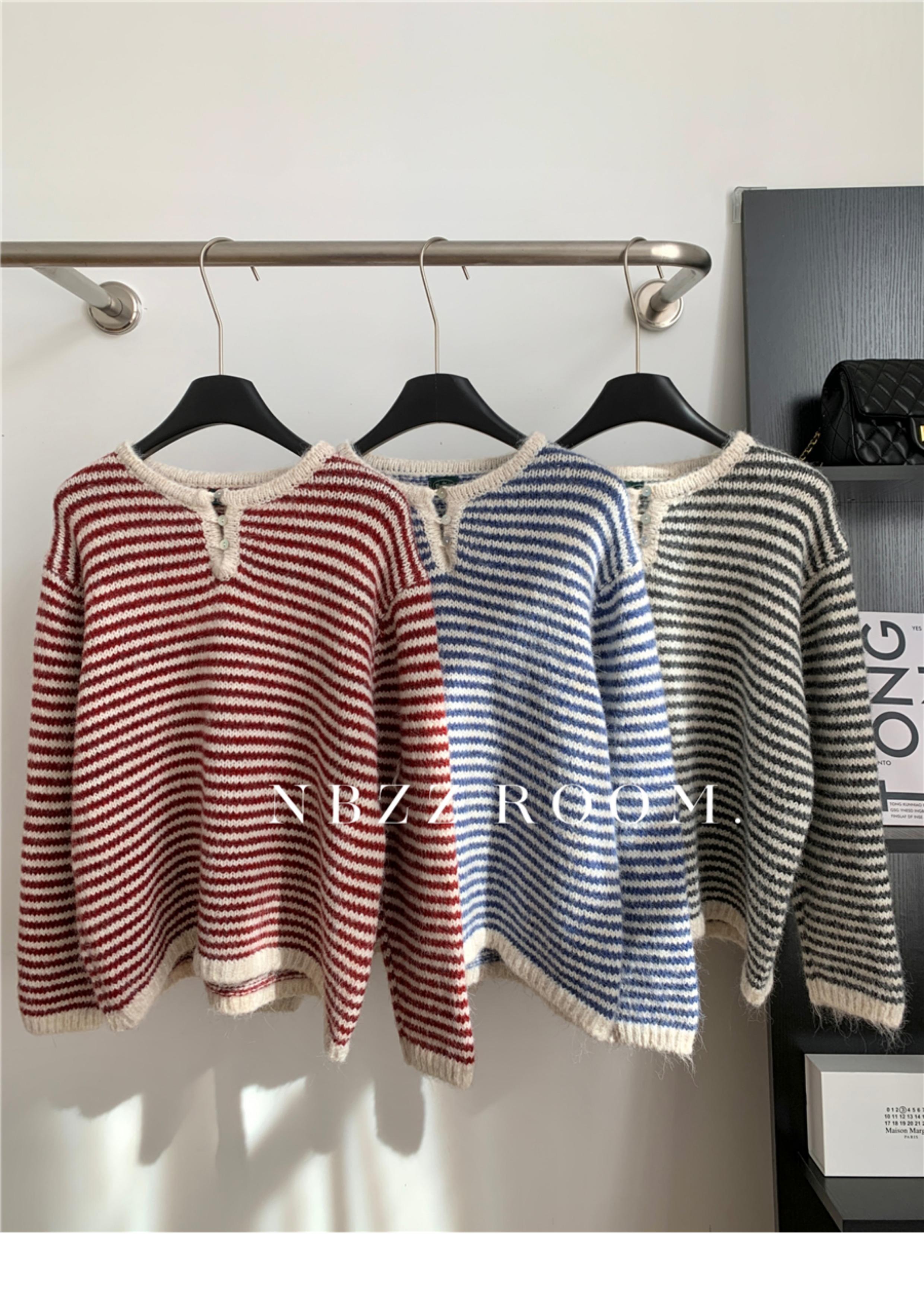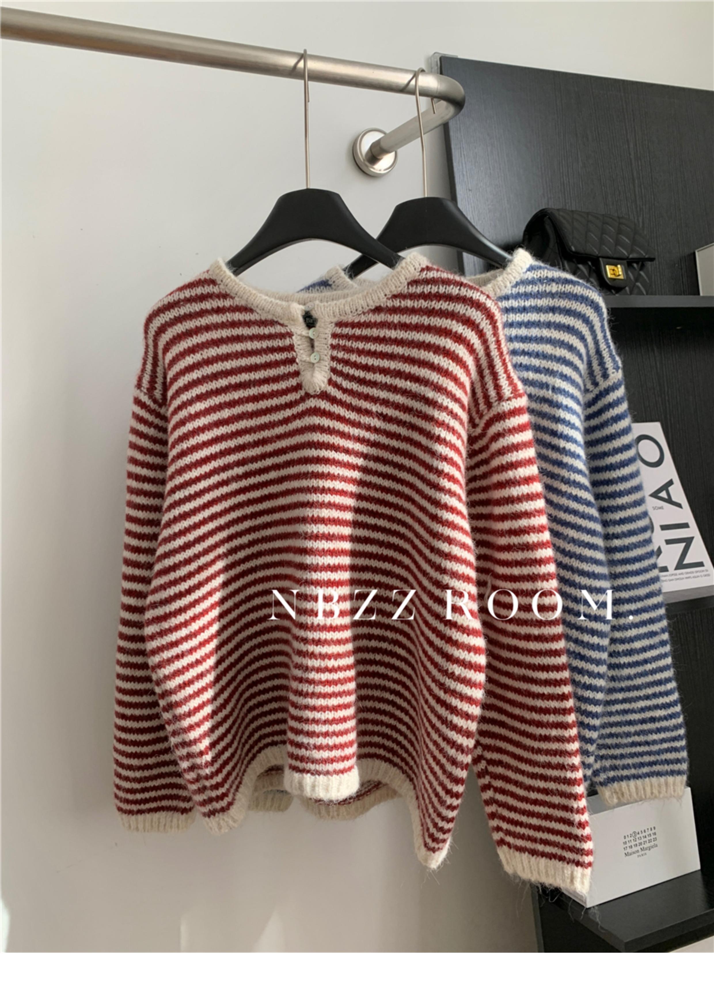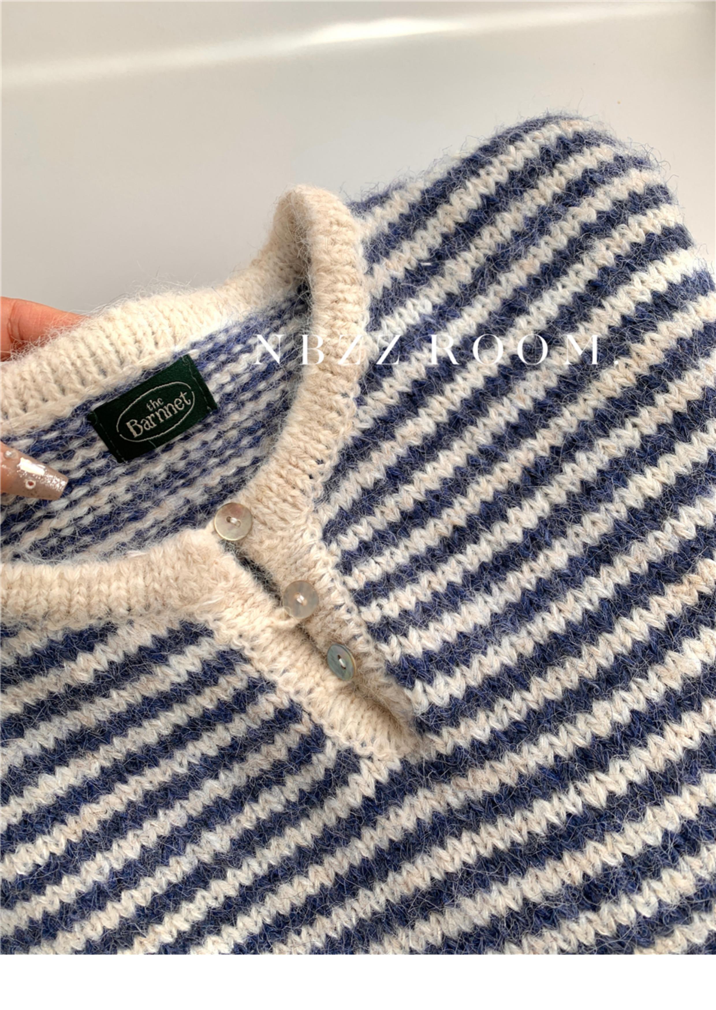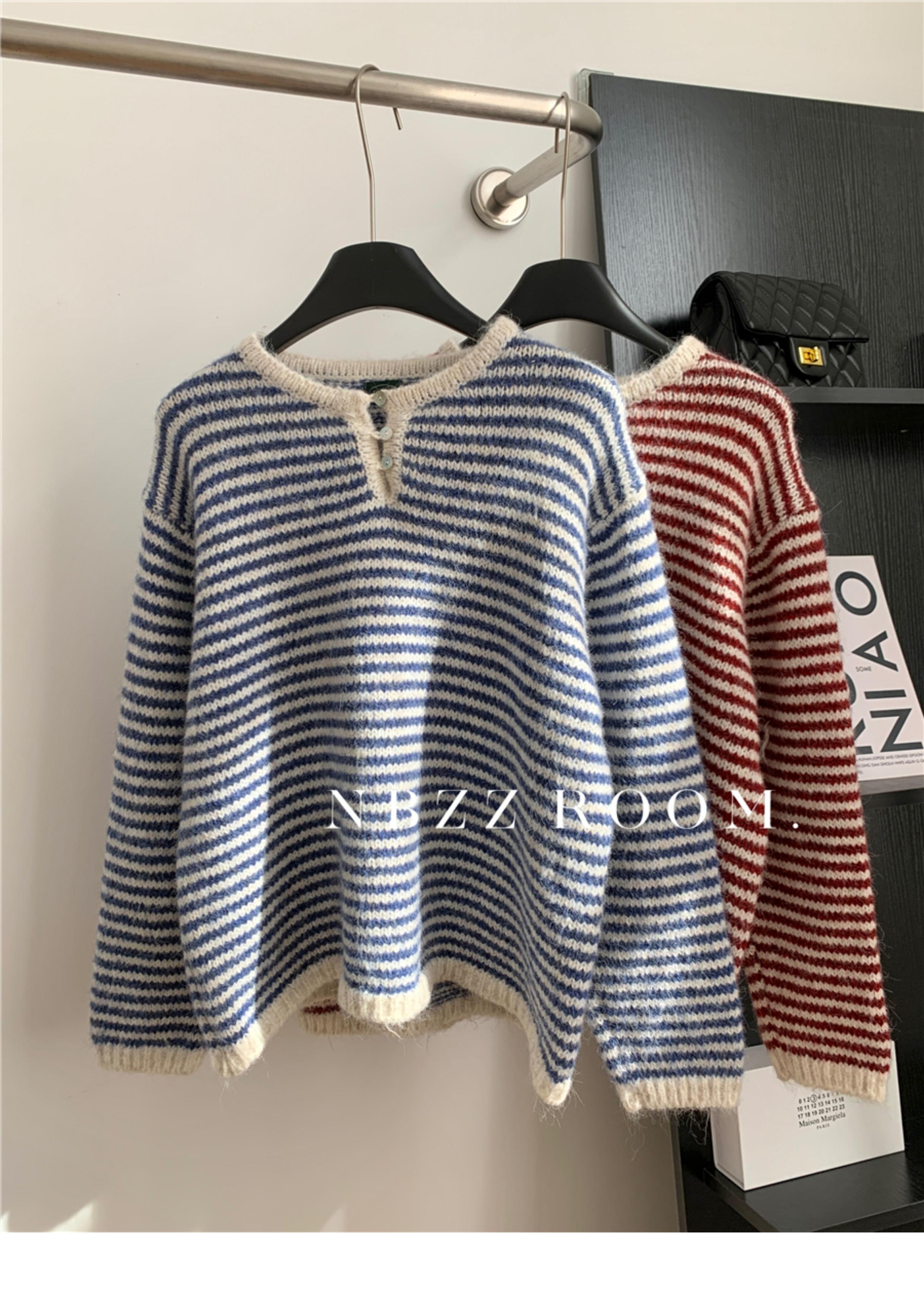 Suéter de rayas con hebilla de concha perezosa retro de principios de primavera 2025 para mujer, estilo coreano, combinable con todo, corte ajustado, manga larga