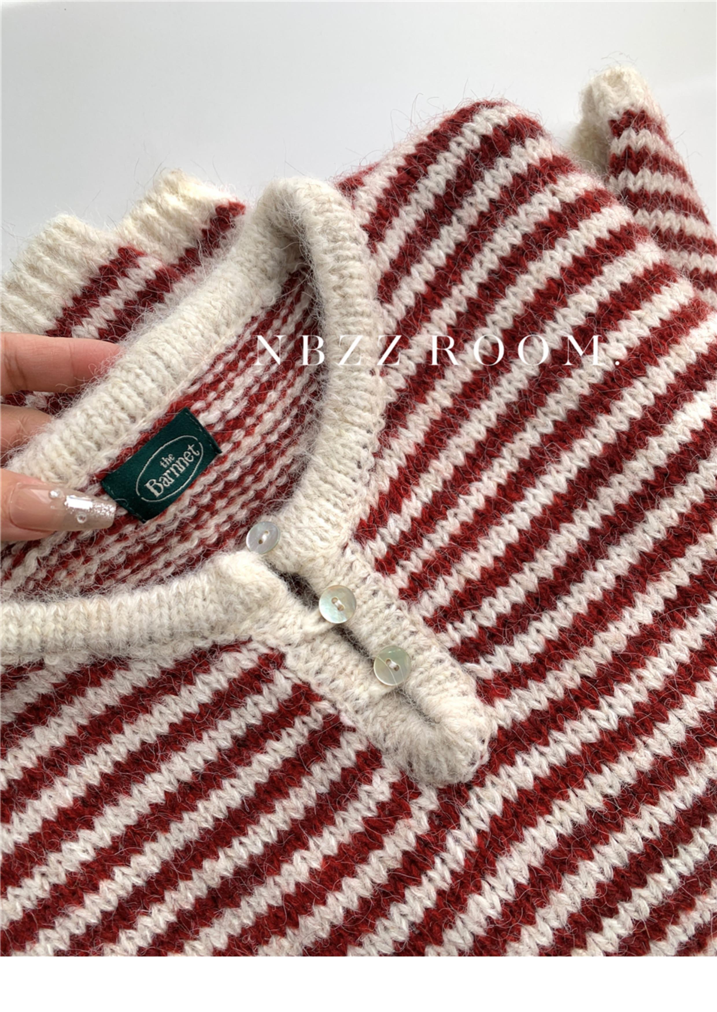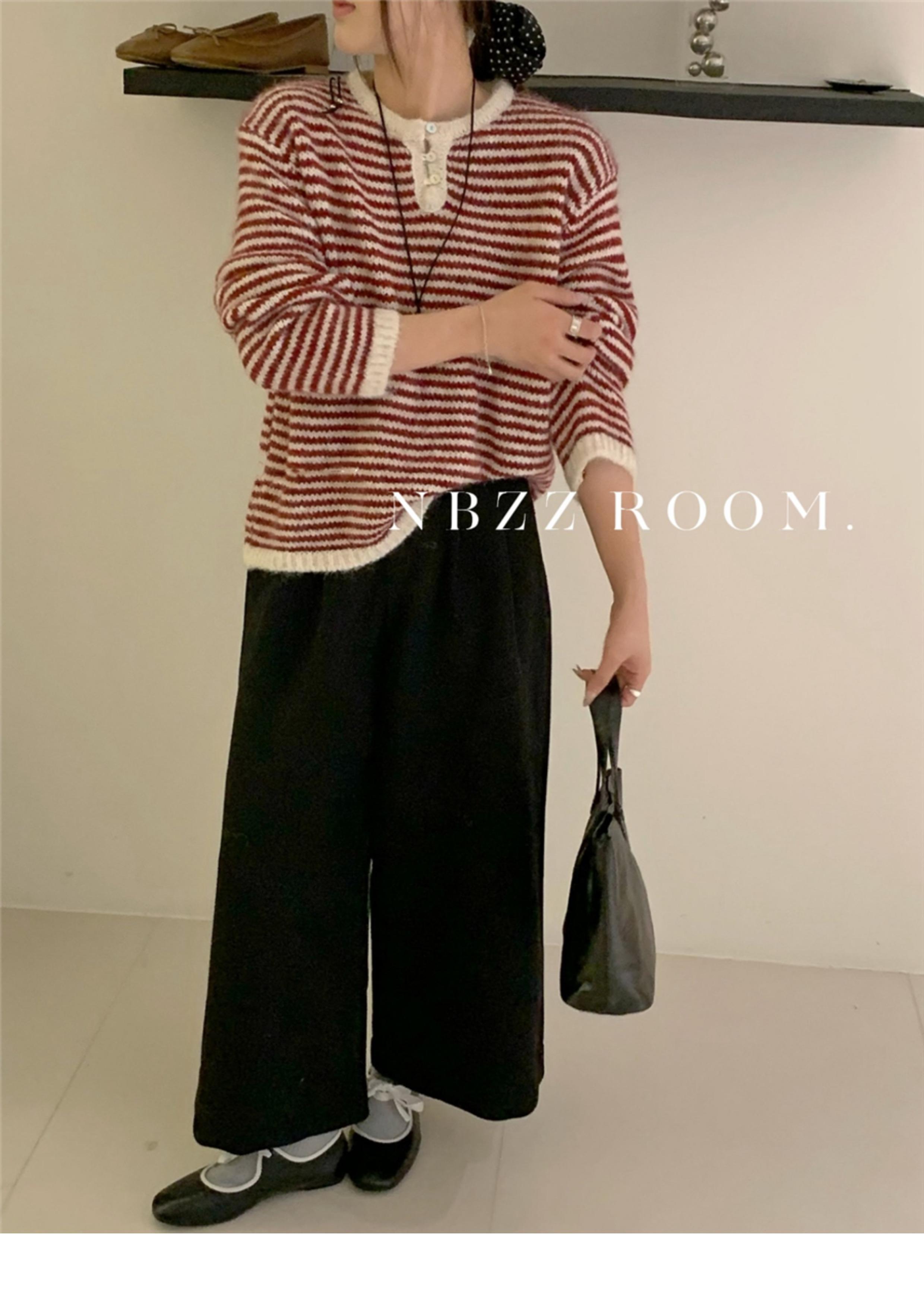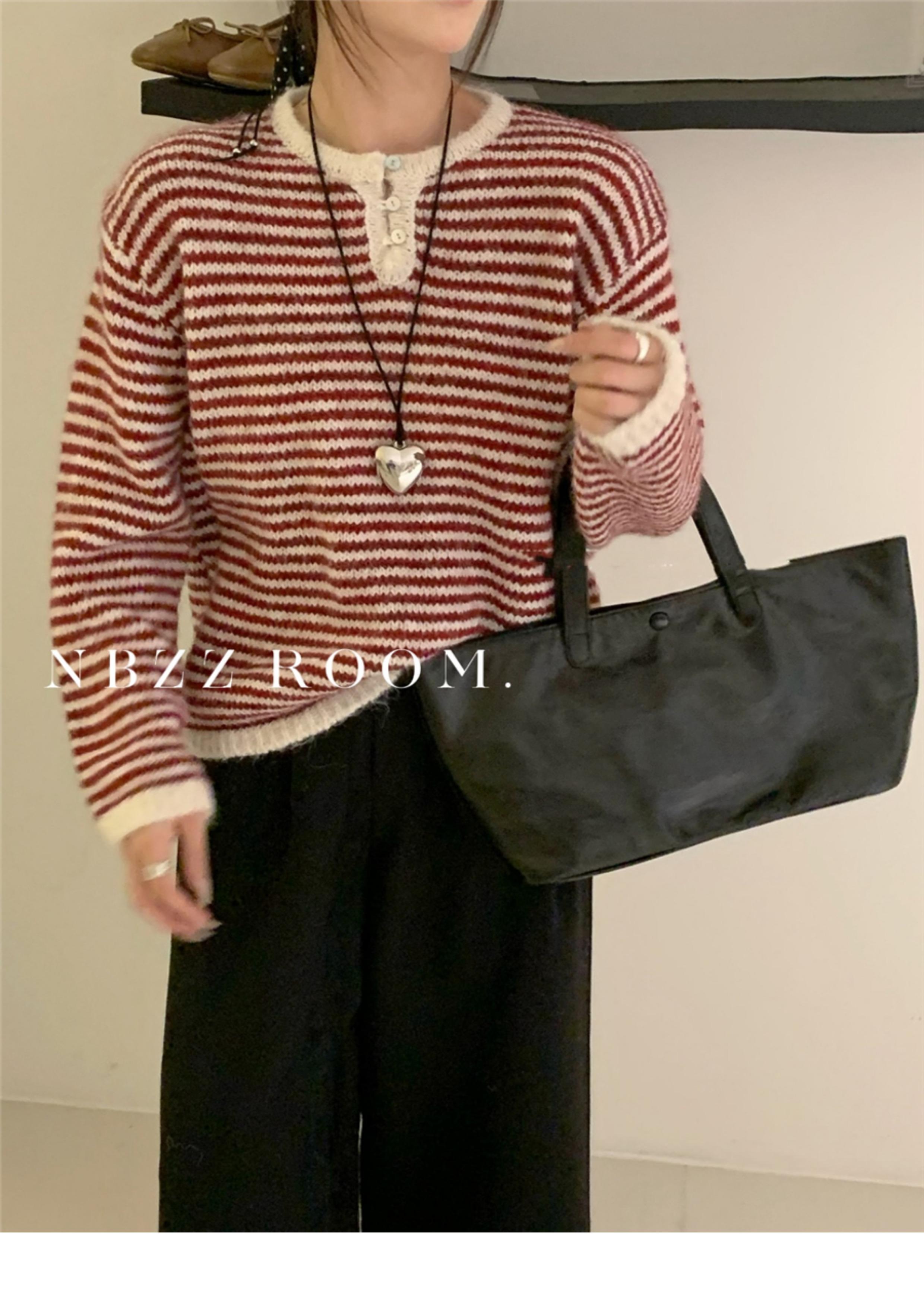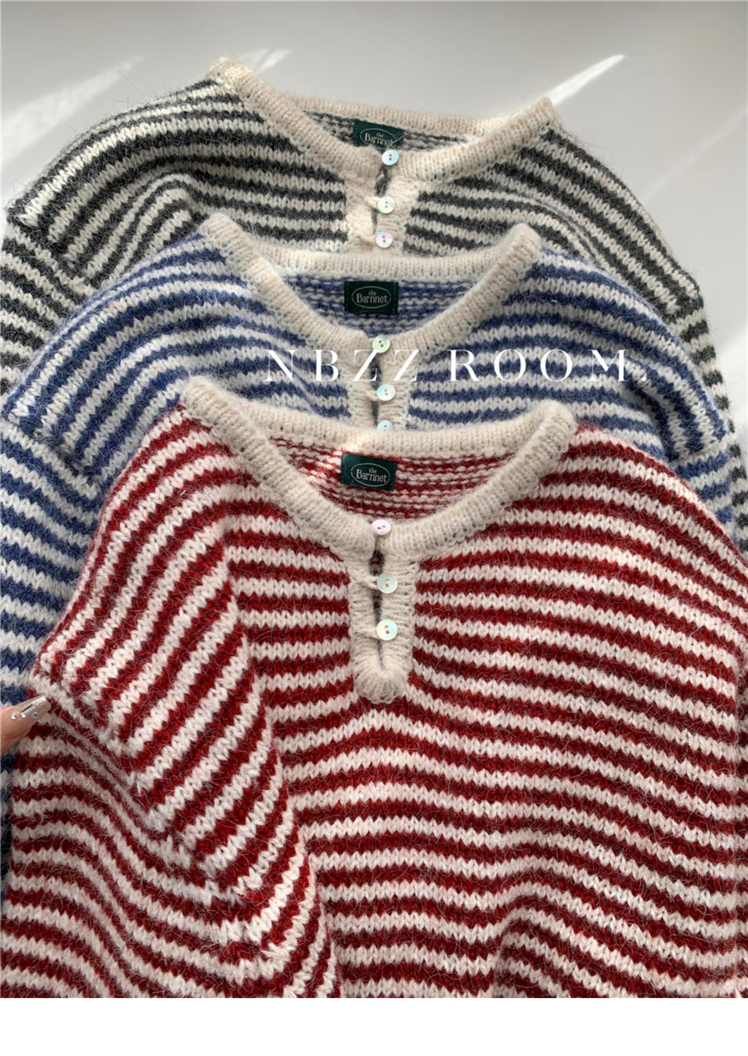 Suéter de rayas con hebilla de concha perezosa retro de principios de primavera 2025 para mujer, estilo coreano, combinable con todo, corte ajustado, manga larga