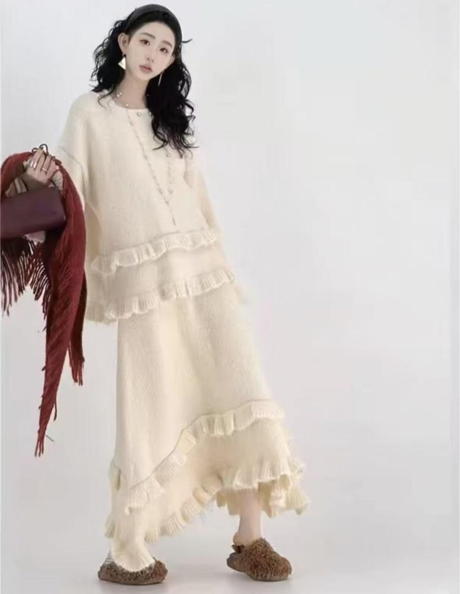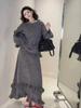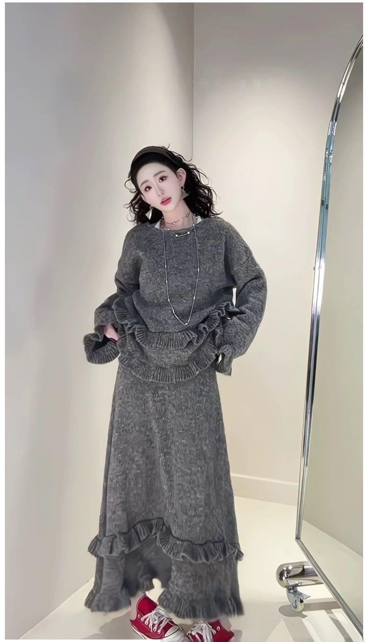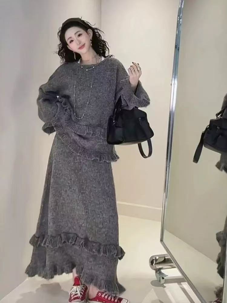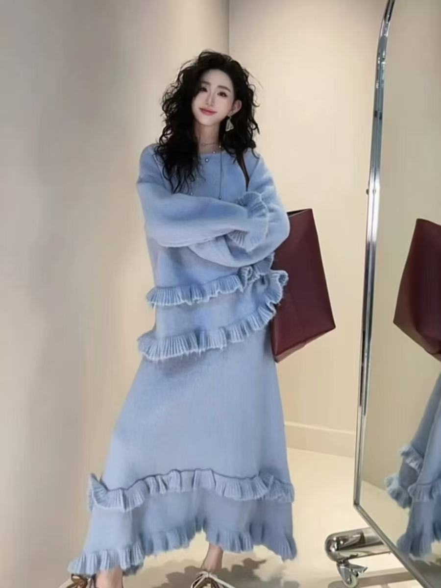 Conjunto de suéter y falda de punto con diseño de volantes de estilo dulce francés para mujer, vestido largo de moda de dos piezas para otoño e invierno 1163