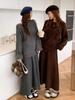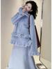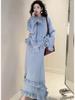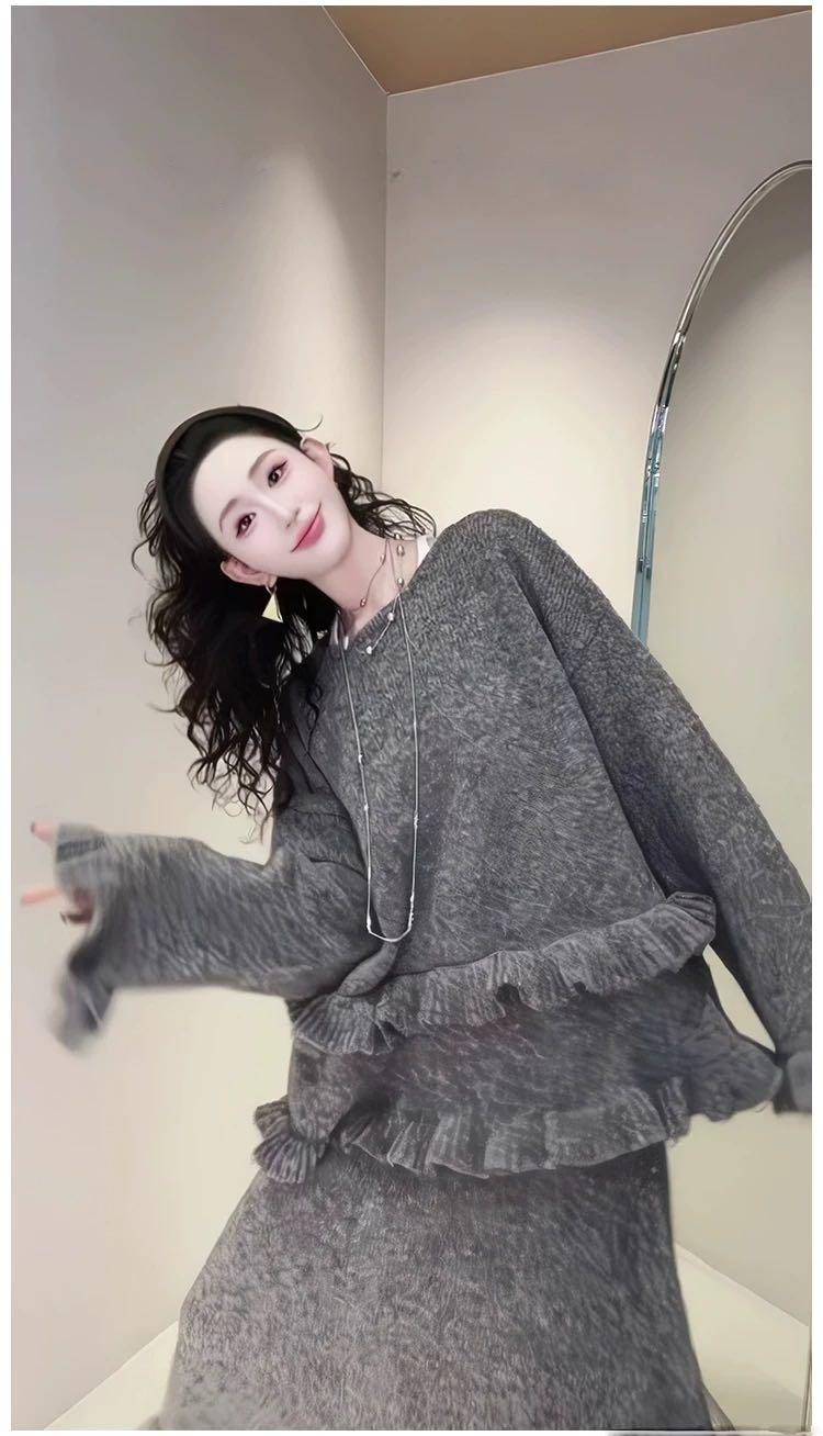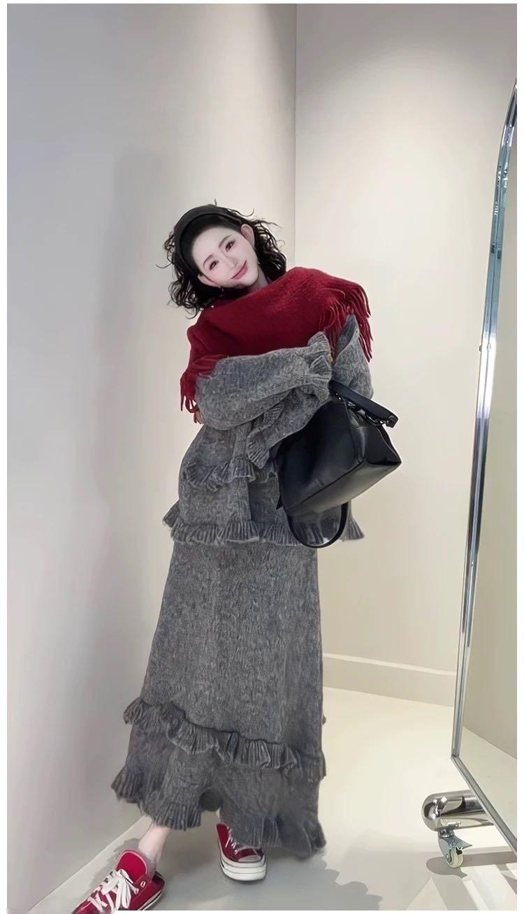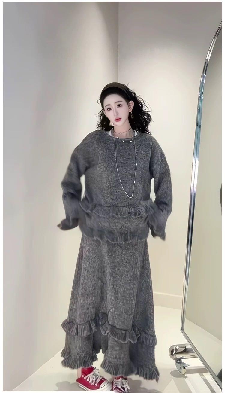 Conjunto de suéter y falda de punto con diseño de volantes de estilo dulce francés para mujer, vestido largo de moda de dos piezas para otoño e invierno 1163