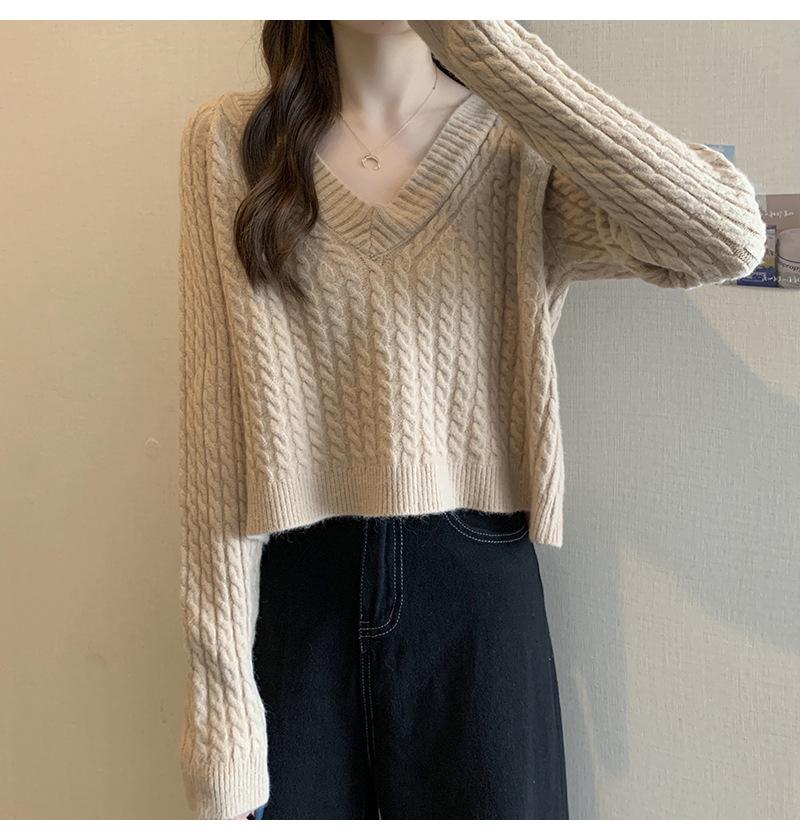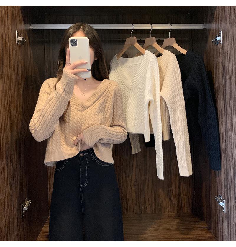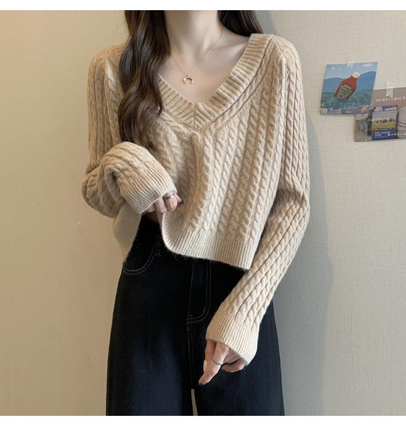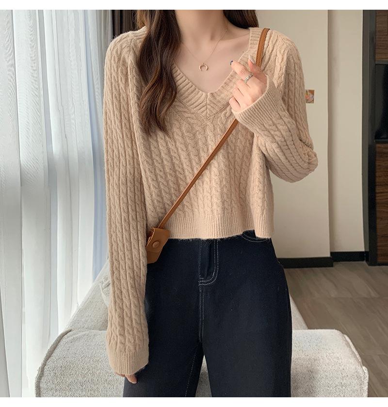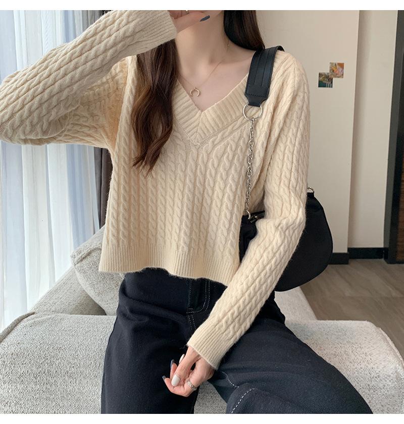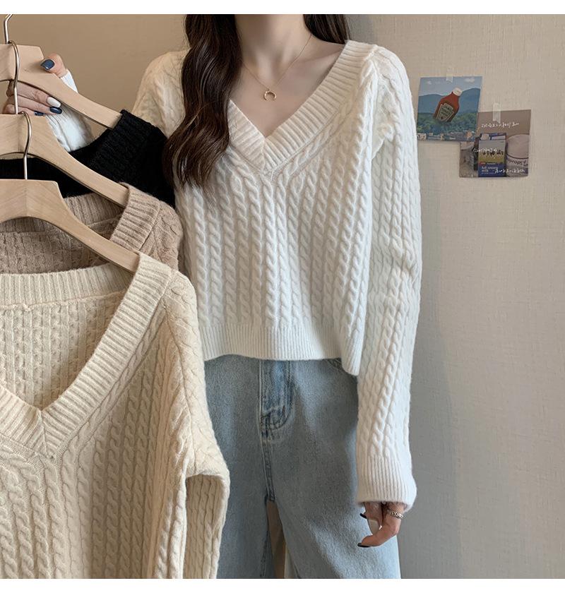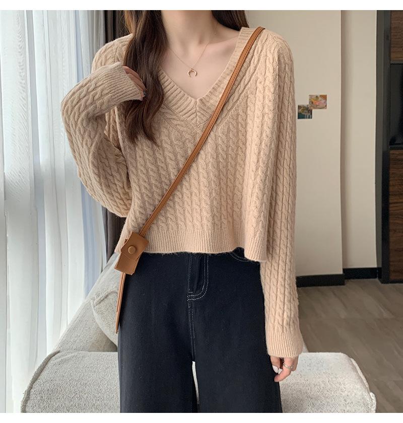 Suéter de cuello en V para mujer sentido del diseño otoño e invierno corto estilo perezoso suéter suelto tejido de punto trenzado ropa exterior