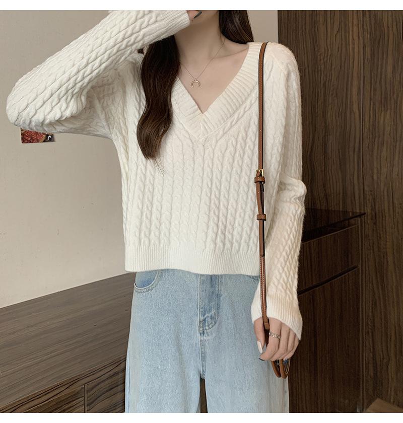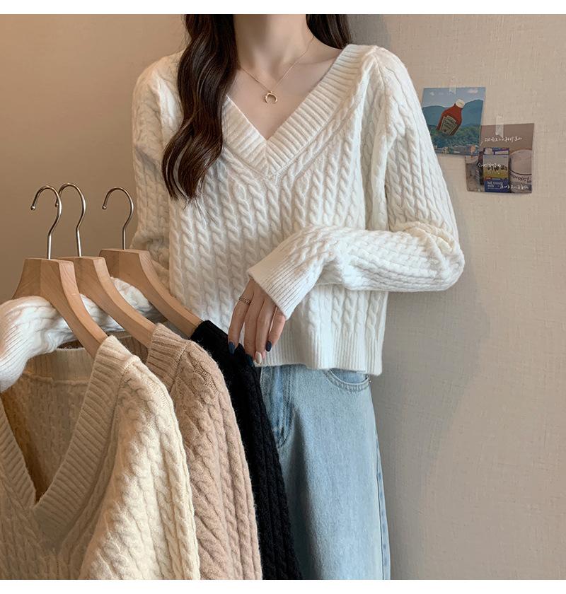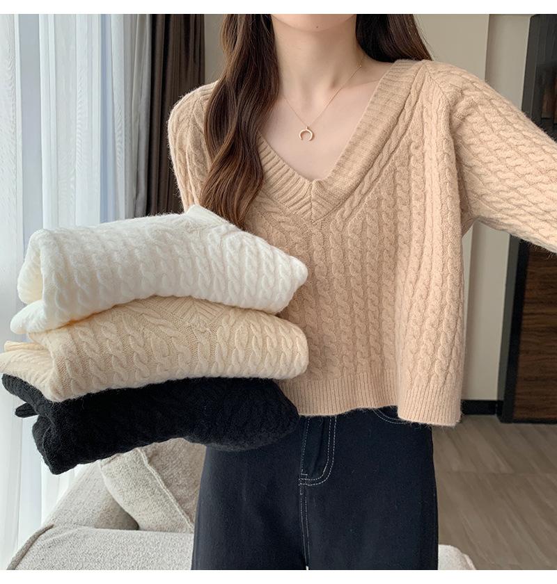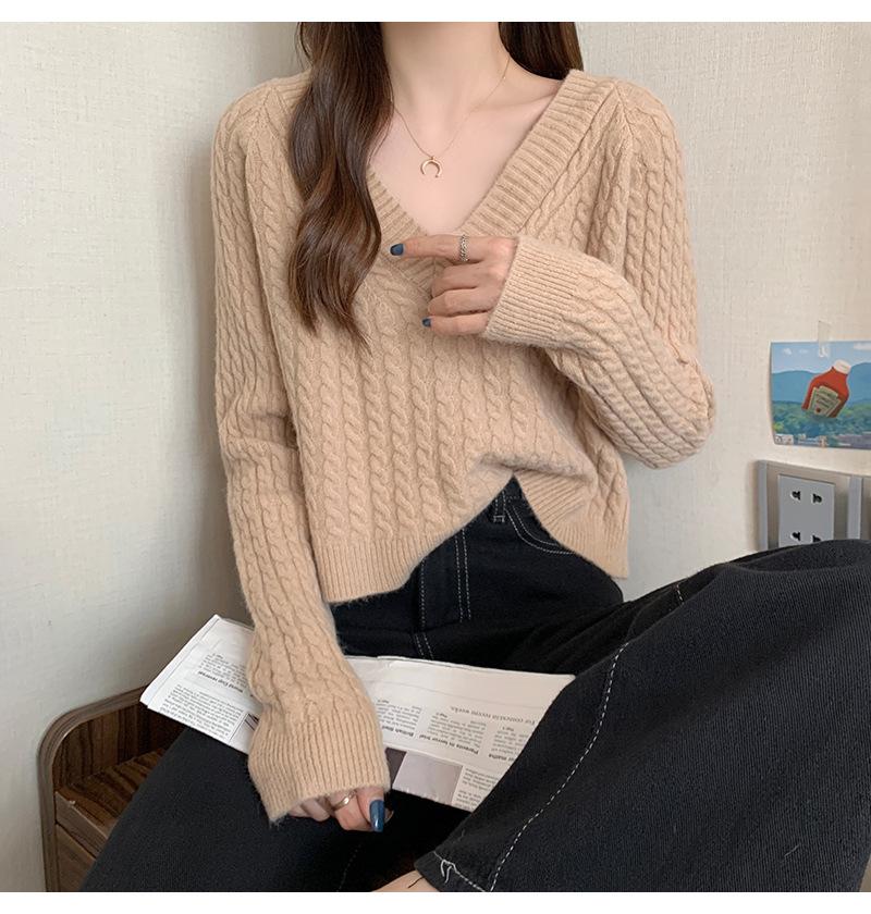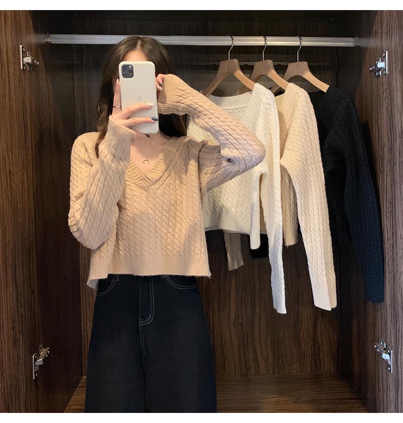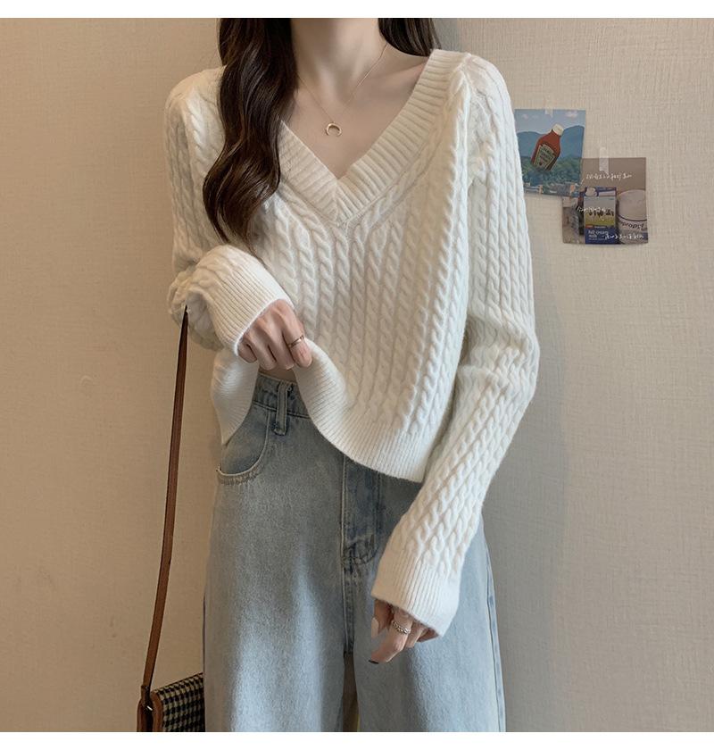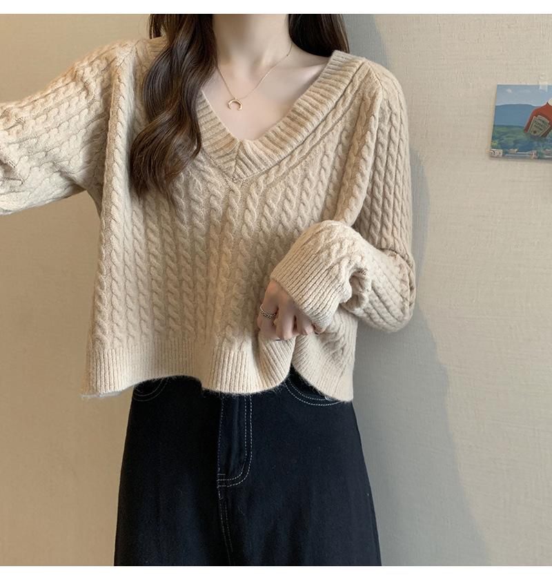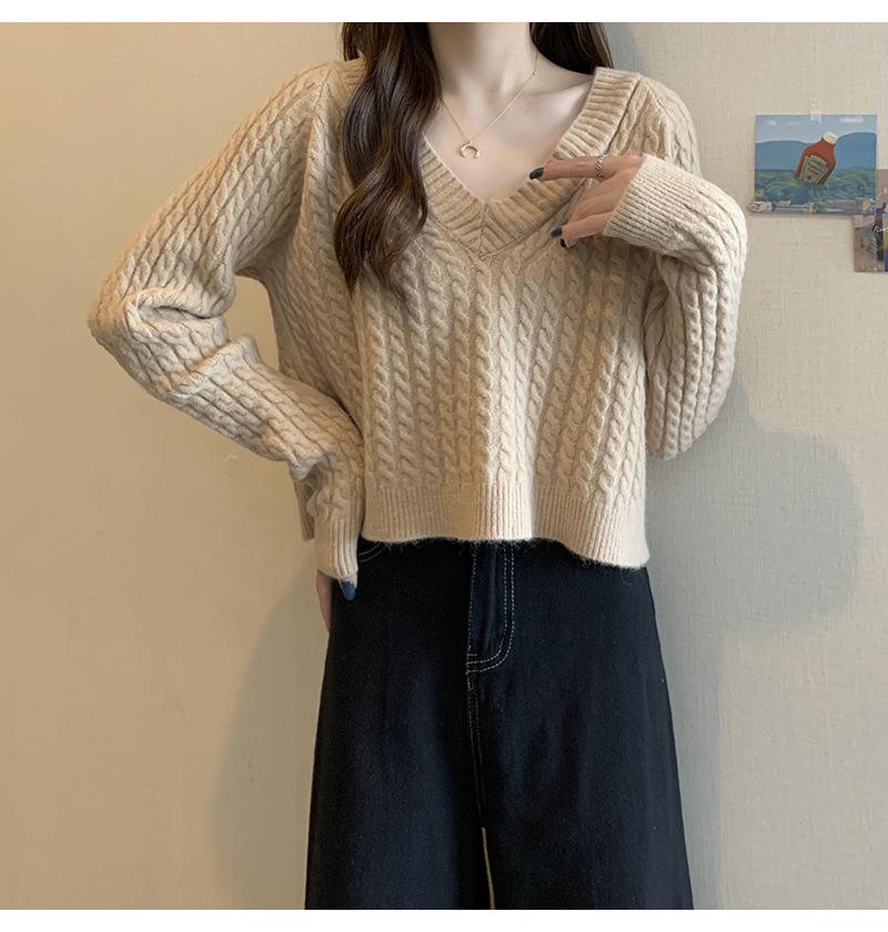 Suéter de cuello en V para mujer sentido del diseño otoño e invierno corto estilo perezoso suéter suelto tejido de punto trenzado ropa exterior