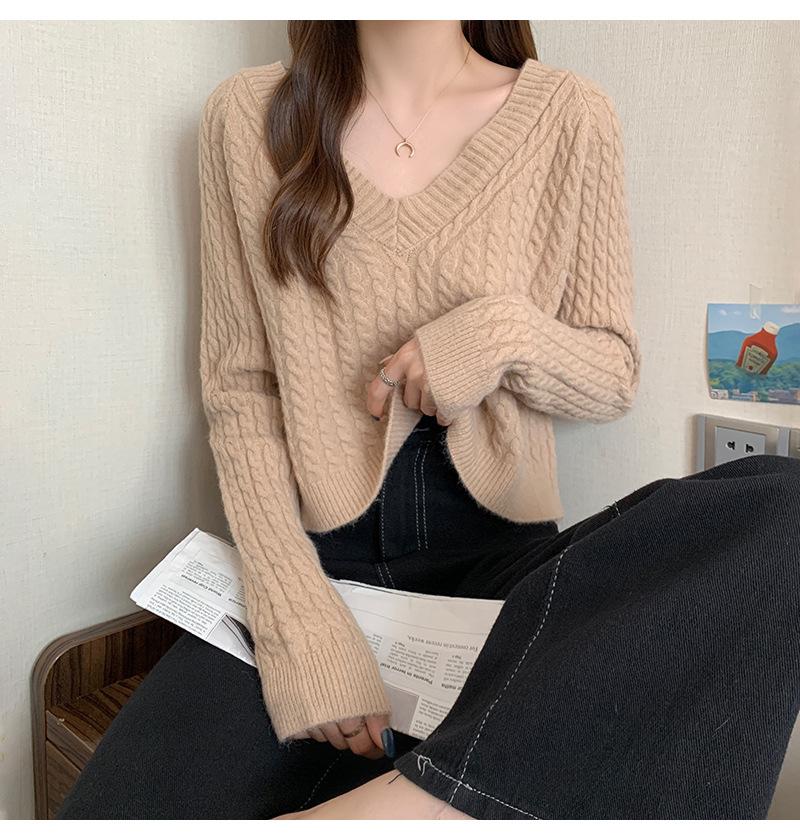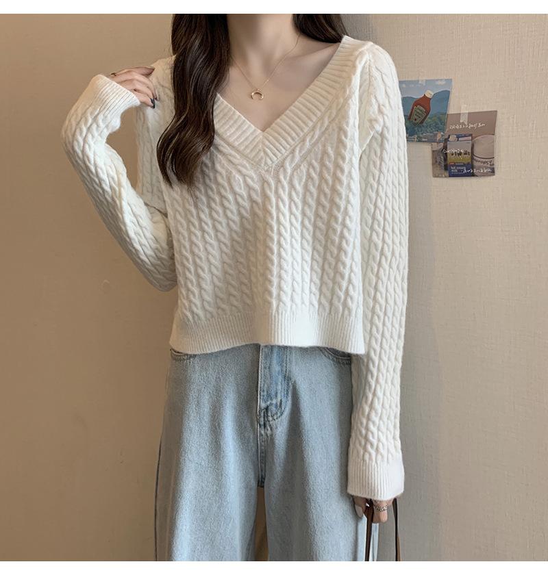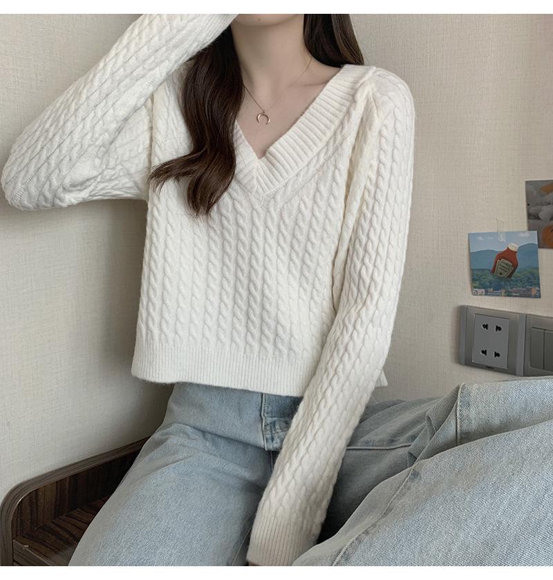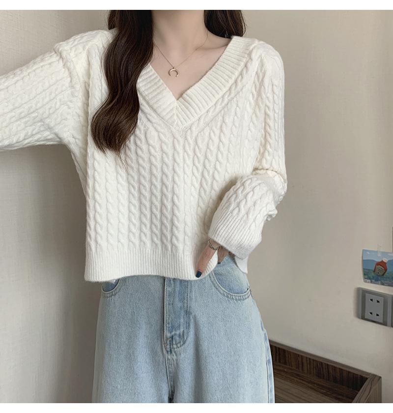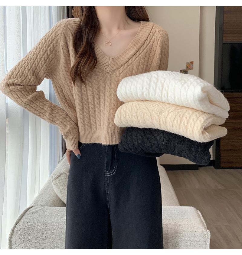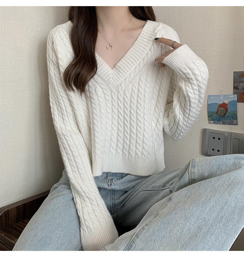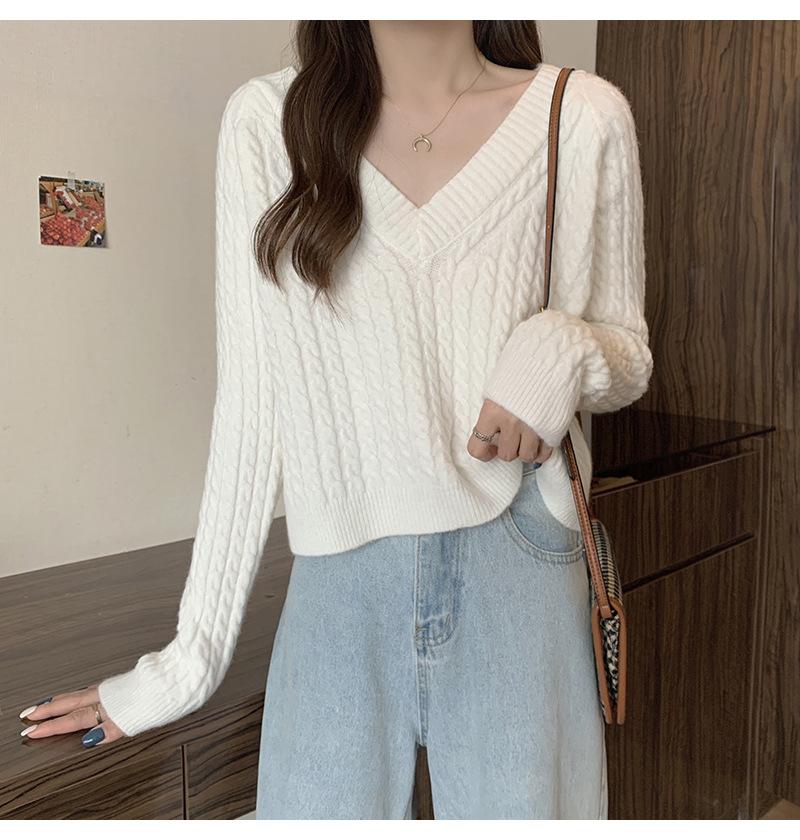 Suéter de cuello en V para mujer sentido del diseño otoño e invierno corto estilo perezoso suéter suelto tejido de punto trenzado ropa exterior