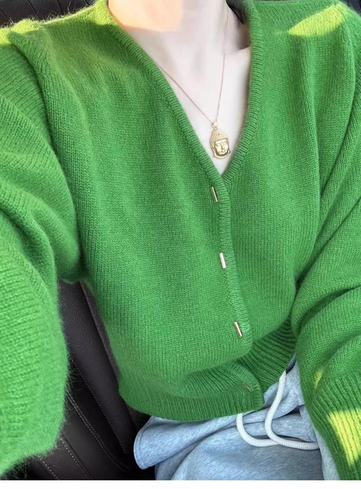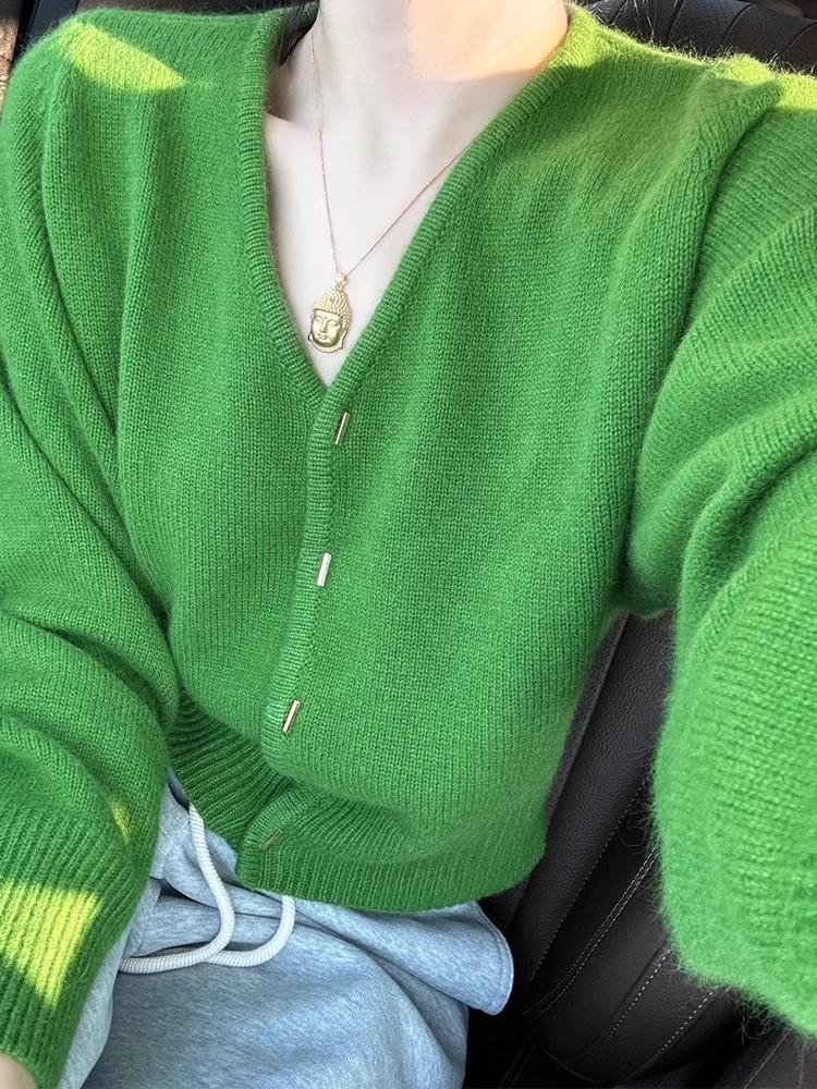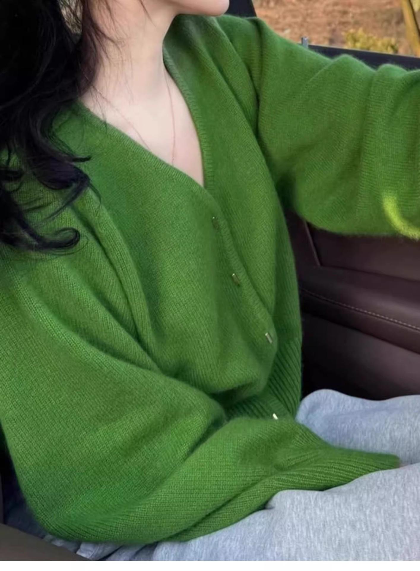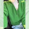 Nuevo Top de Otoño e Invierno para Mujer Chic Único Terciopelo de Mapache Verde Cuello en V Cárdigan Tejido Ropa Exterior Suéter Petite