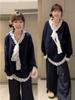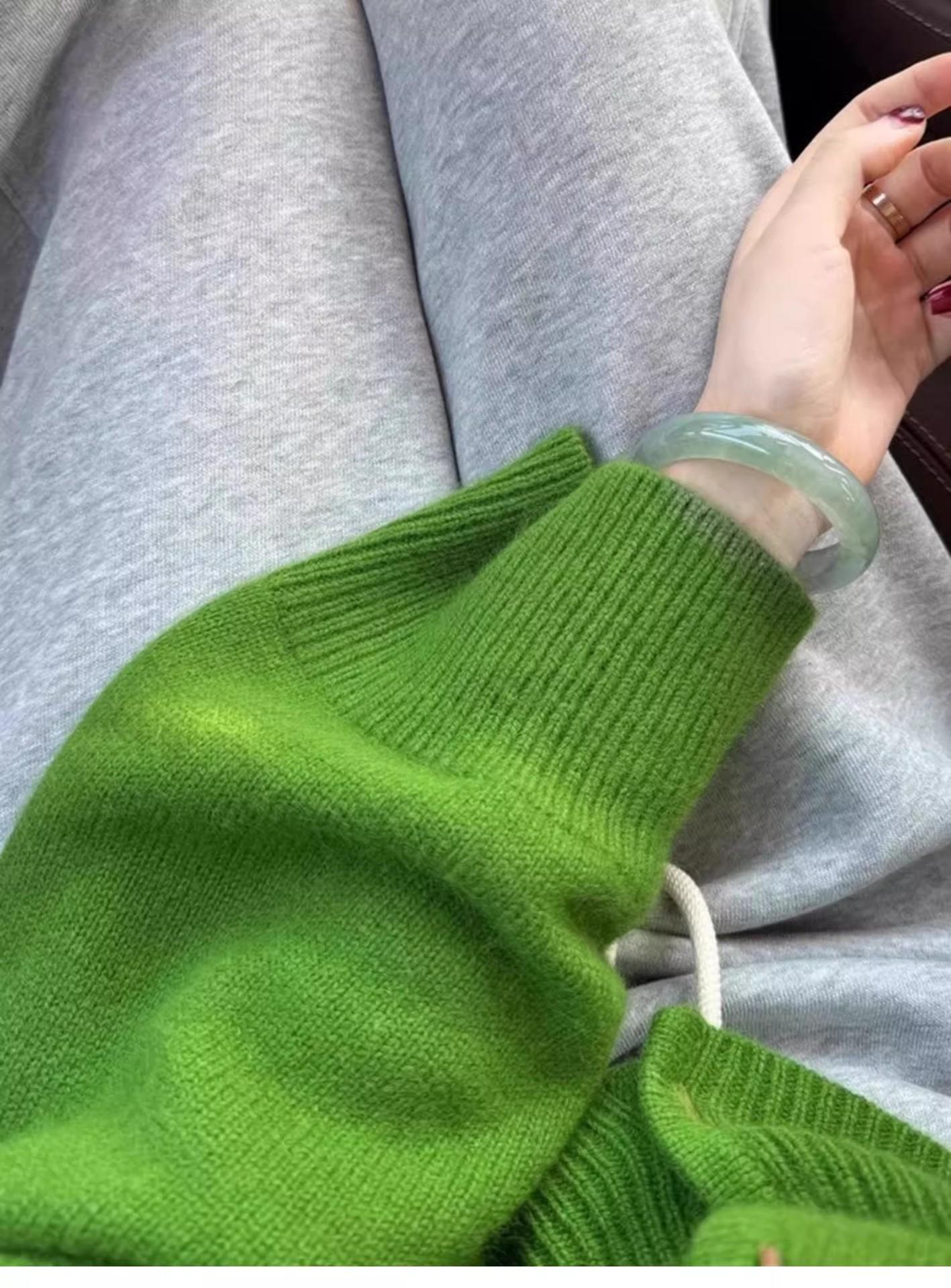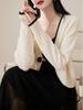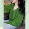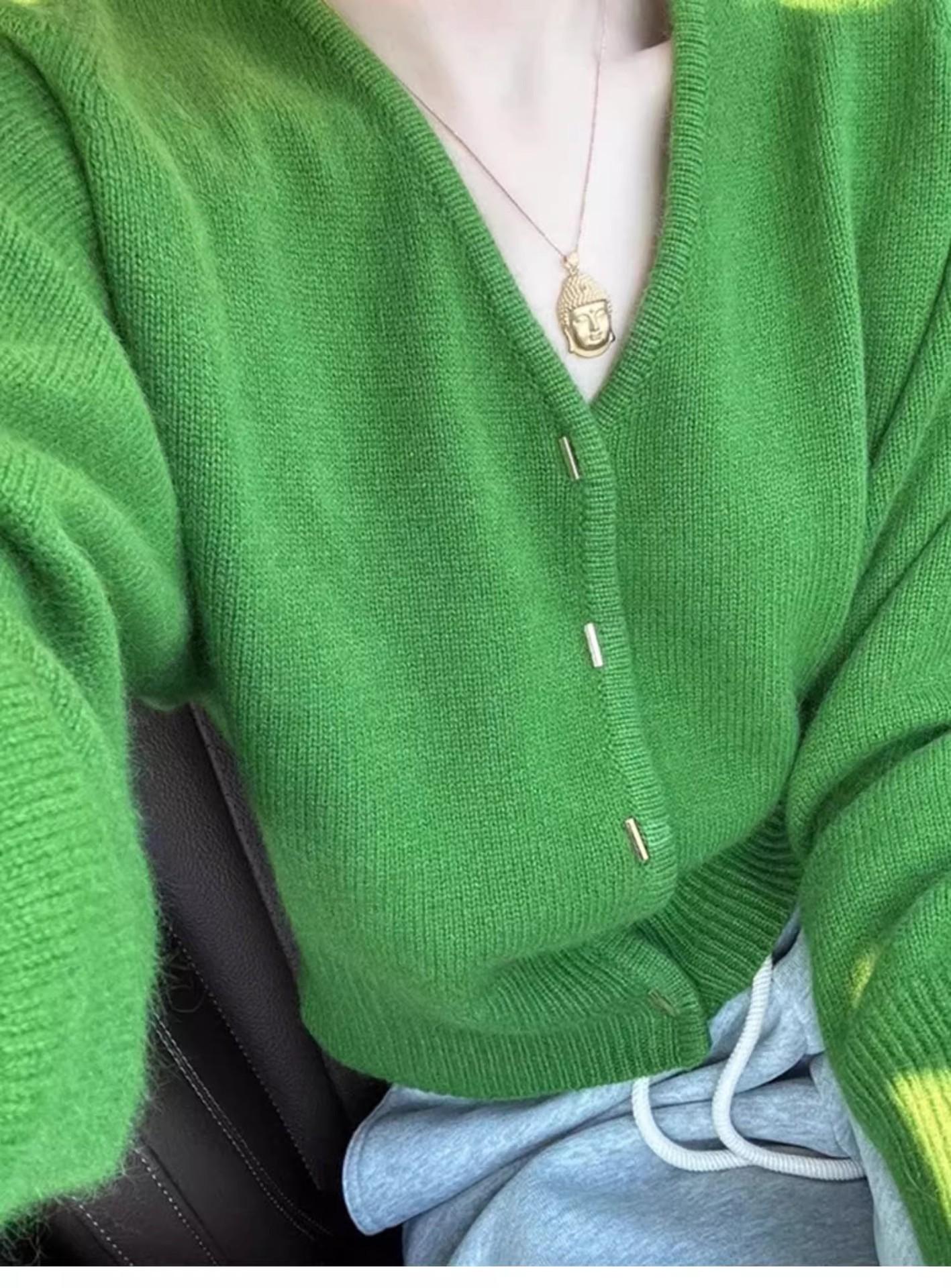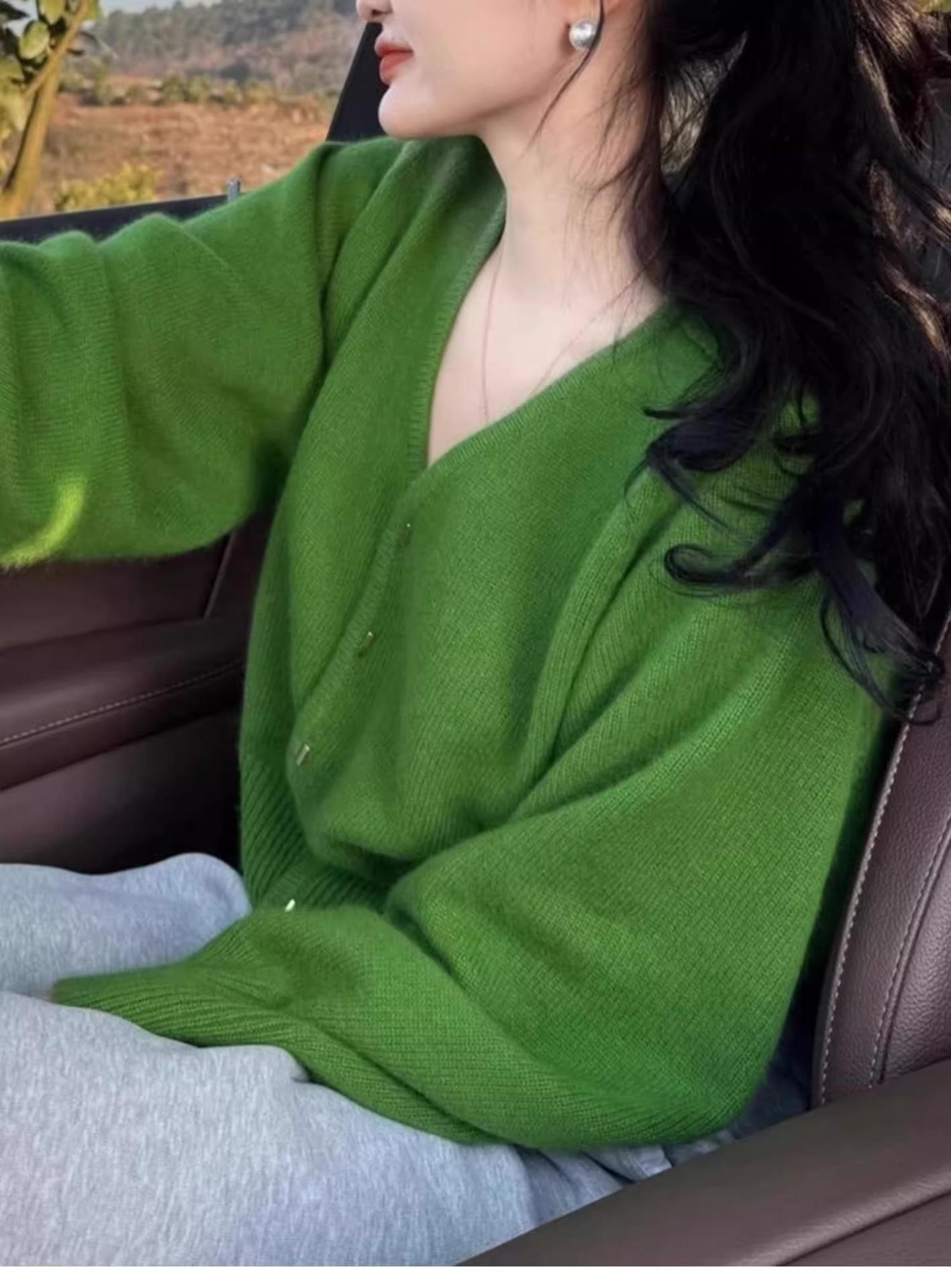 Nuevo Top de Otoño e Invierno para Mujer Chic Único Terciopelo de Mapache Verde Cuello en V Cárdigan Tejido Ropa Exterior Suéter Petite