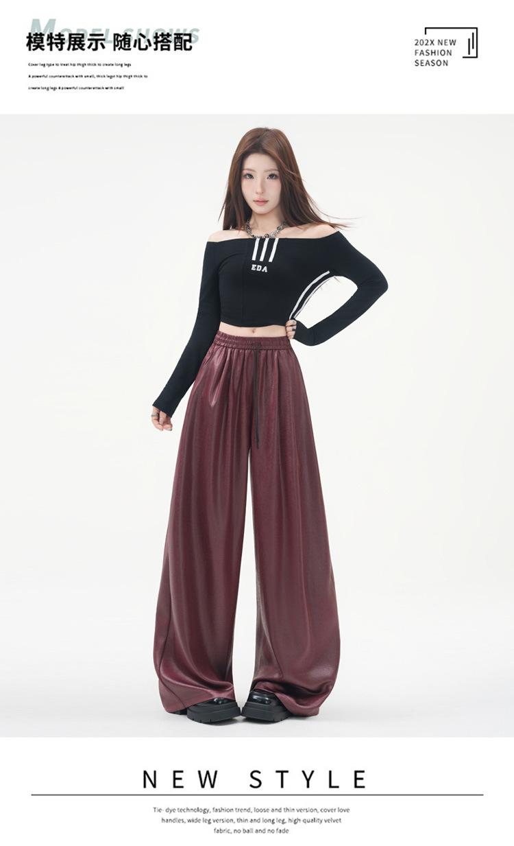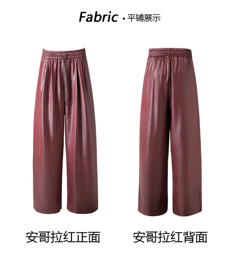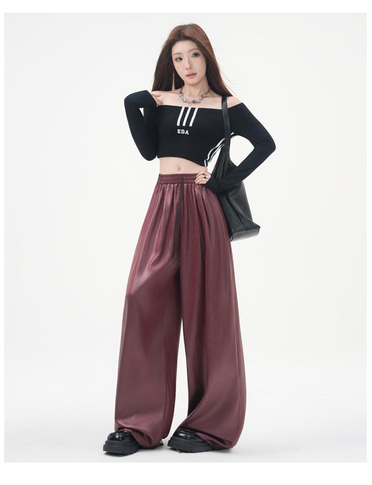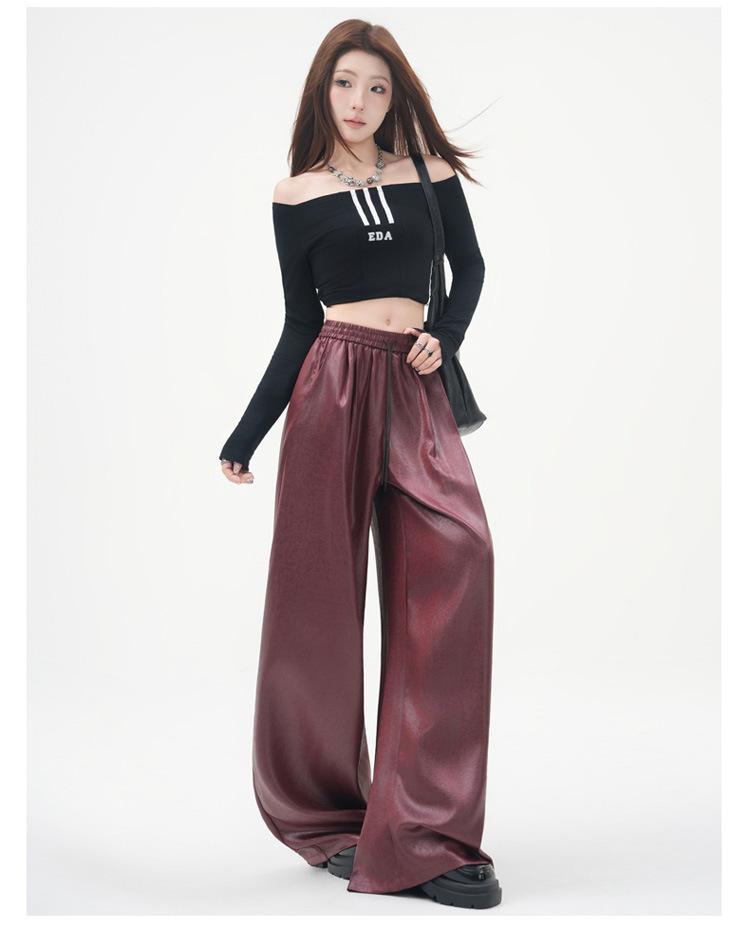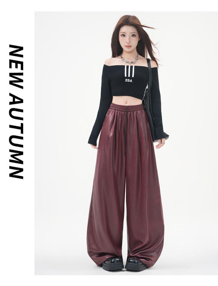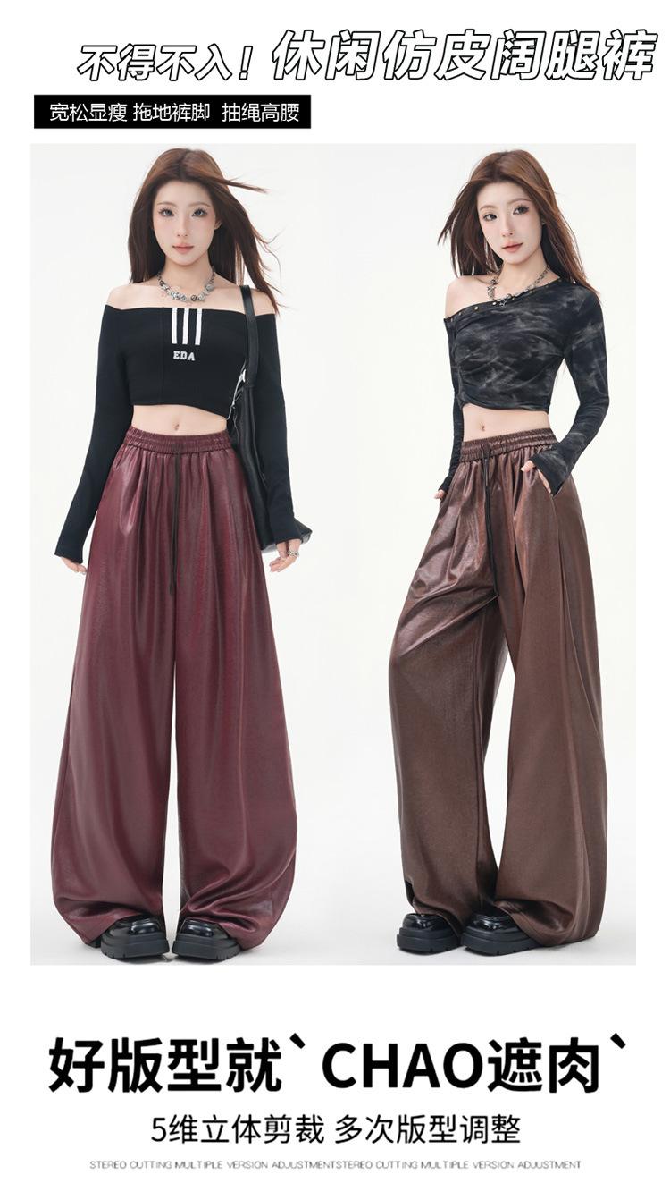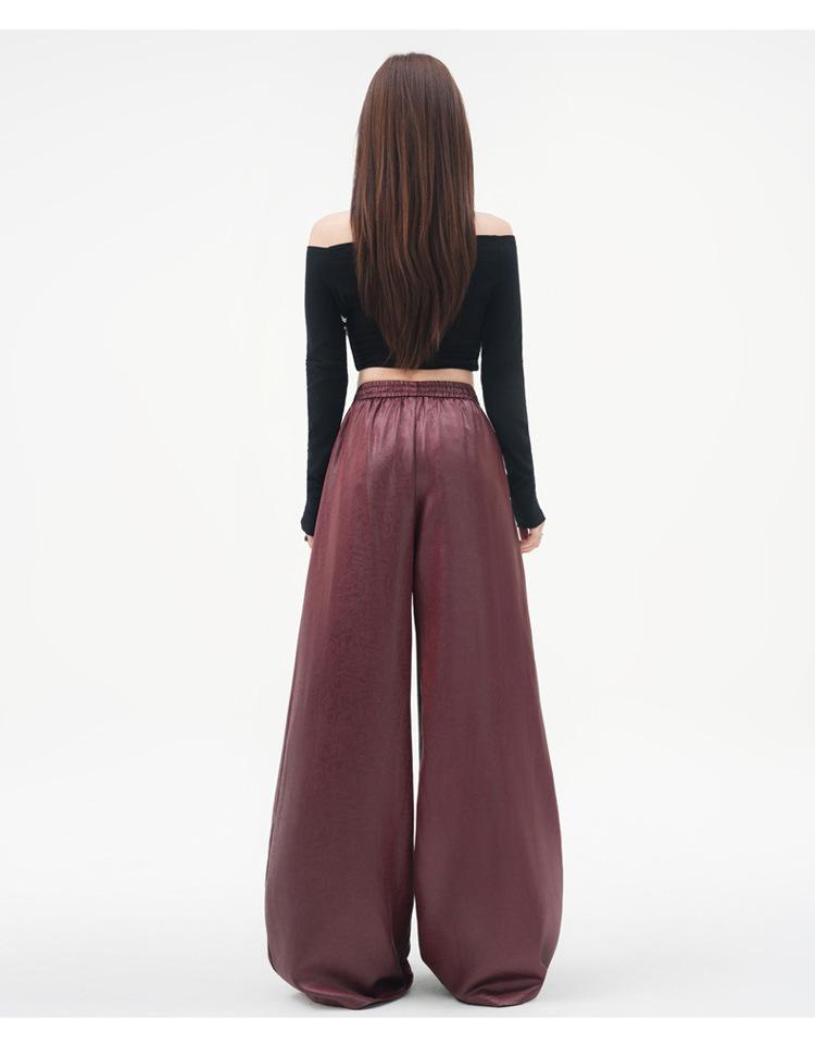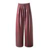 Otoño/Invierno 2025 Nuevo Pantalón de Pierna Recta Ancha con Cintura Elástica Pantalón Casual para Mujer Tejido de Imitación de Cuero Rojo Ancola
