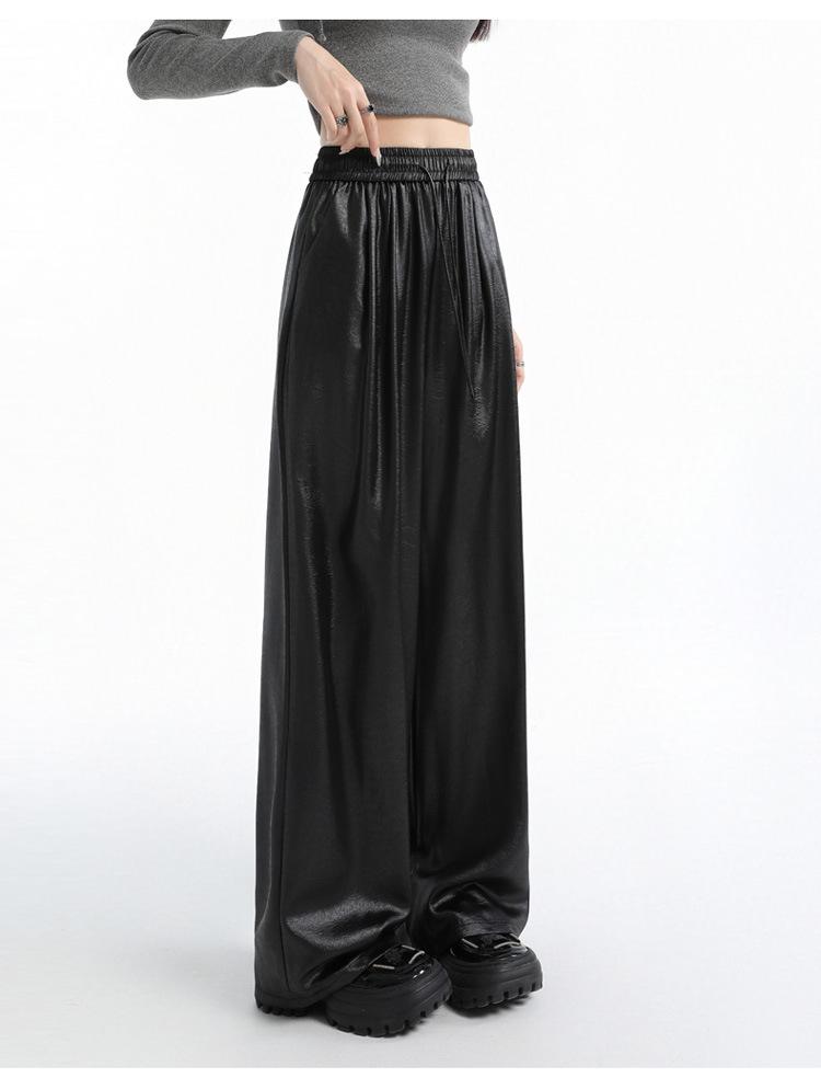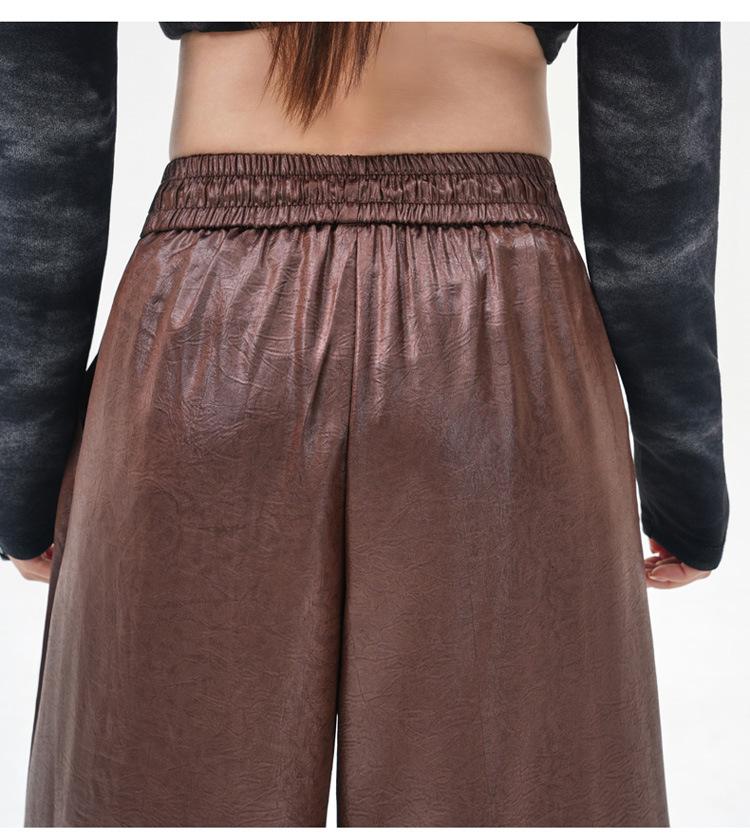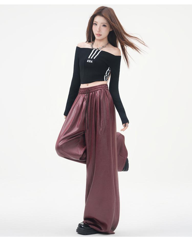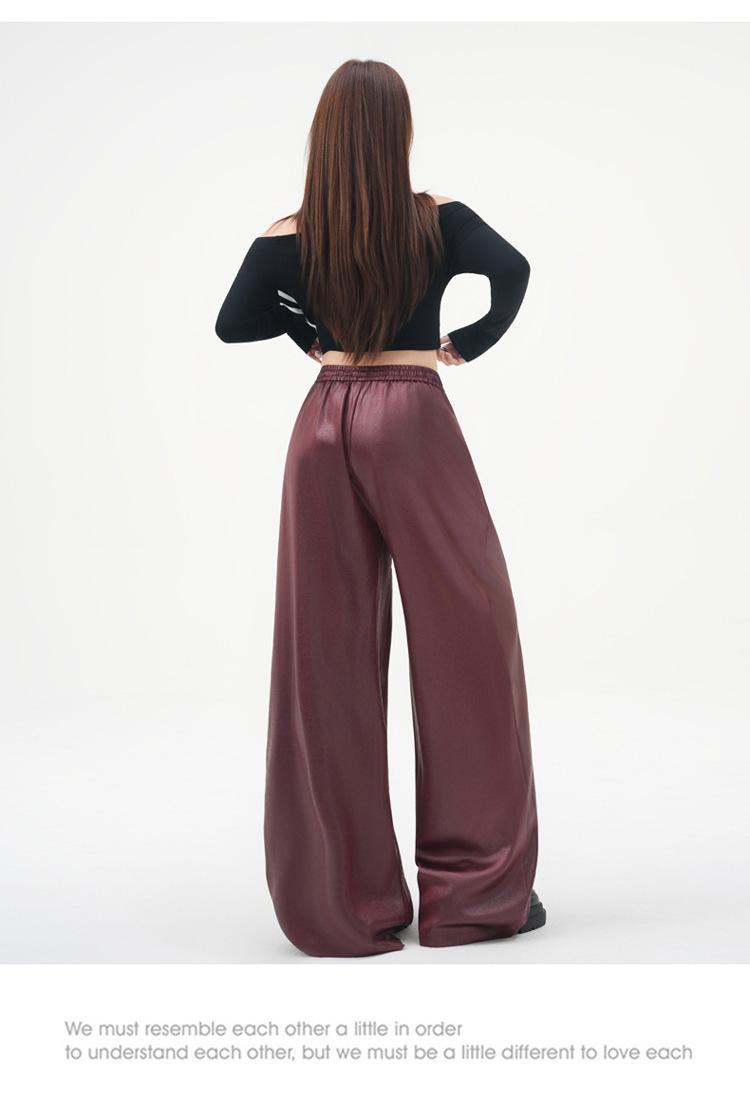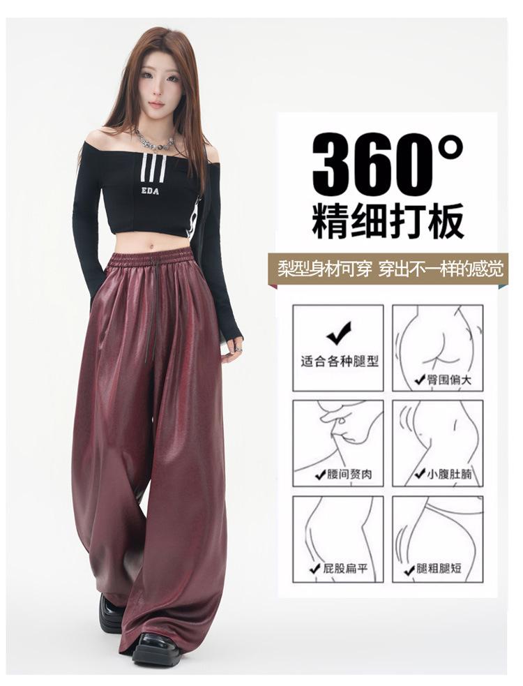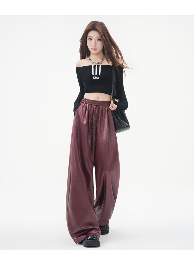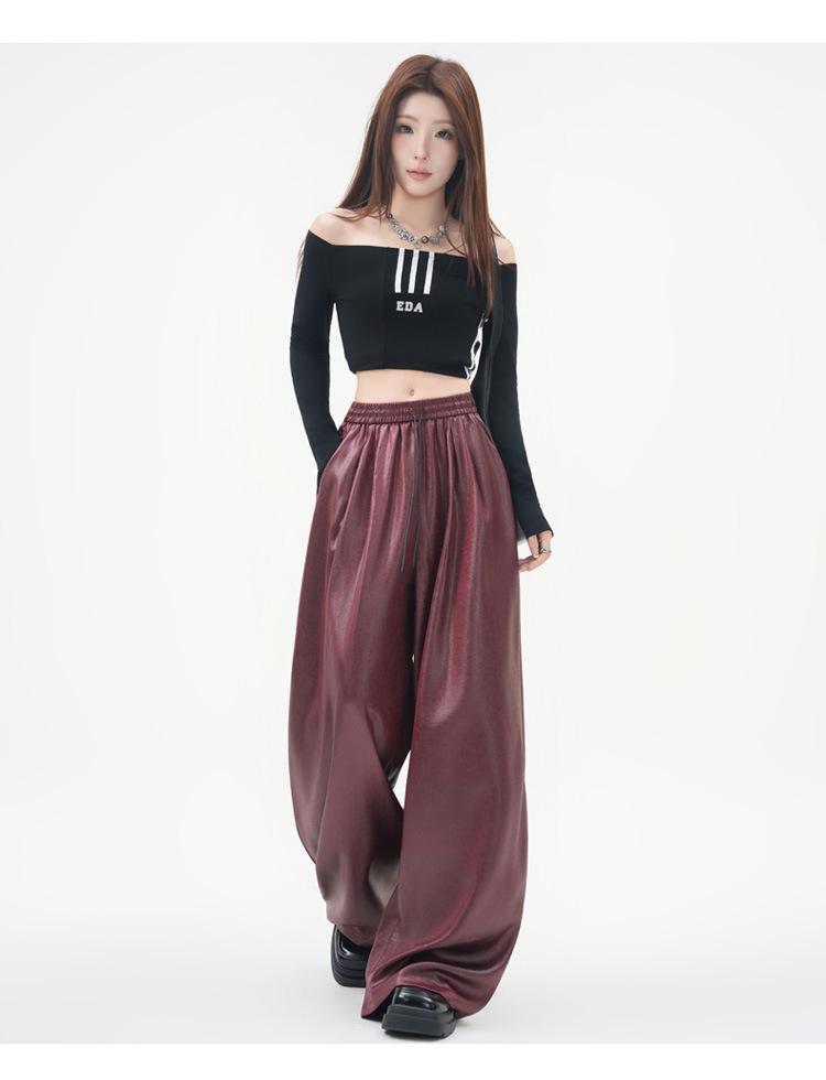 Otoño/Invierno 2025 Nuevo Pantalón de Pierna Recta Ancha con Cintura Elástica Pantalón Casual para Mujer Tejido de Imitación de Cuero Rojo Ancola