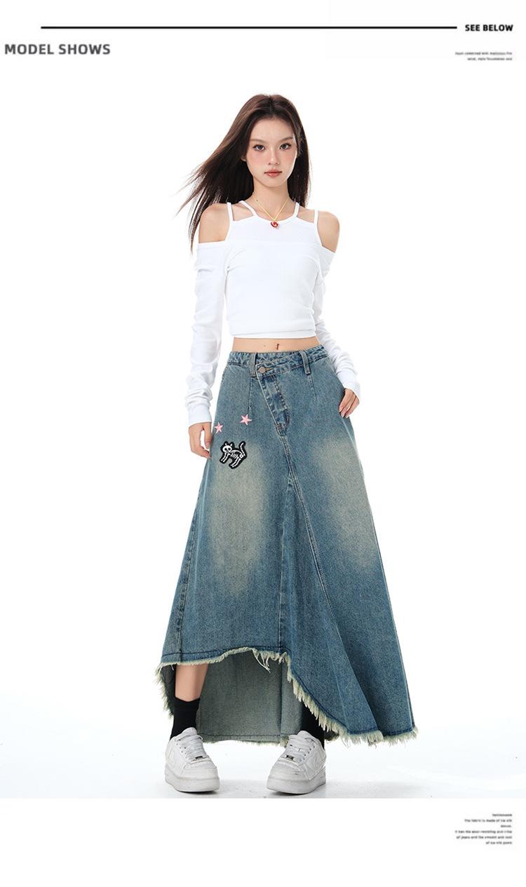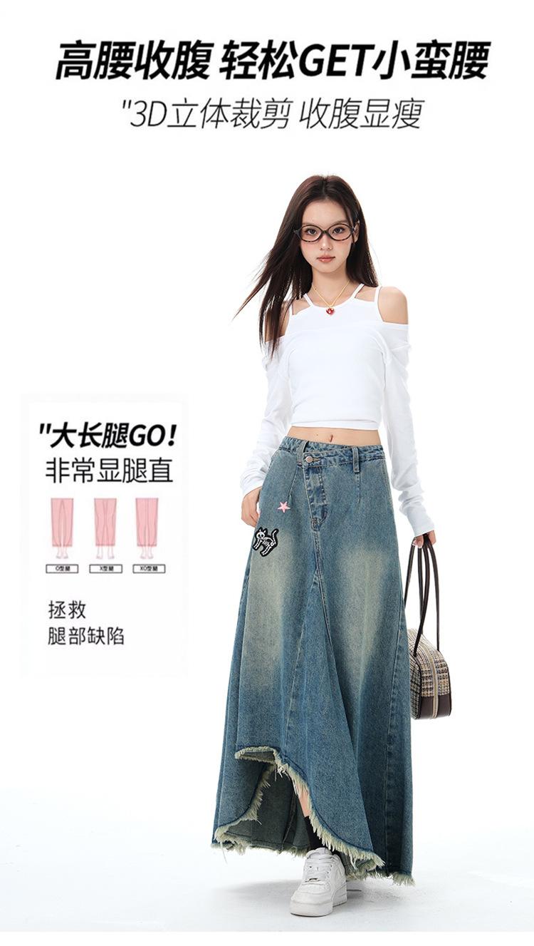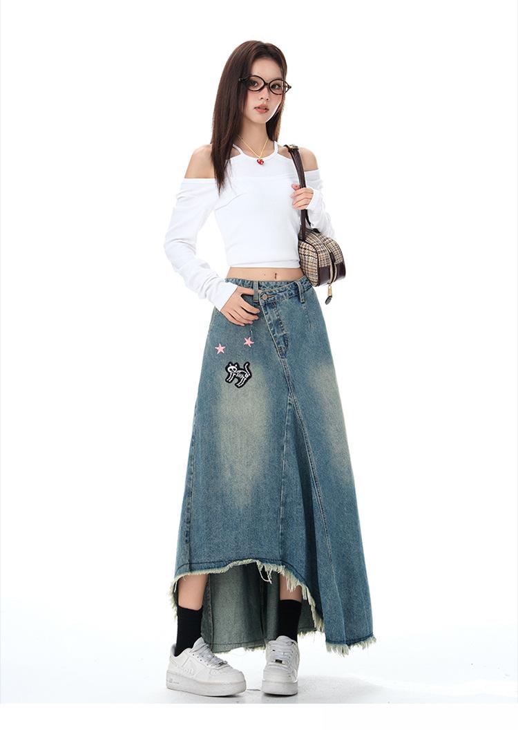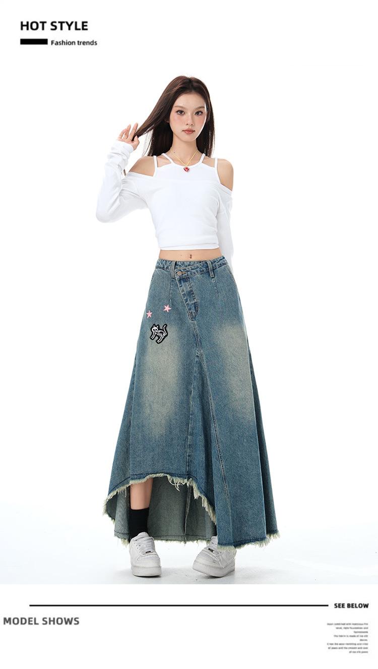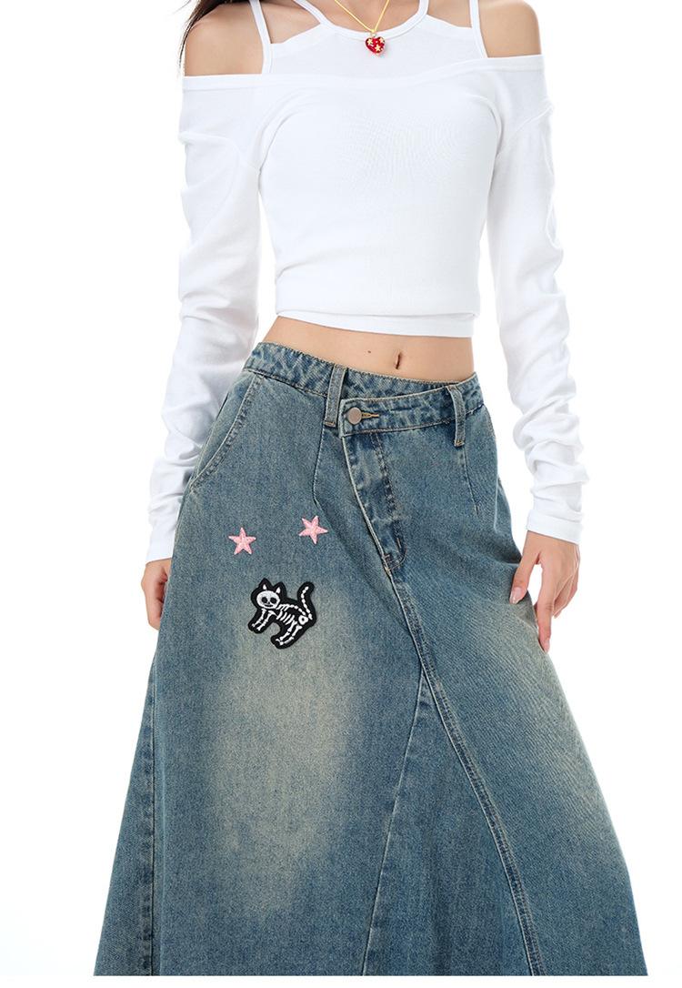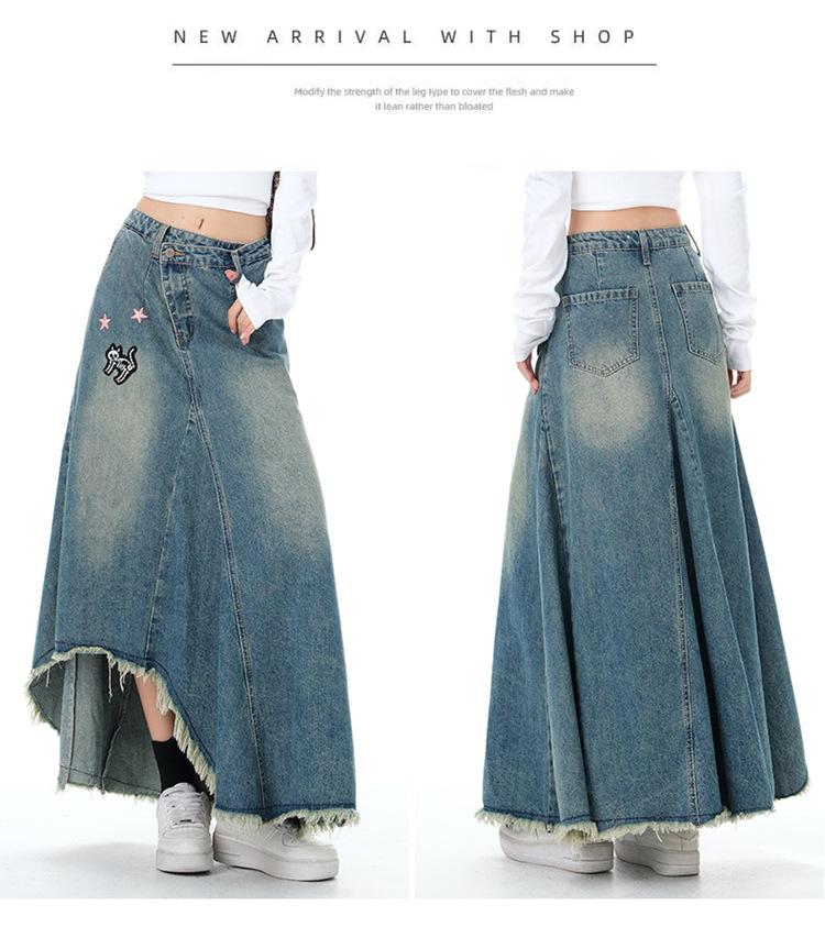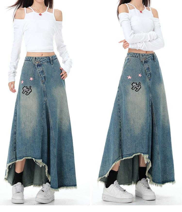 Chizhi#Falda Midi de Mezclilla con Diseño Irregular de Gato Estrella de Cinco Puntas para Mujer Cintura Alta Adelgazante Moda Versátil Línea A Falda Larga