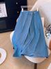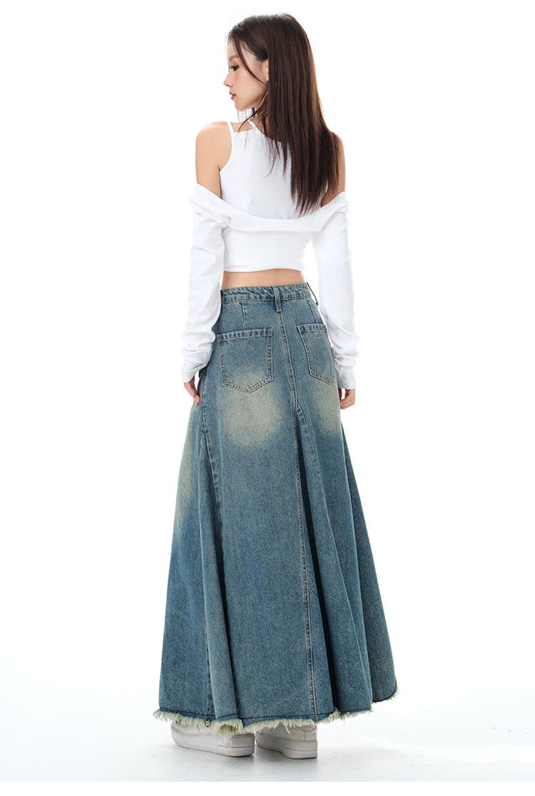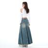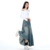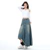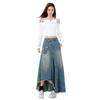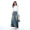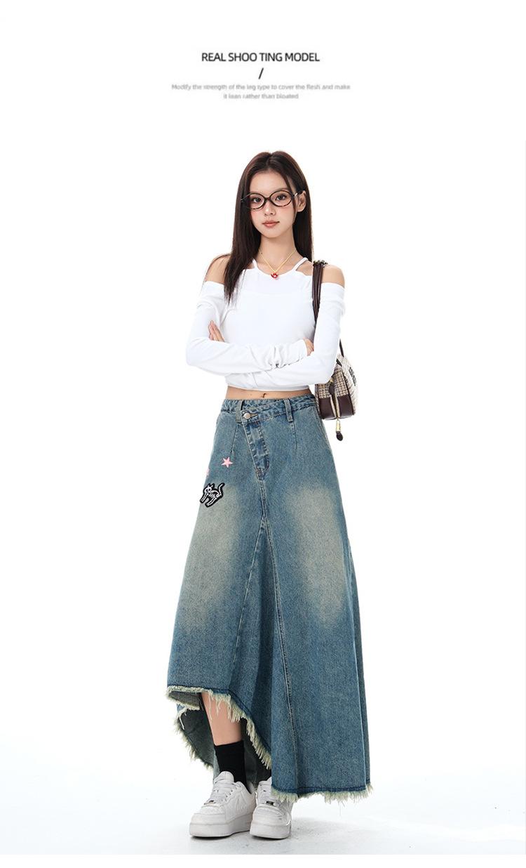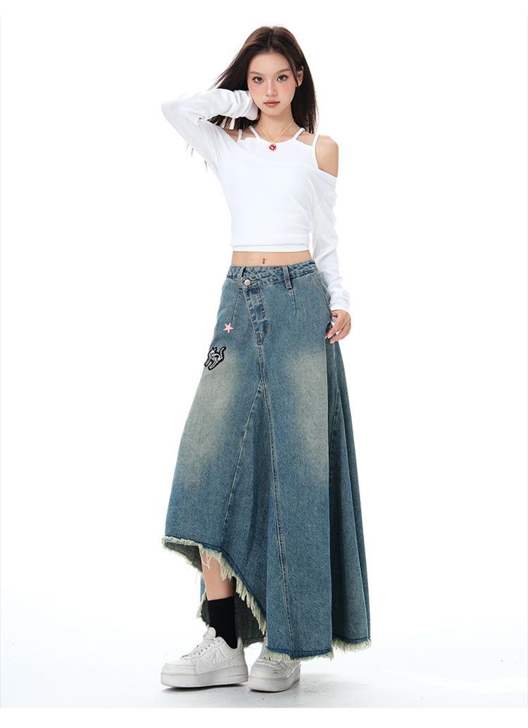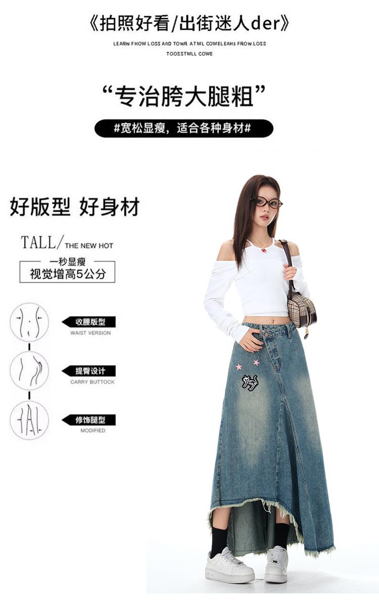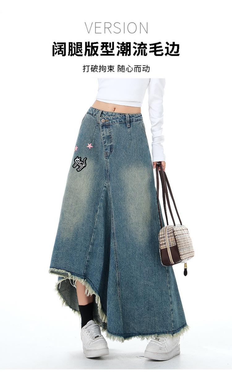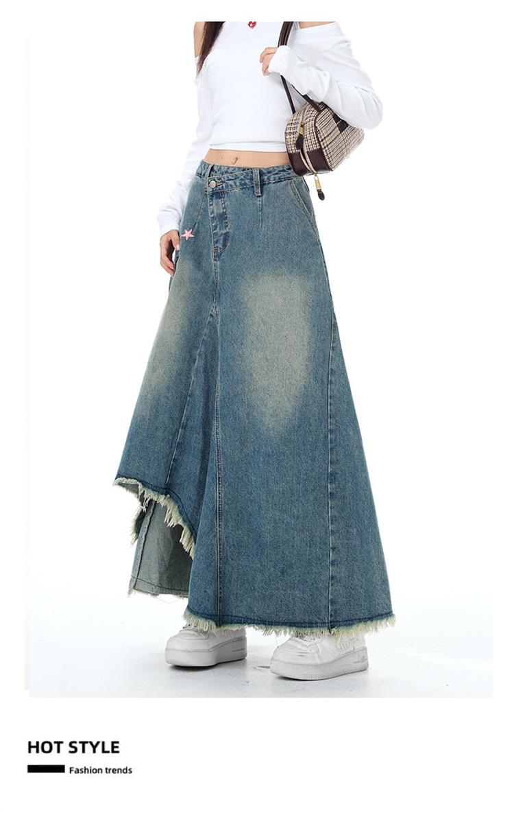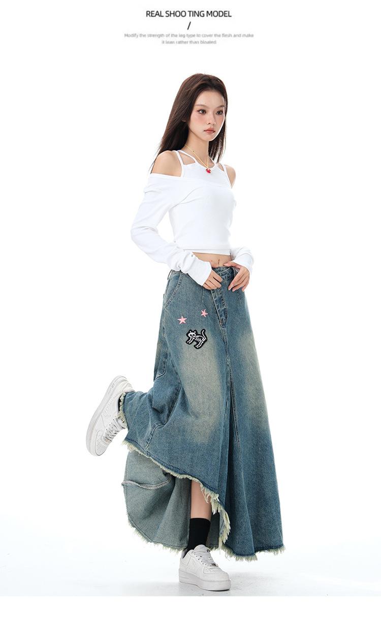 Chizhi#Falda Midi de Mezclilla con Diseño Irregular de Gato Estrella de Cinco Puntas para Mujer Cintura Alta Adelgazante Moda Versátil Línea A Falda Larga