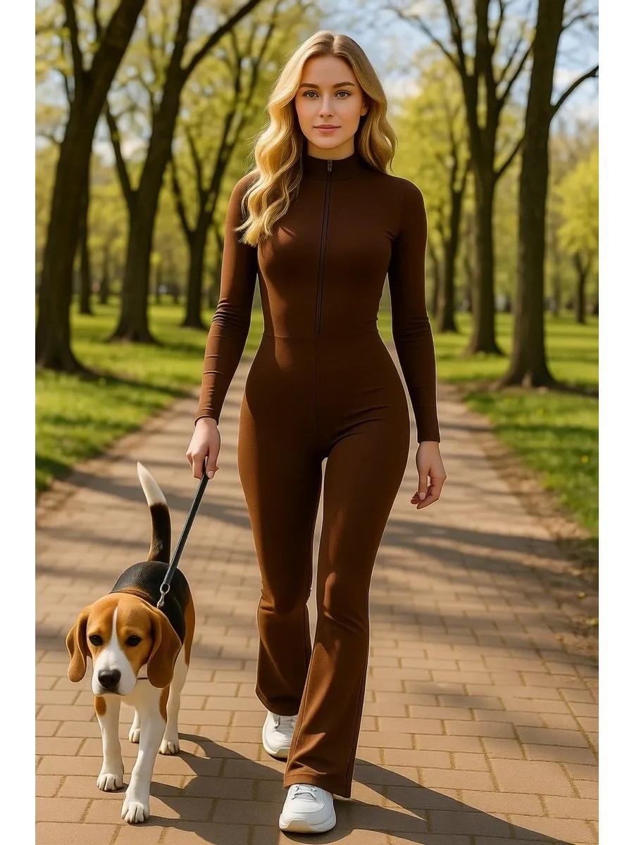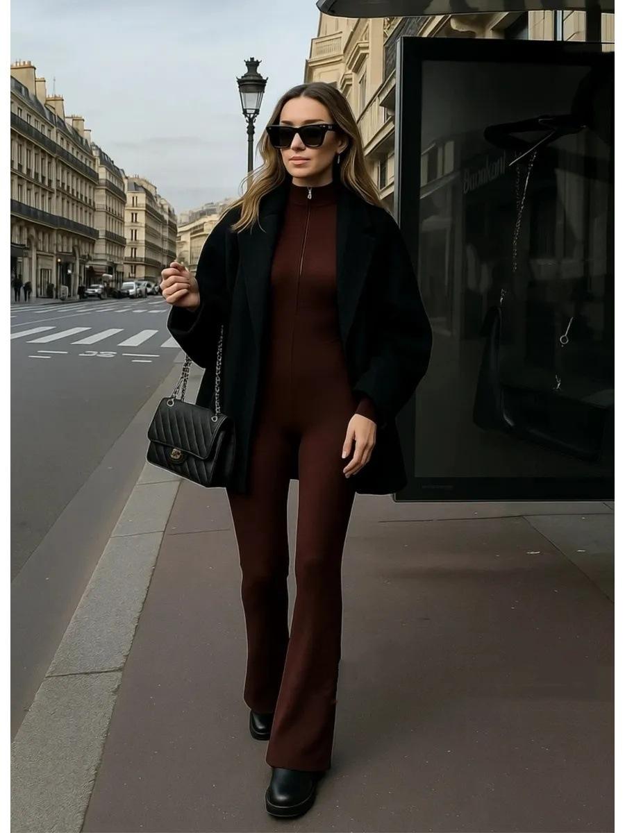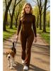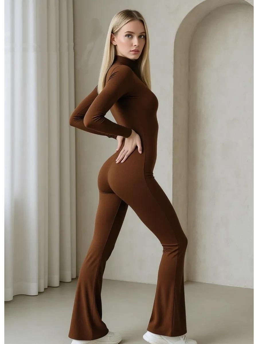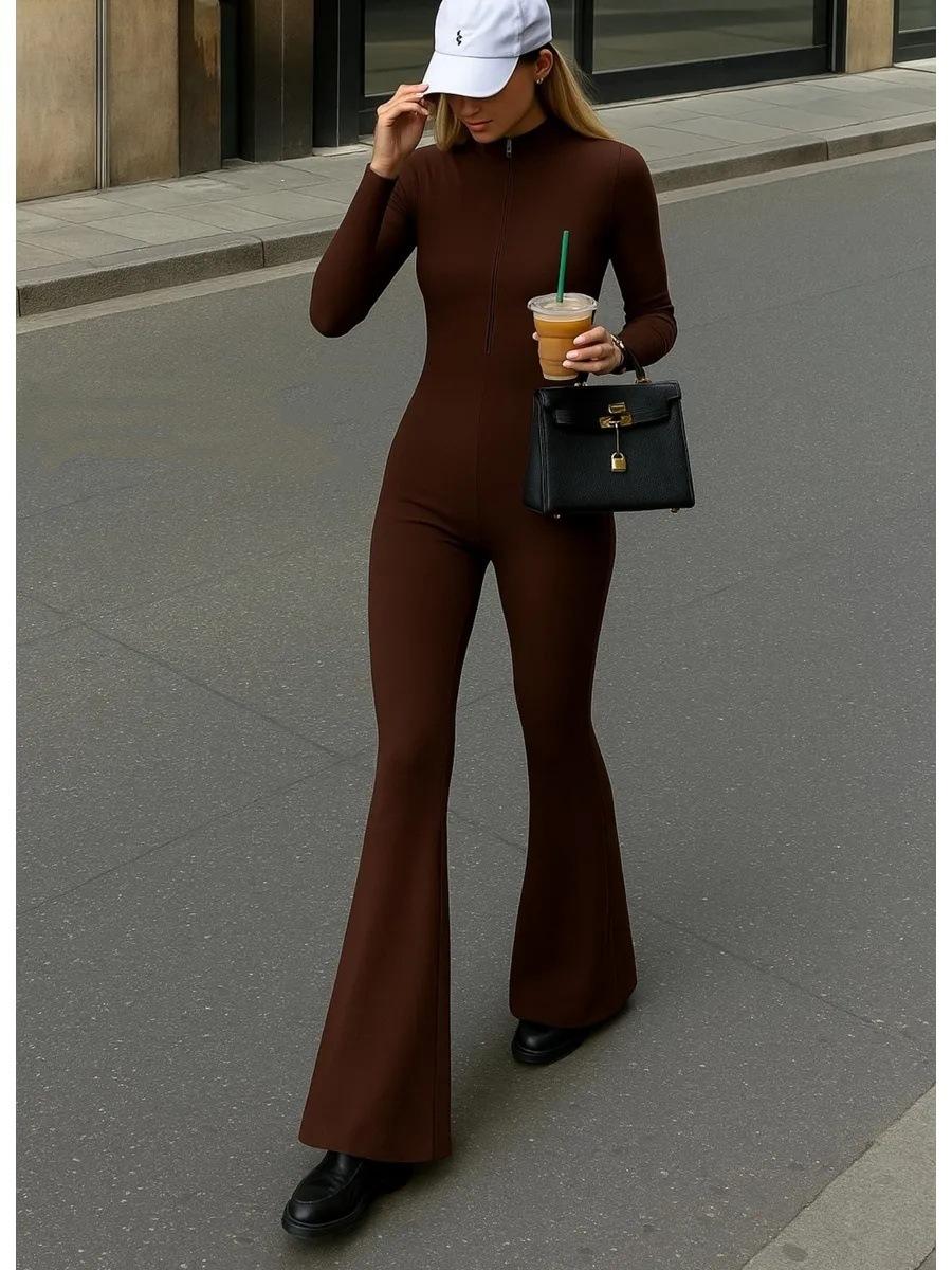 Europeo y americano transfronterizo 2025 nuevo resorte cuello medio manga larga cremallera ajustado sexy ceñido a la cadera acampanado pantalones largos mono