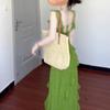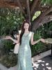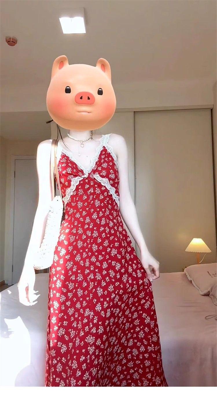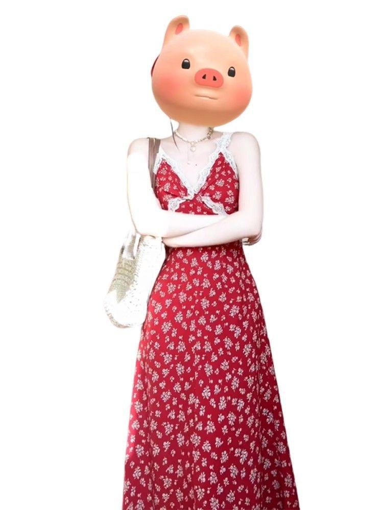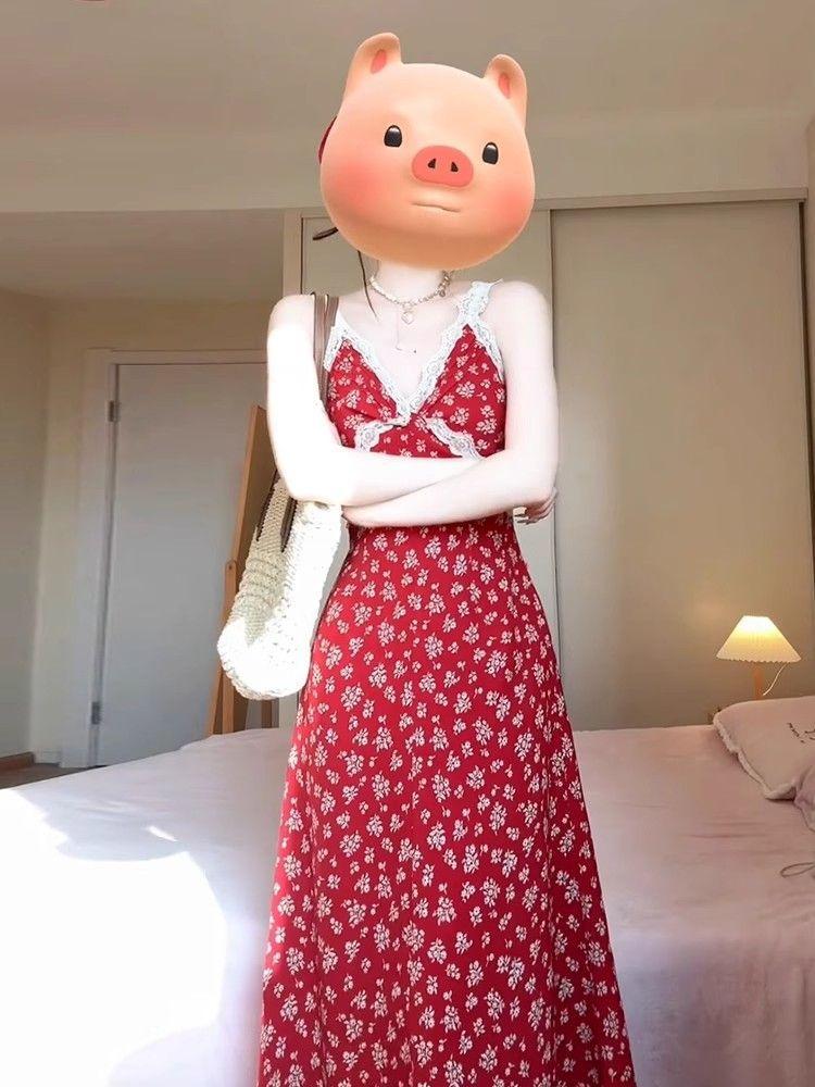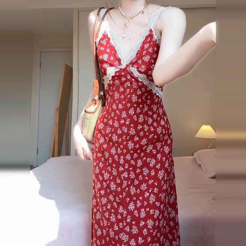 2025 Nuevo Outfit de Primavera Vestido Rojo Floral con Tirantes Espagueti para Mujer Verano Petite Vacaciones en la Playa Vestido Largo