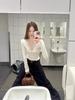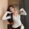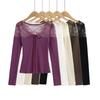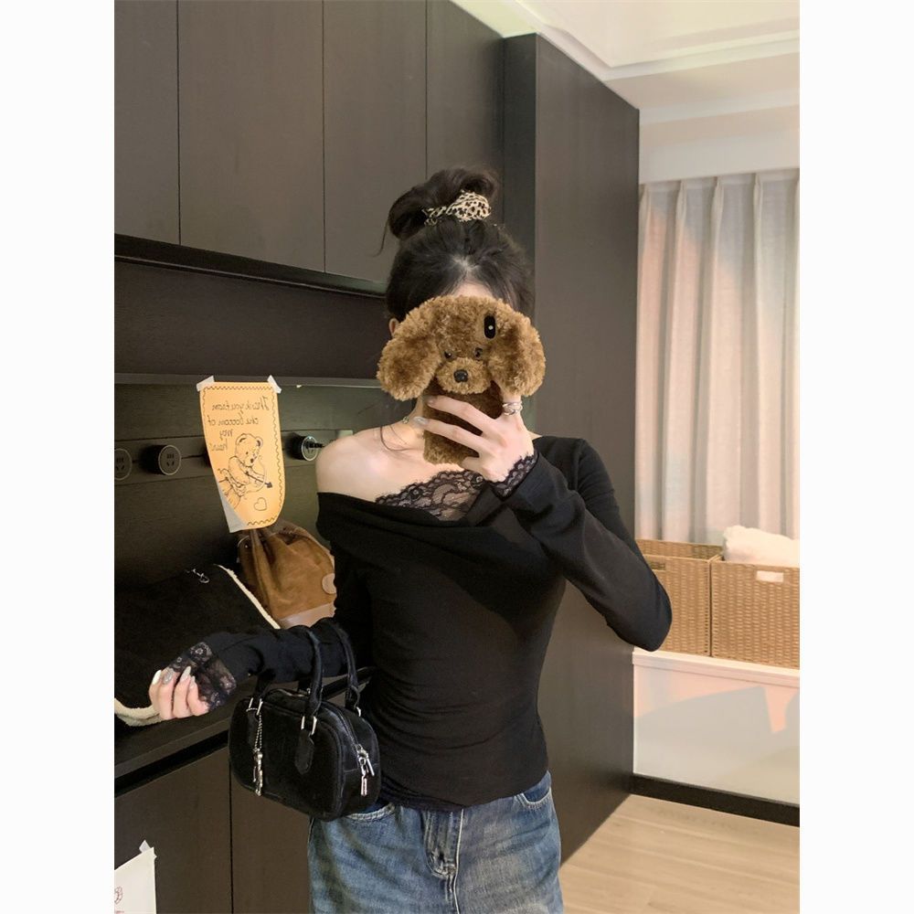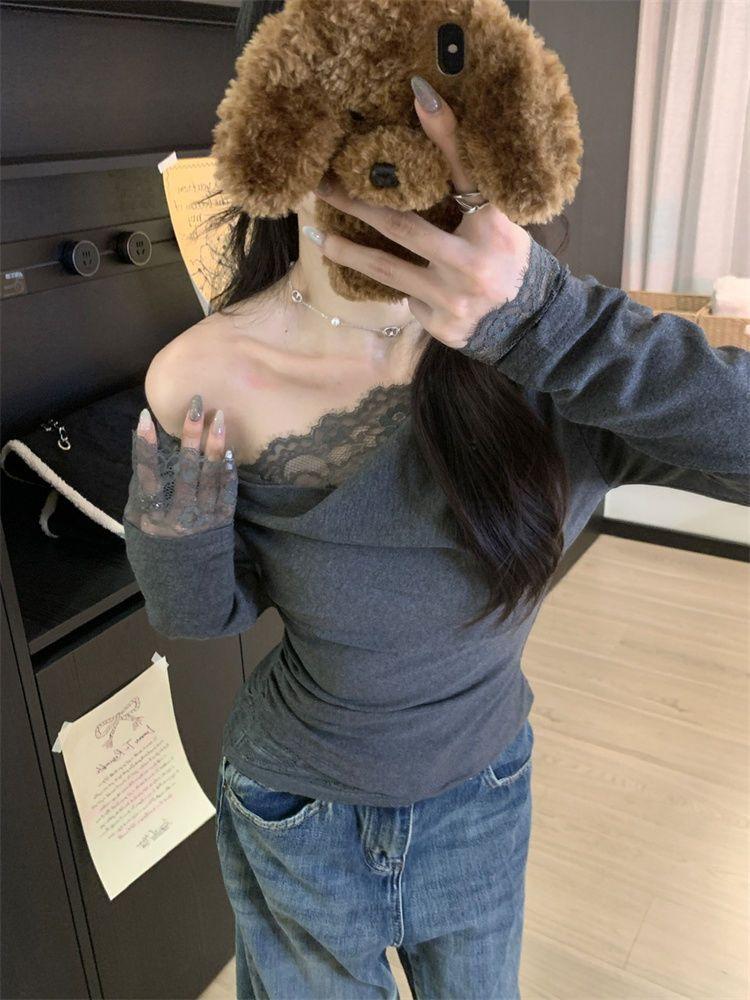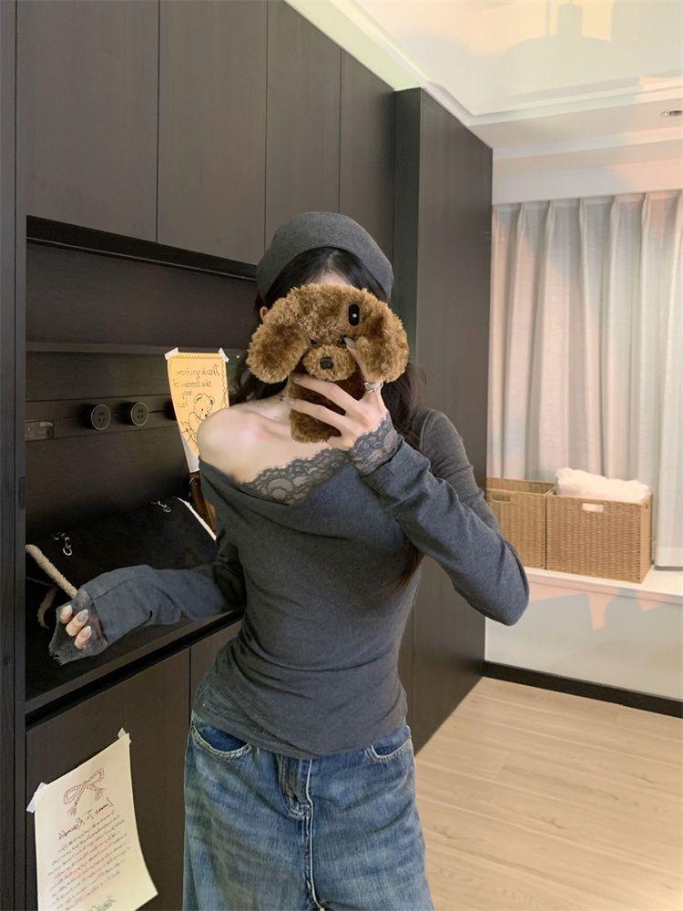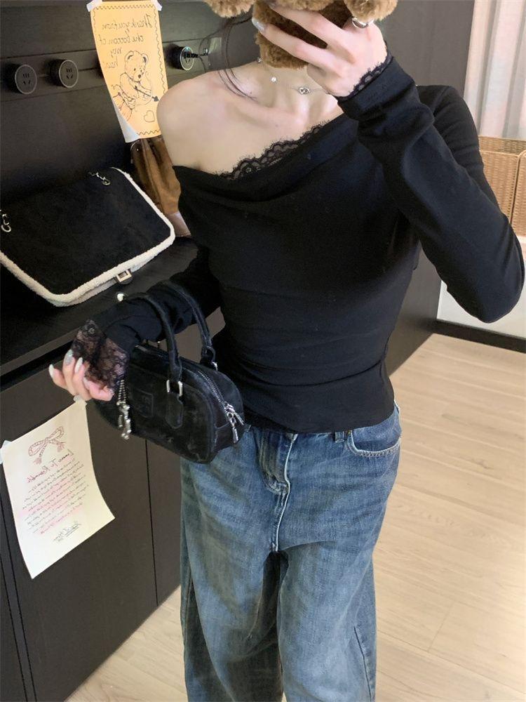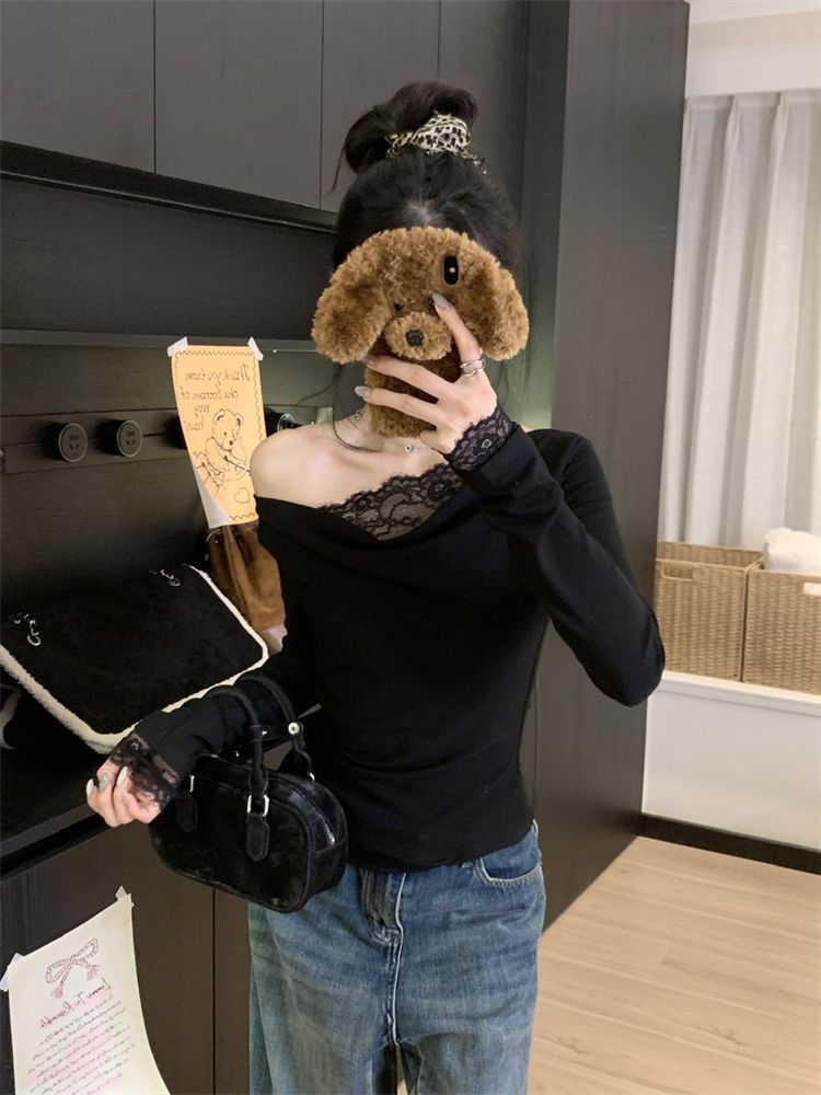 Diseño sentido encaje patchwork base top mujer otoño e invierno nuevo deseo puro chica hot ajuste ceñido adelgazante hombros descubiertos manga larga camiseta