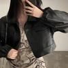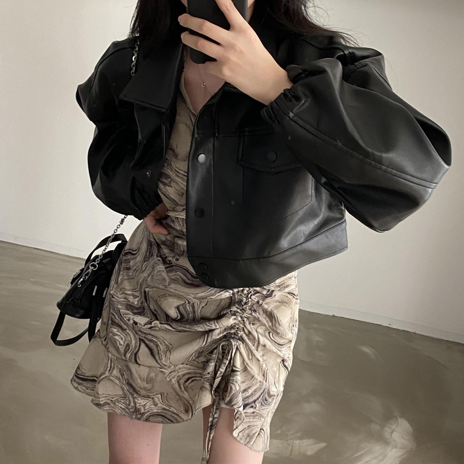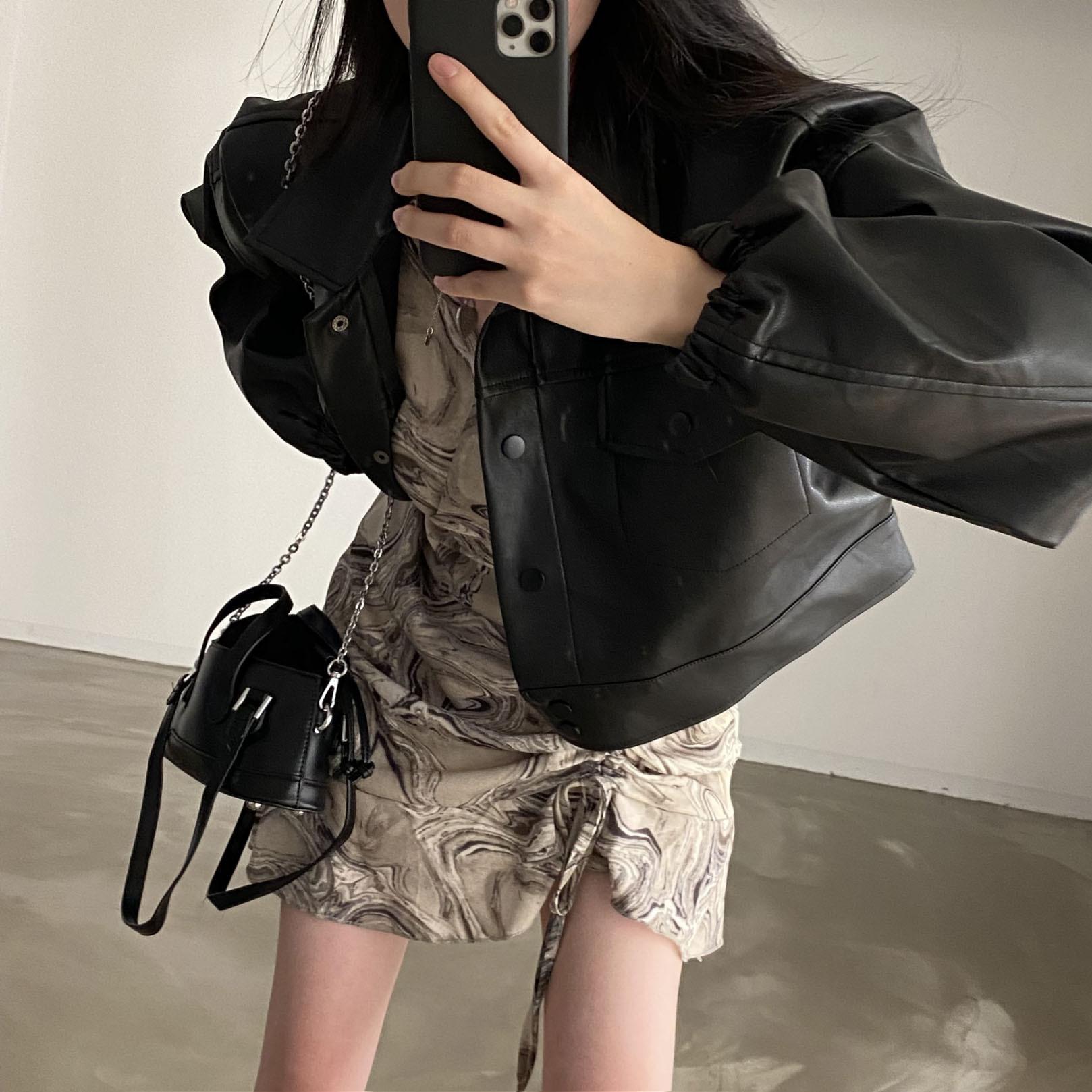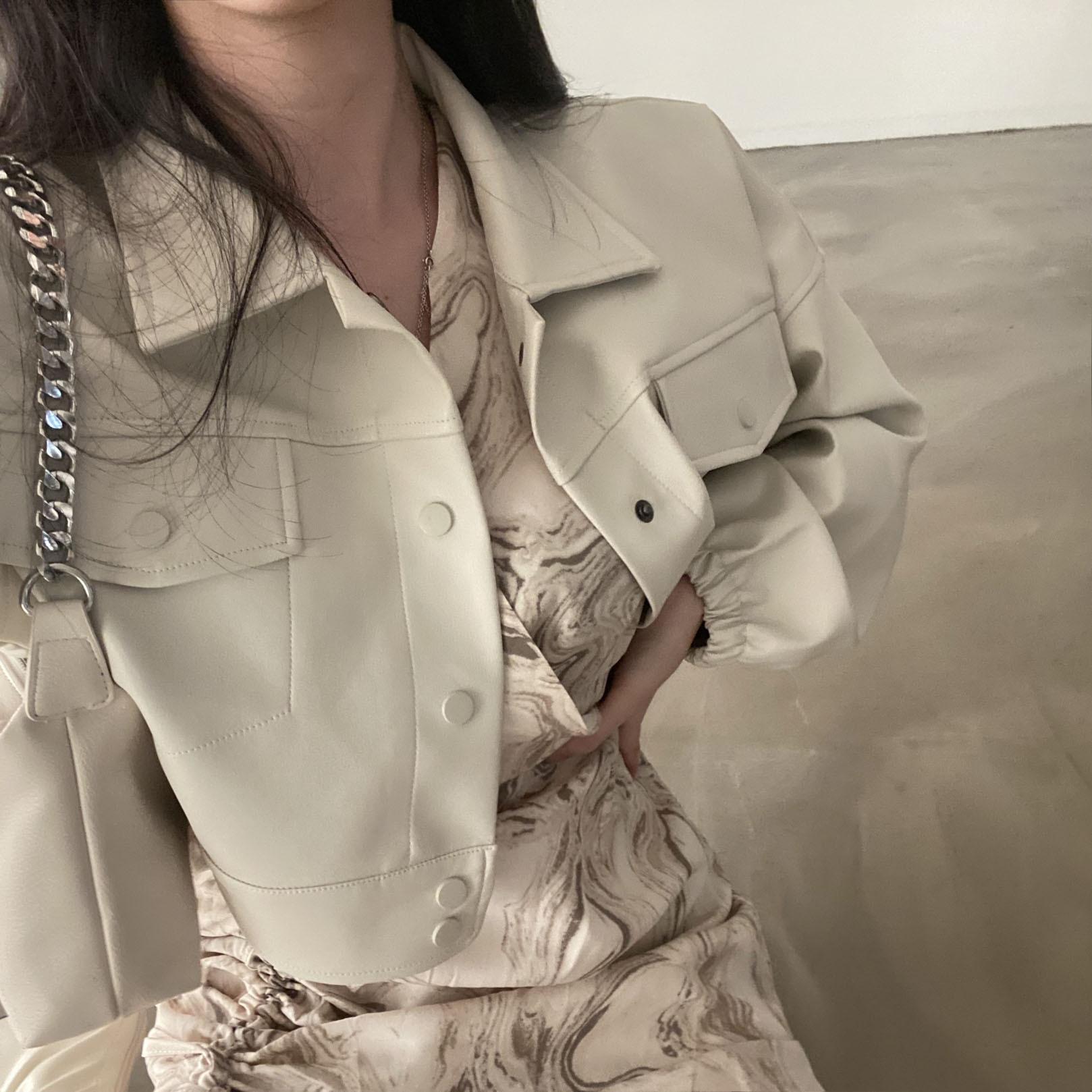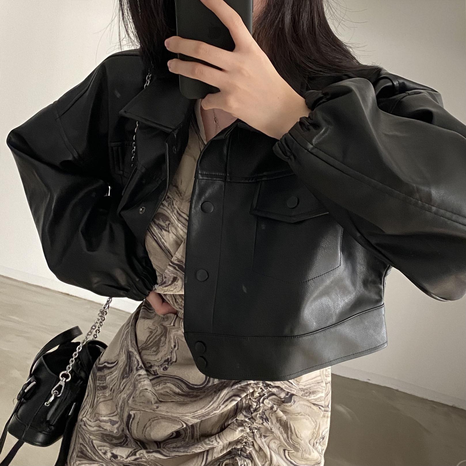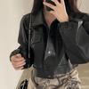 2025 Otoño Nuevo Chic Coreano Cuello Vuelto Doble Bolsillo Top de Cuero Chaqueta de Cuero para Mujer
