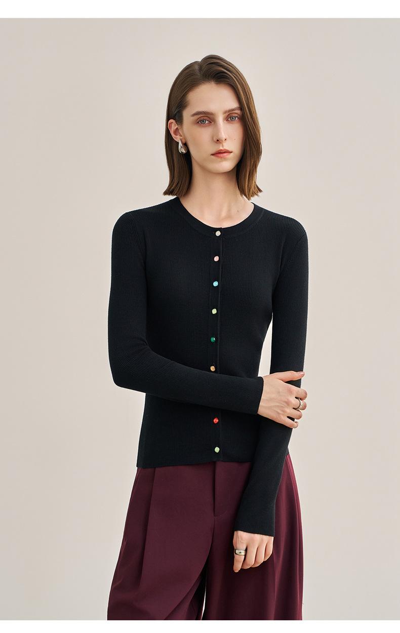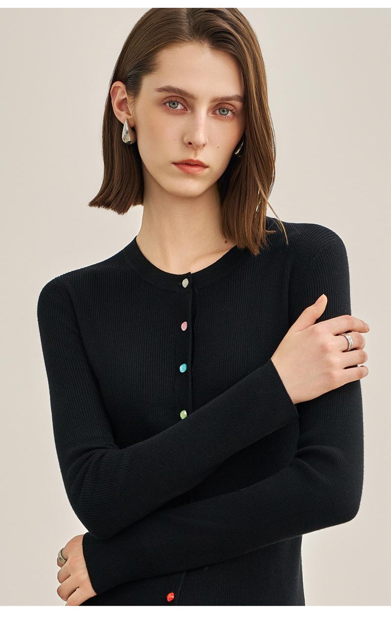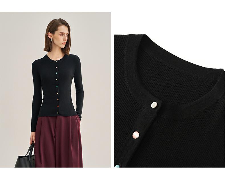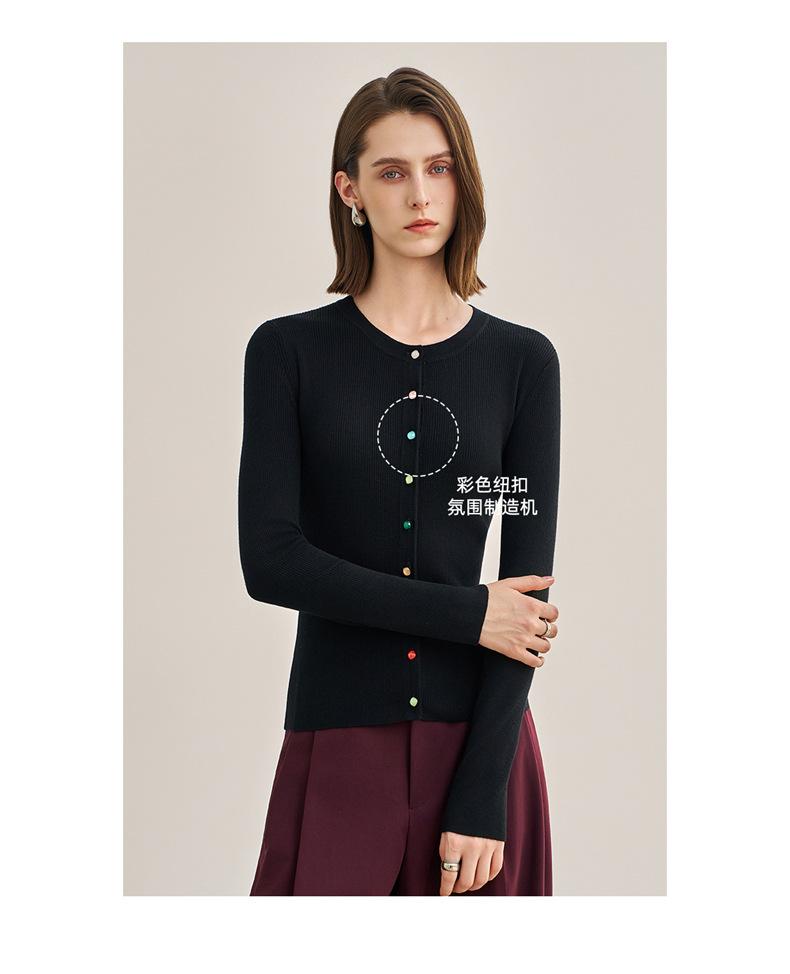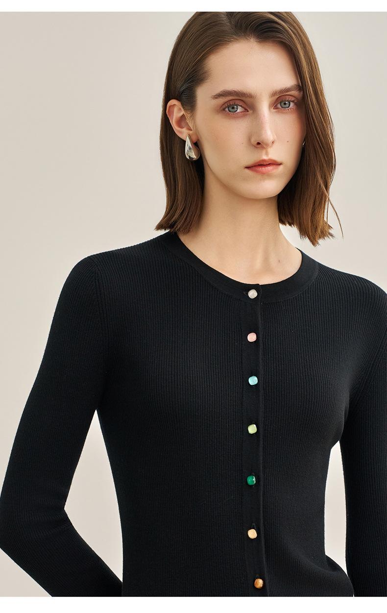 Suéter de otoño e invierno con botones de color y cuello redondo de imitación 100% lana pura, cárdigan para mujer, corte ajustado, entallado, abrigo exterior de un solo pecho, adelgazante