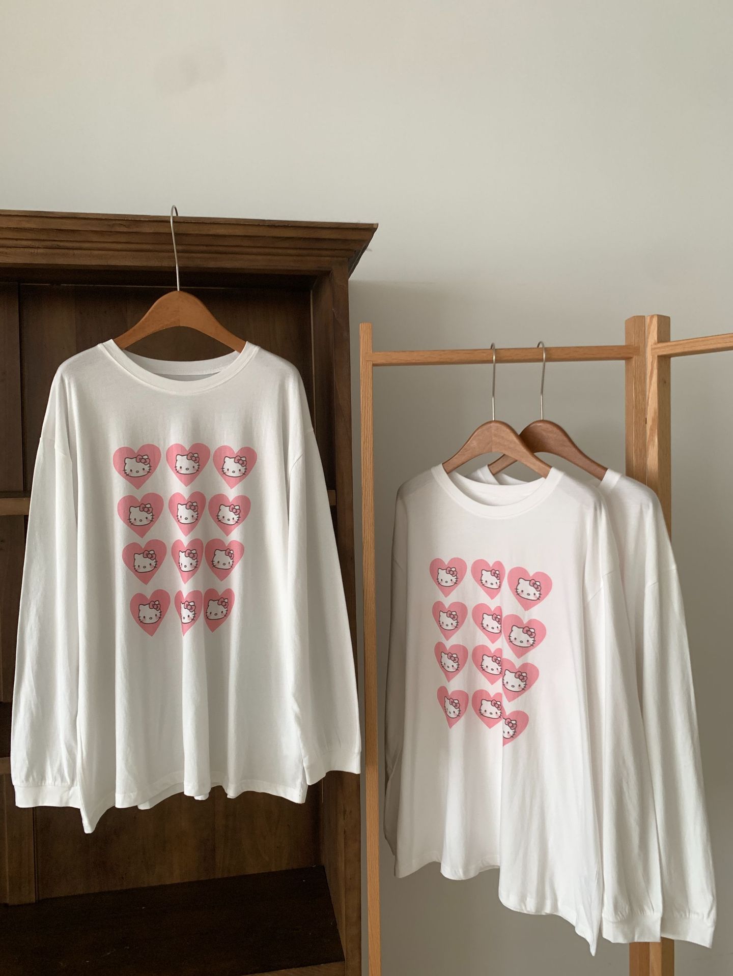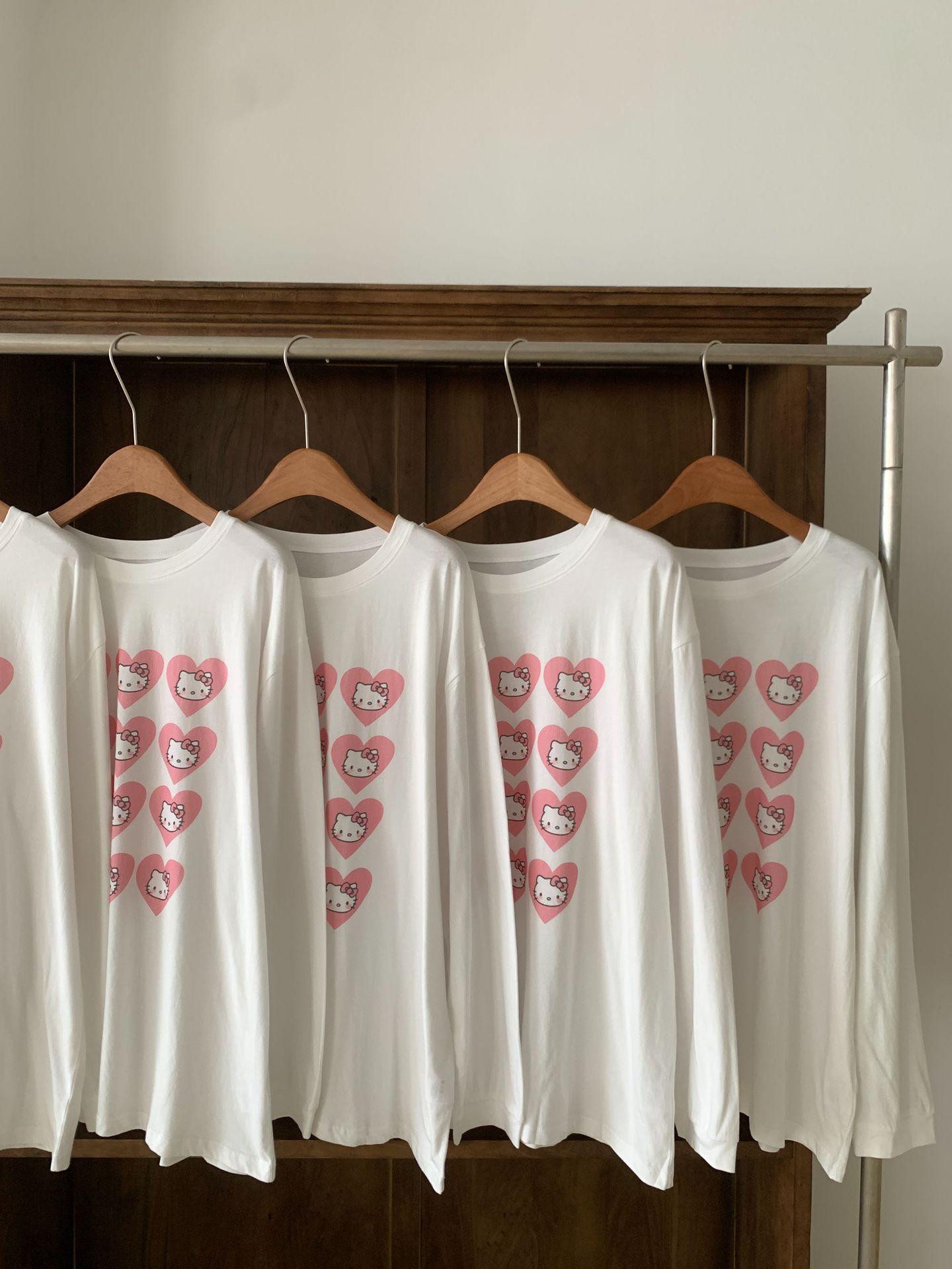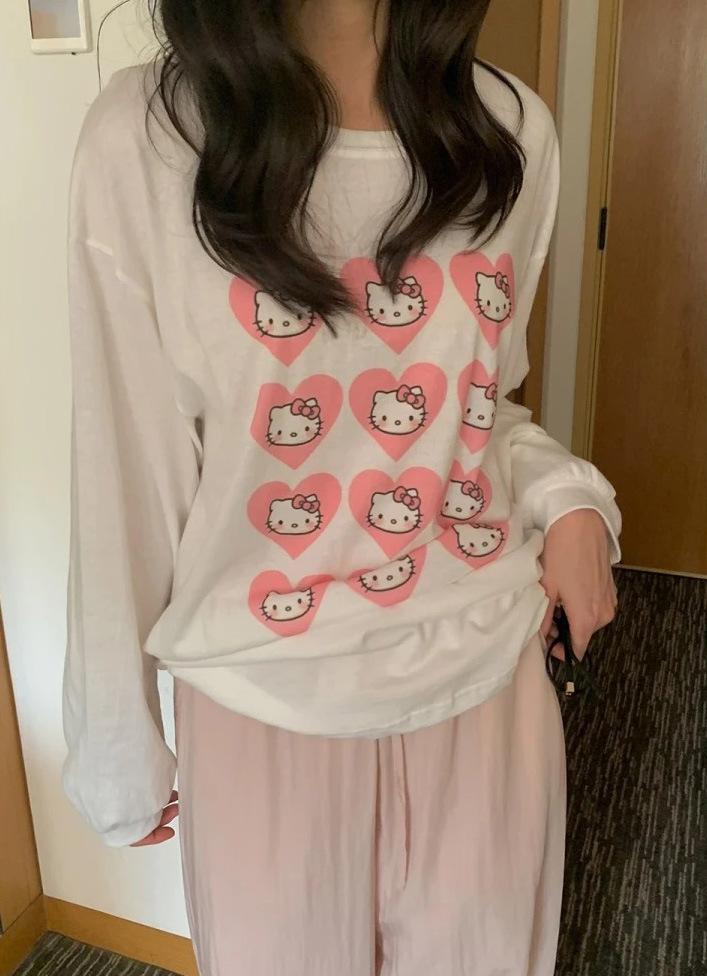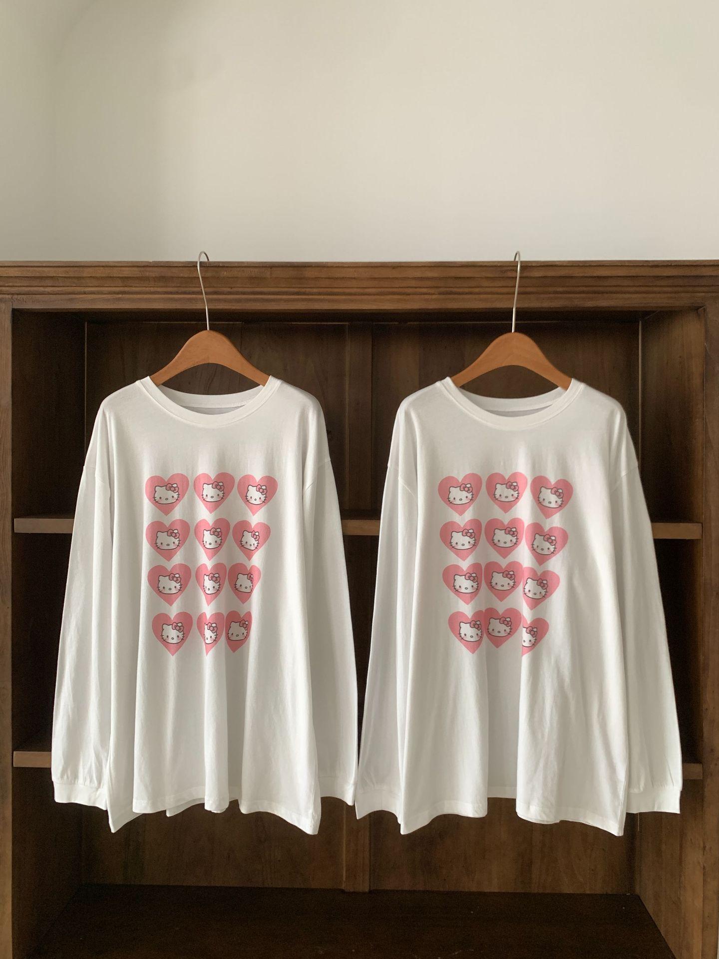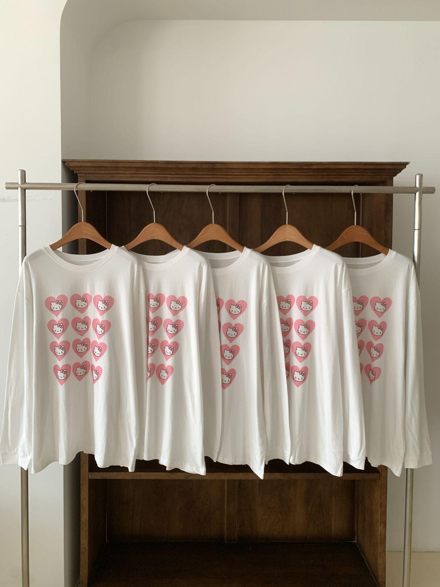 En stock 2025 Otoño Nuevo Coreano Dongdaemun Dulce Rosa Corazón Estampado de Gato Camiseta de Manga Larga Top Mujer