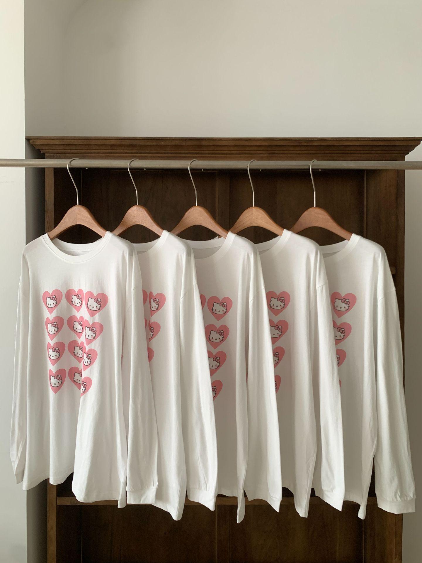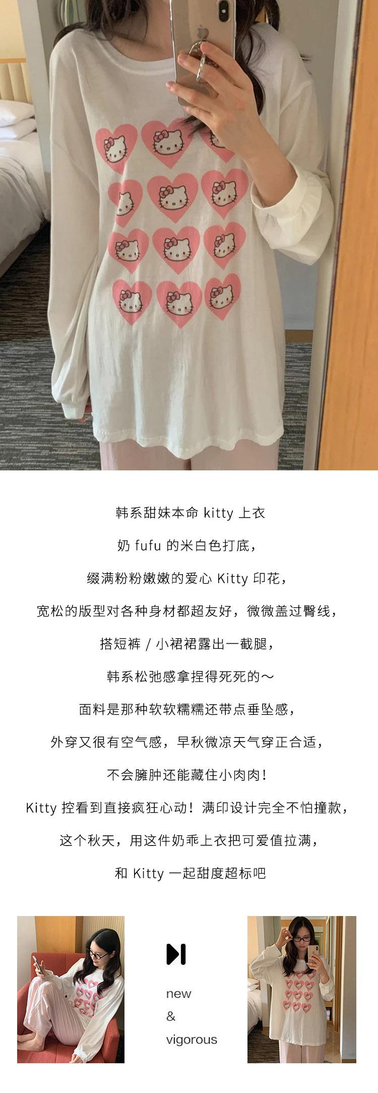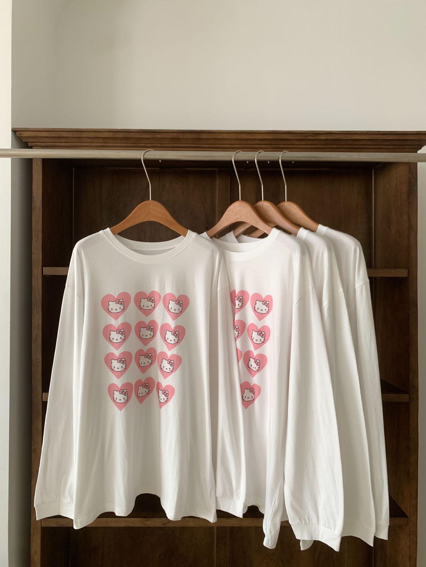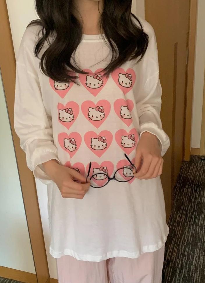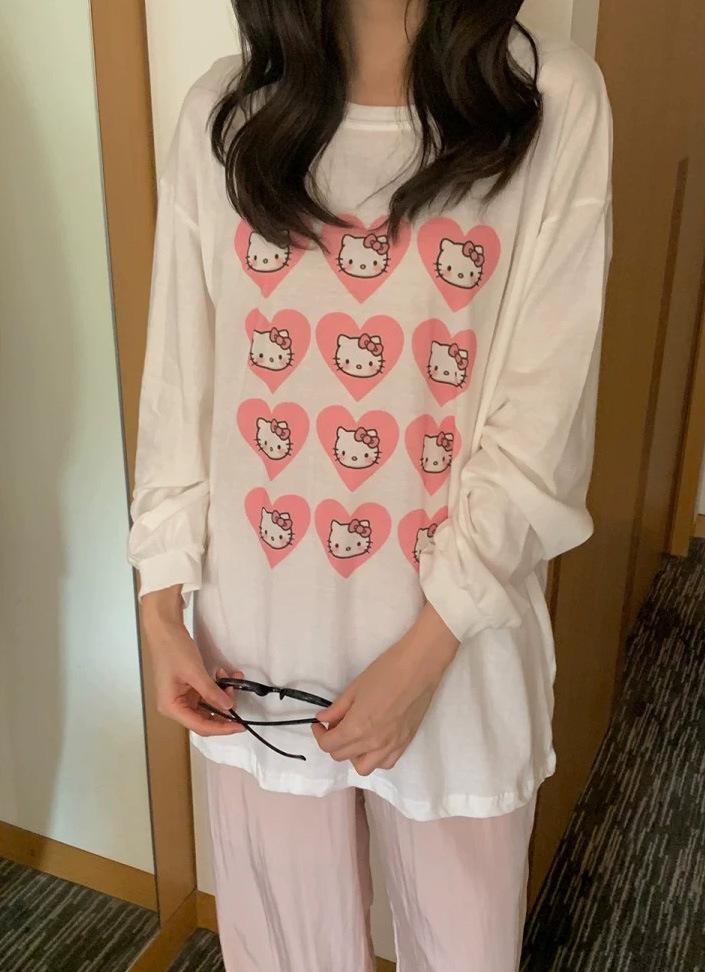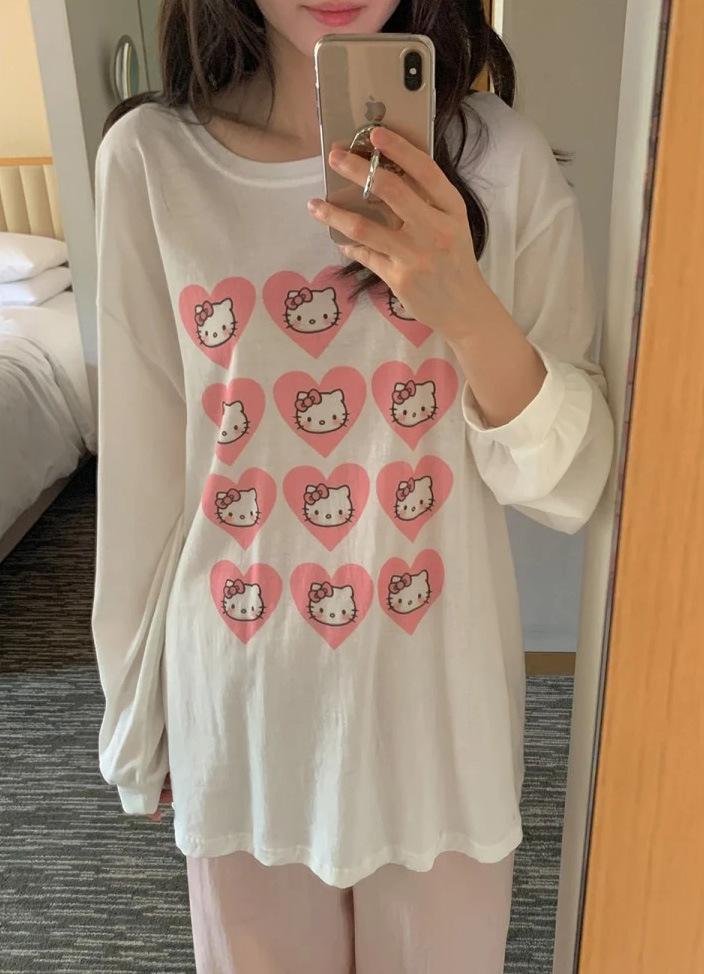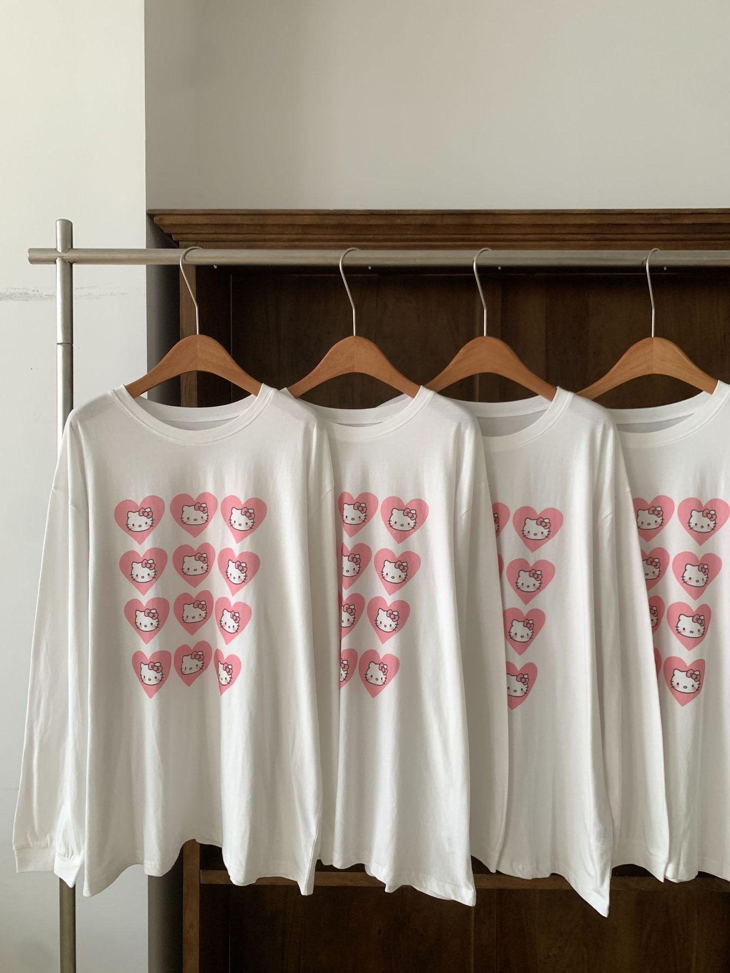 En stock 2025 Otoño Nuevo Coreano Dongdaemun Dulce Rosa Corazón Estampado de Gato Camiseta de Manga Larga Top Mujer