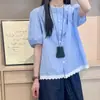 2025 Nuevo Verano Estilo Coreano Suelto y Moderno Encaje Manga Tres Cuartos Camisa Rayada Versátil Top Básico de Cuello Redondo