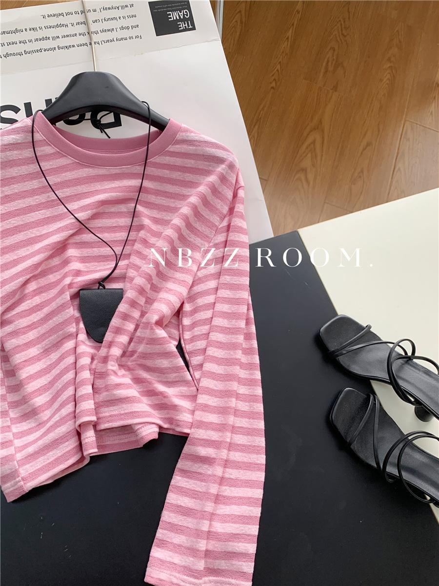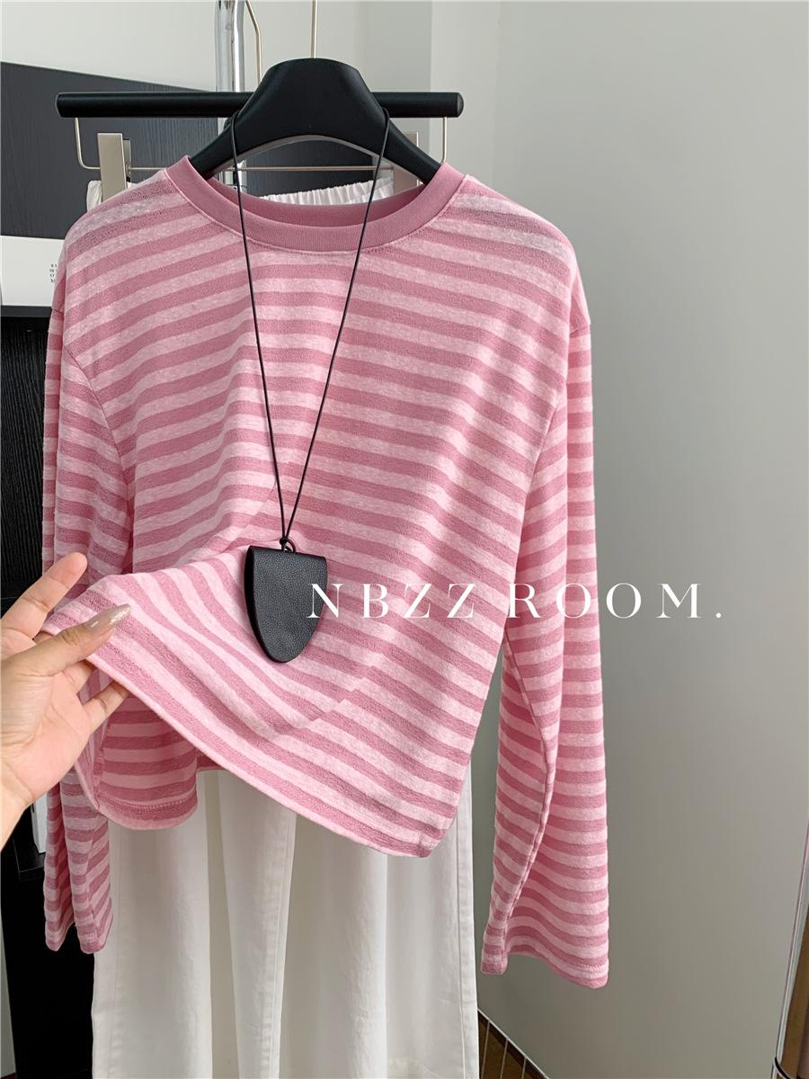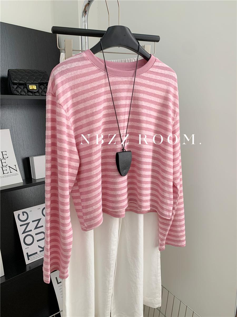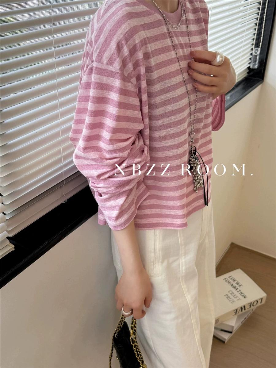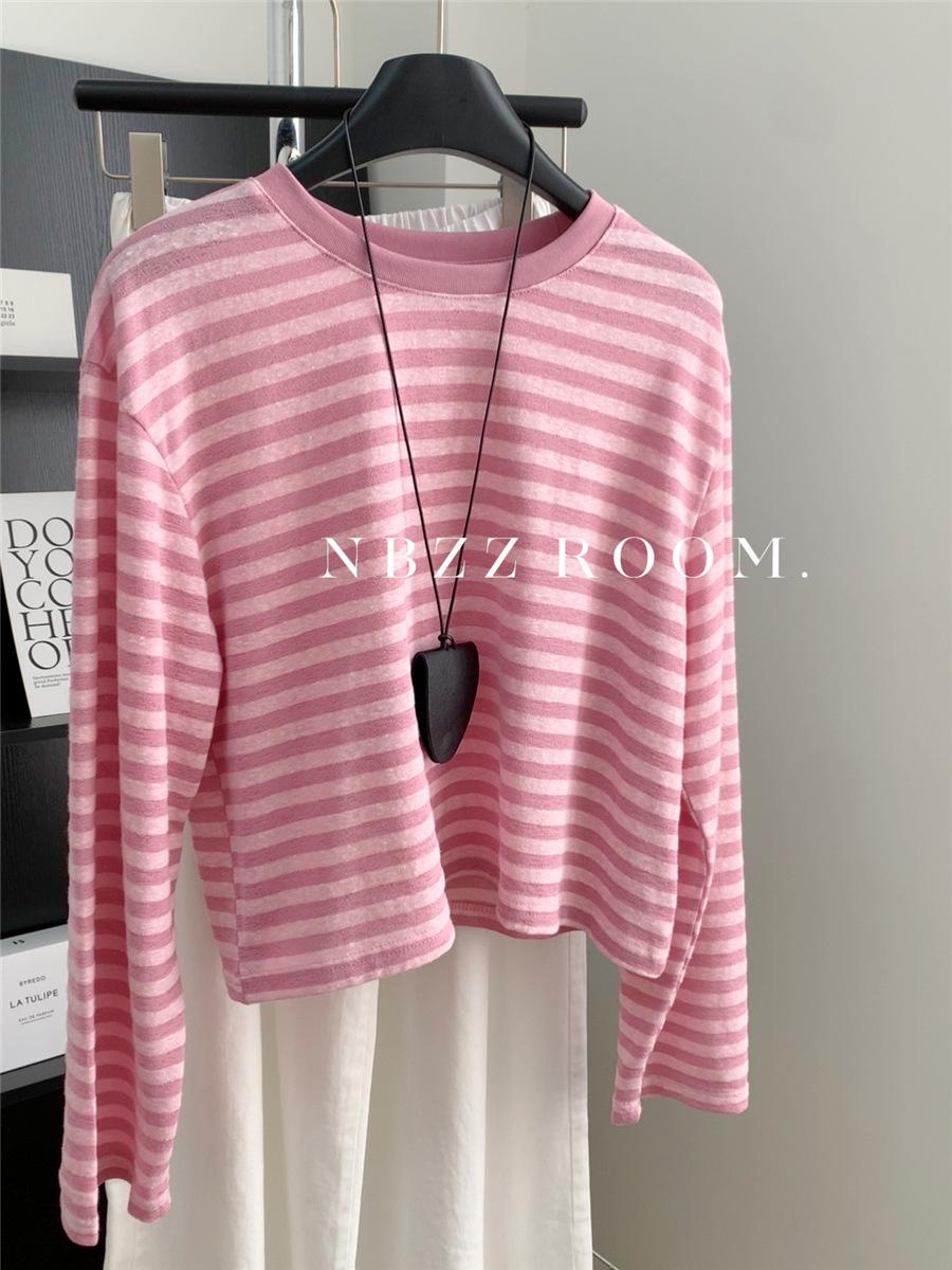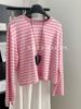 2025 Primavera y Verano 15% Algodón Dulce Reductor de Edad Rosa Rayas Camiseta de Manga Larga Moda Femenina Camisa Suelta Protectora del Sol Estilo Corto Trendy