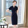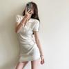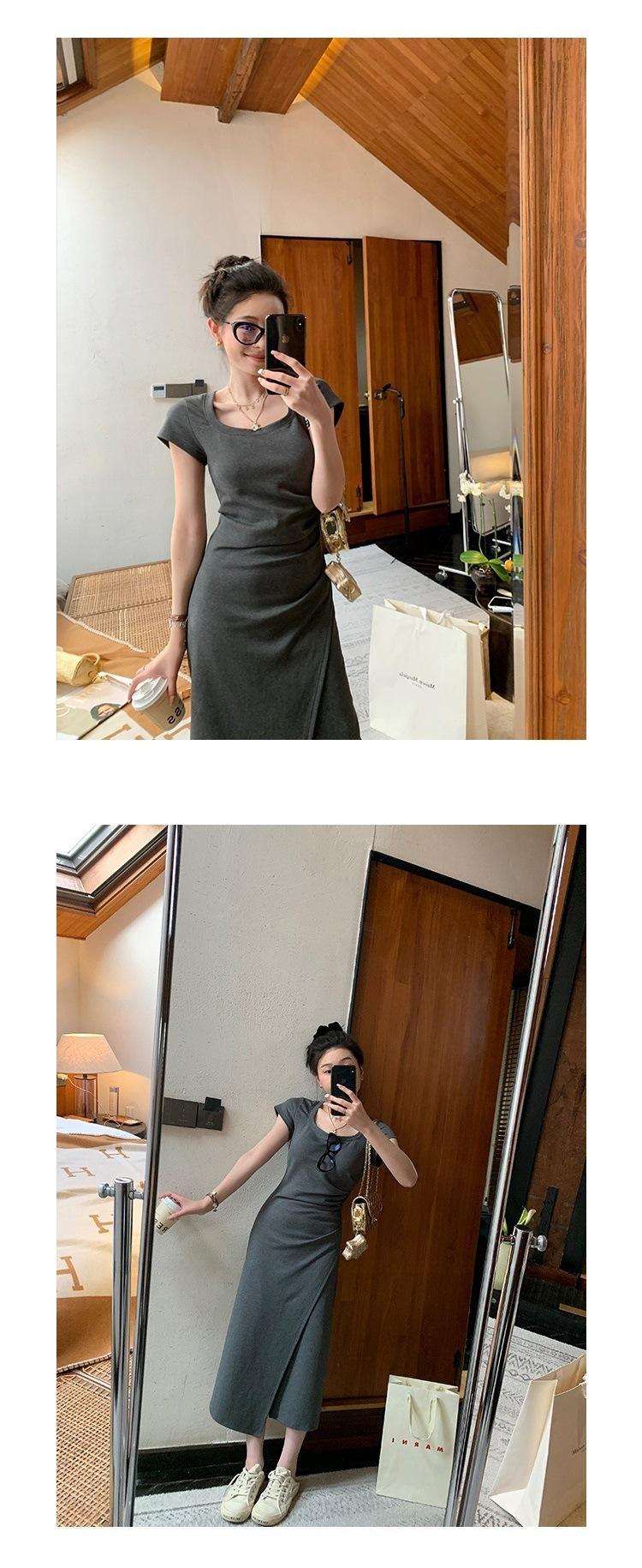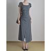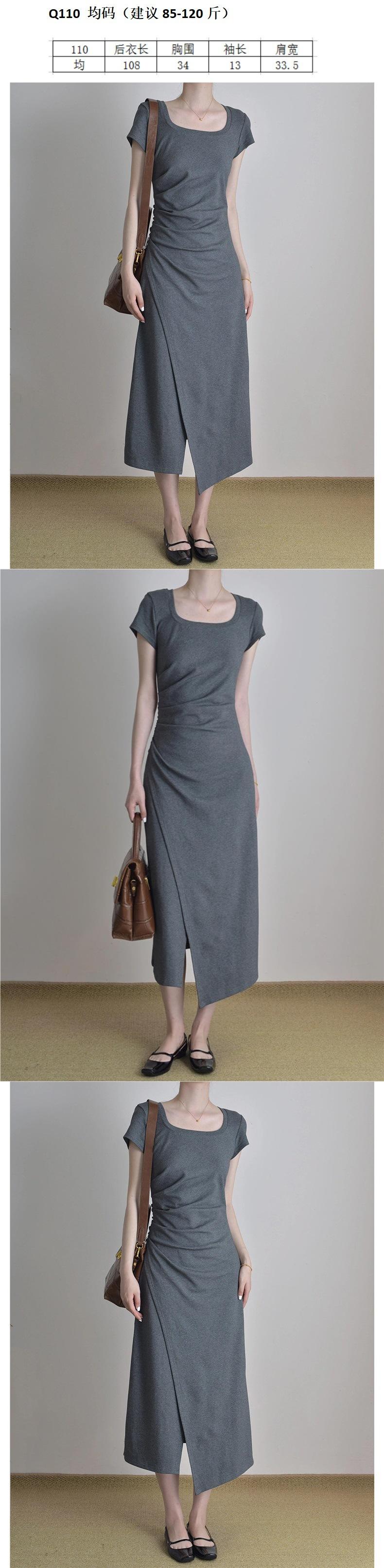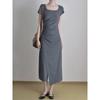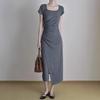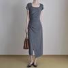 Diseño de Estación Europea Gris Verano Adelgazante Cintura Nuevo Temperamento Plisado Manga Corta Bodycon Abertura Vestido
