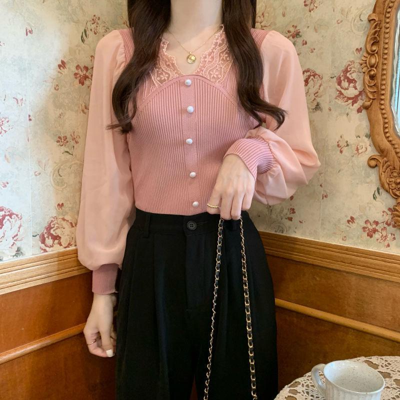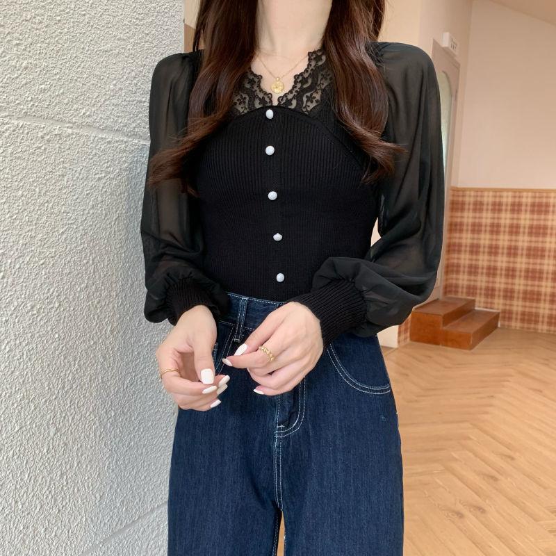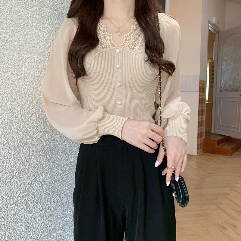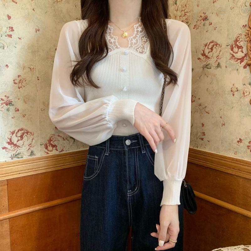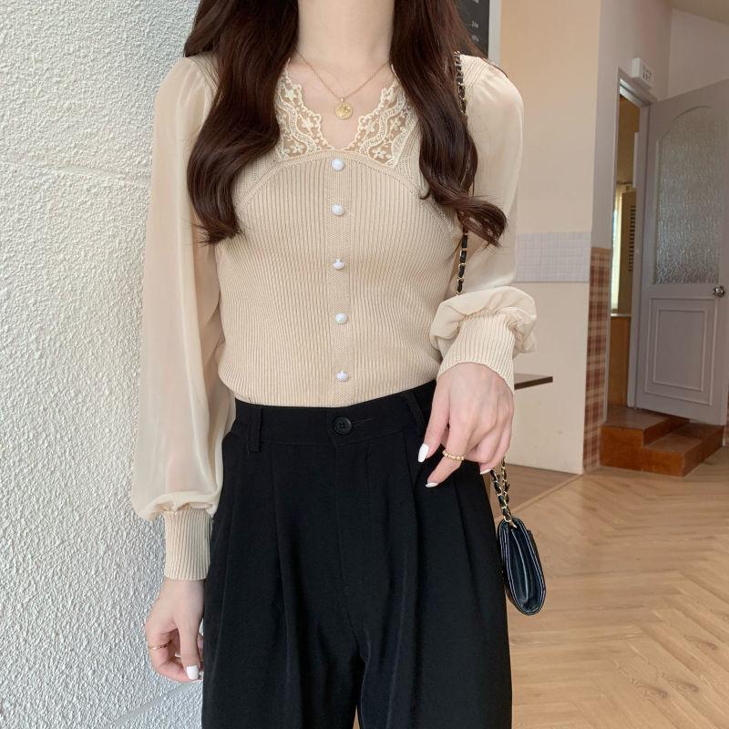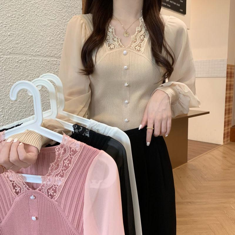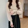 2025 Estilo Coreano Nuevo Costuras de Cuello Otoño e Invierno Chifón Manga Larga Botón Suéter Corto Top Elegante para Mujer Trendy