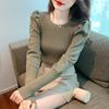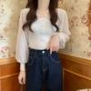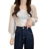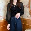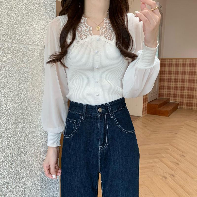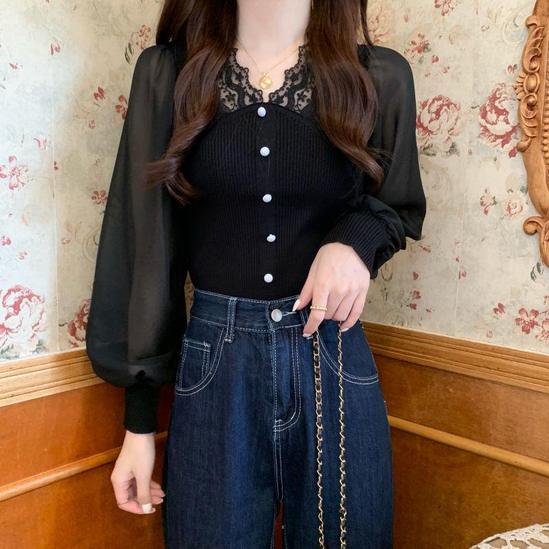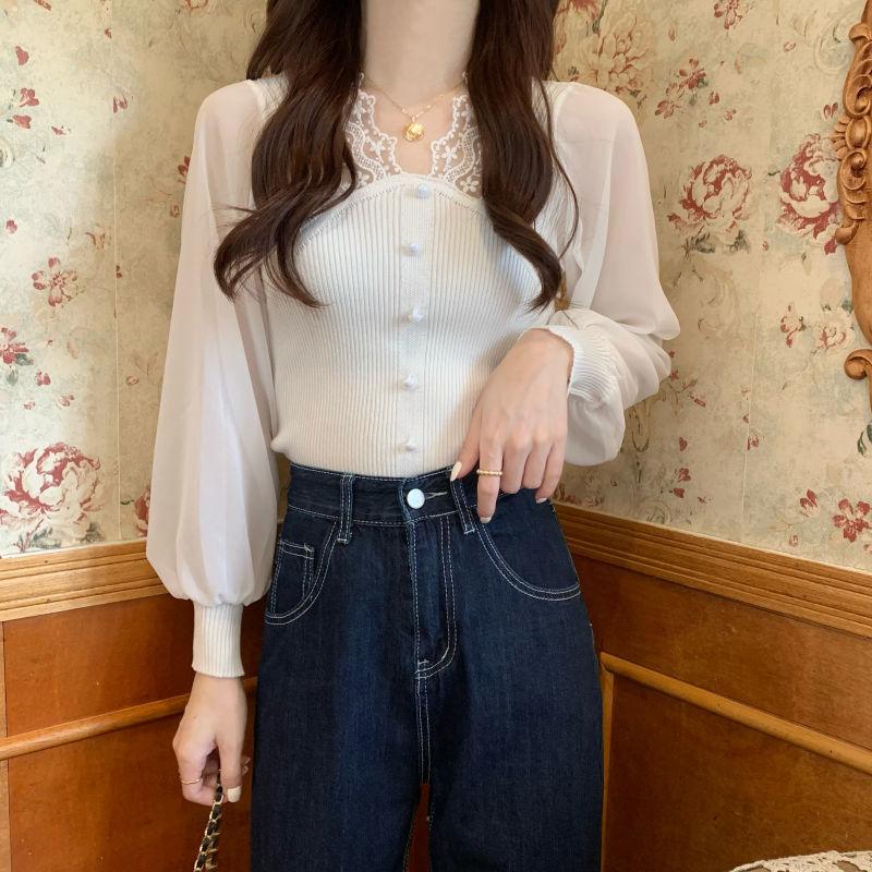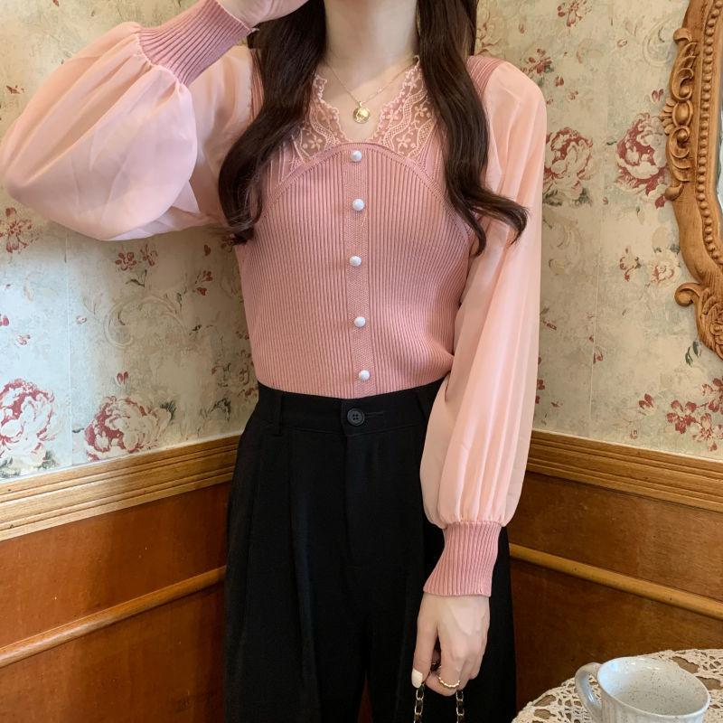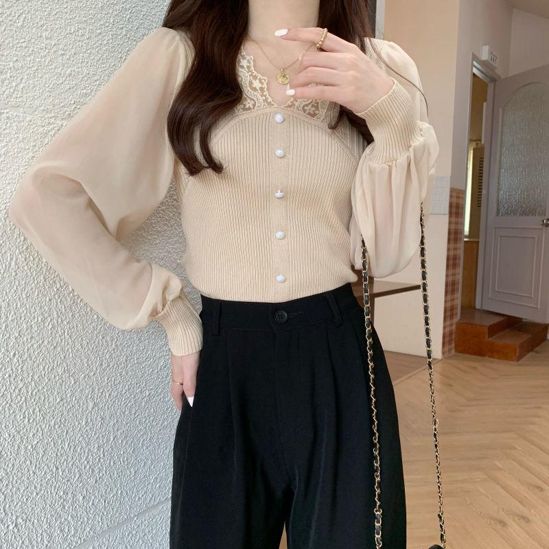 2025 Estilo Coreano Nuevo Costuras de Cuello Otoño e Invierno Chifón Manga Larga Botón Suéter Corto Top Elegante para Mujer Trendy
