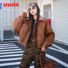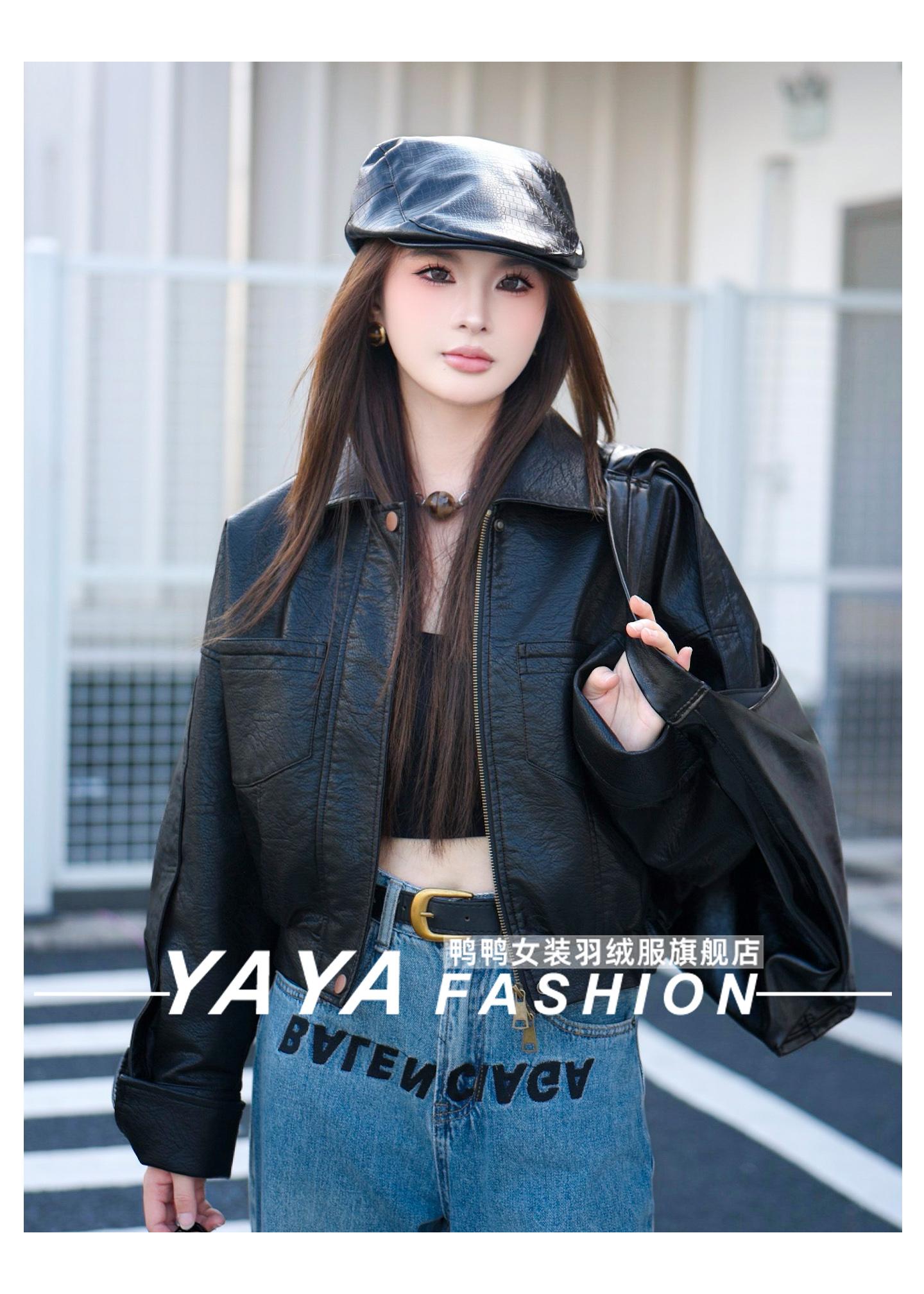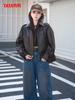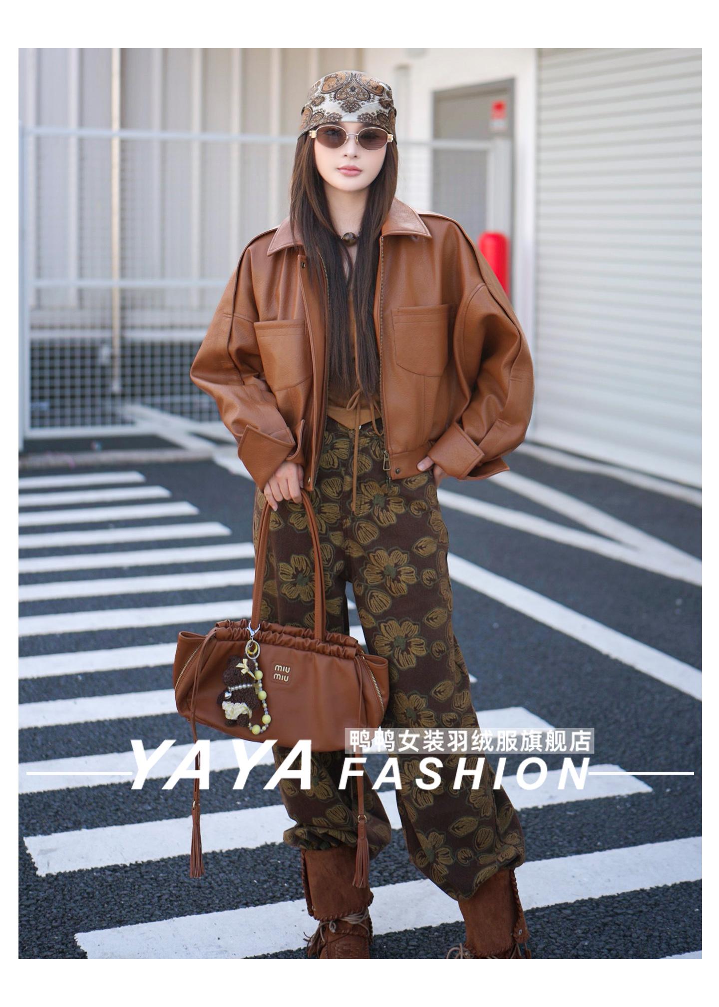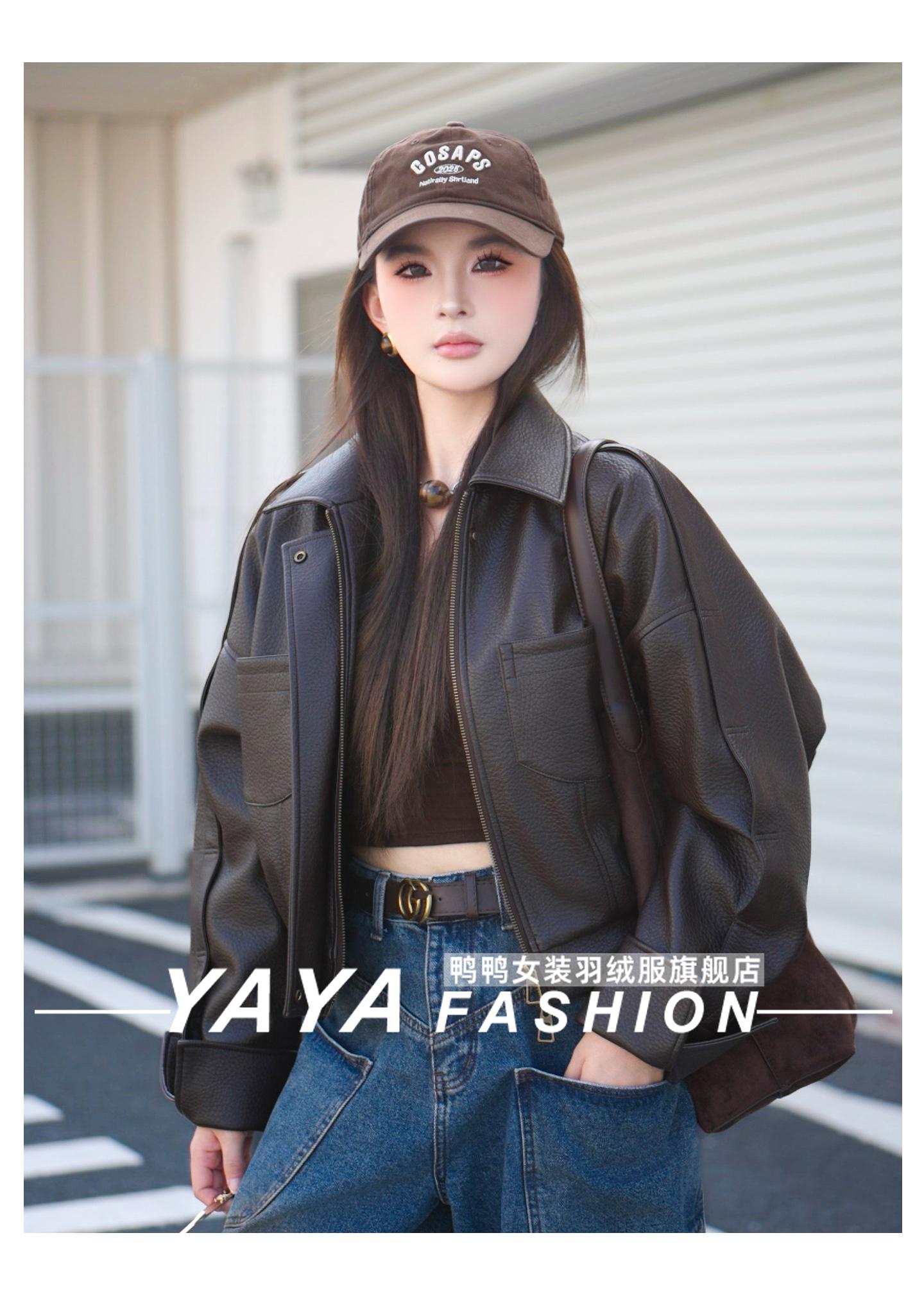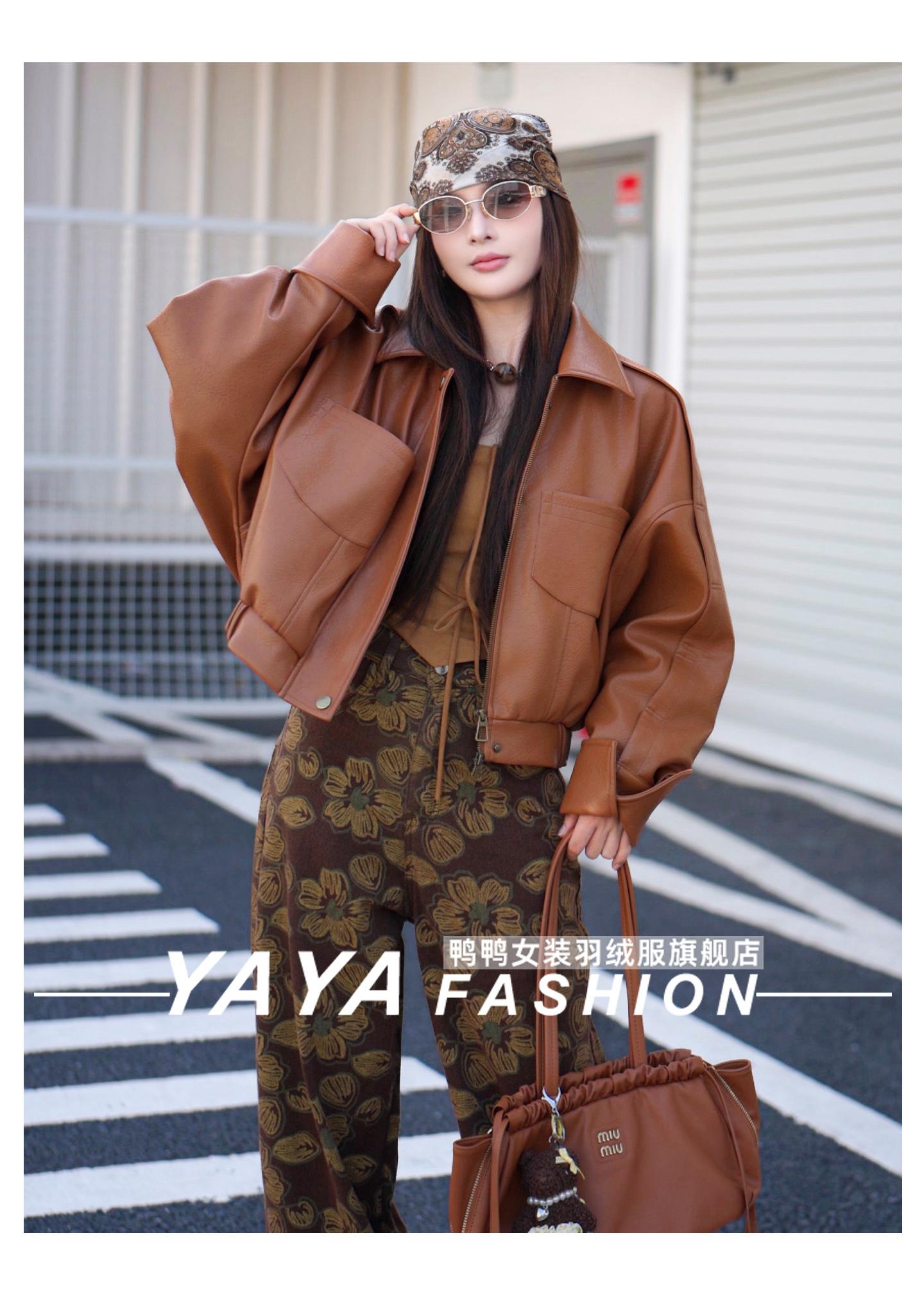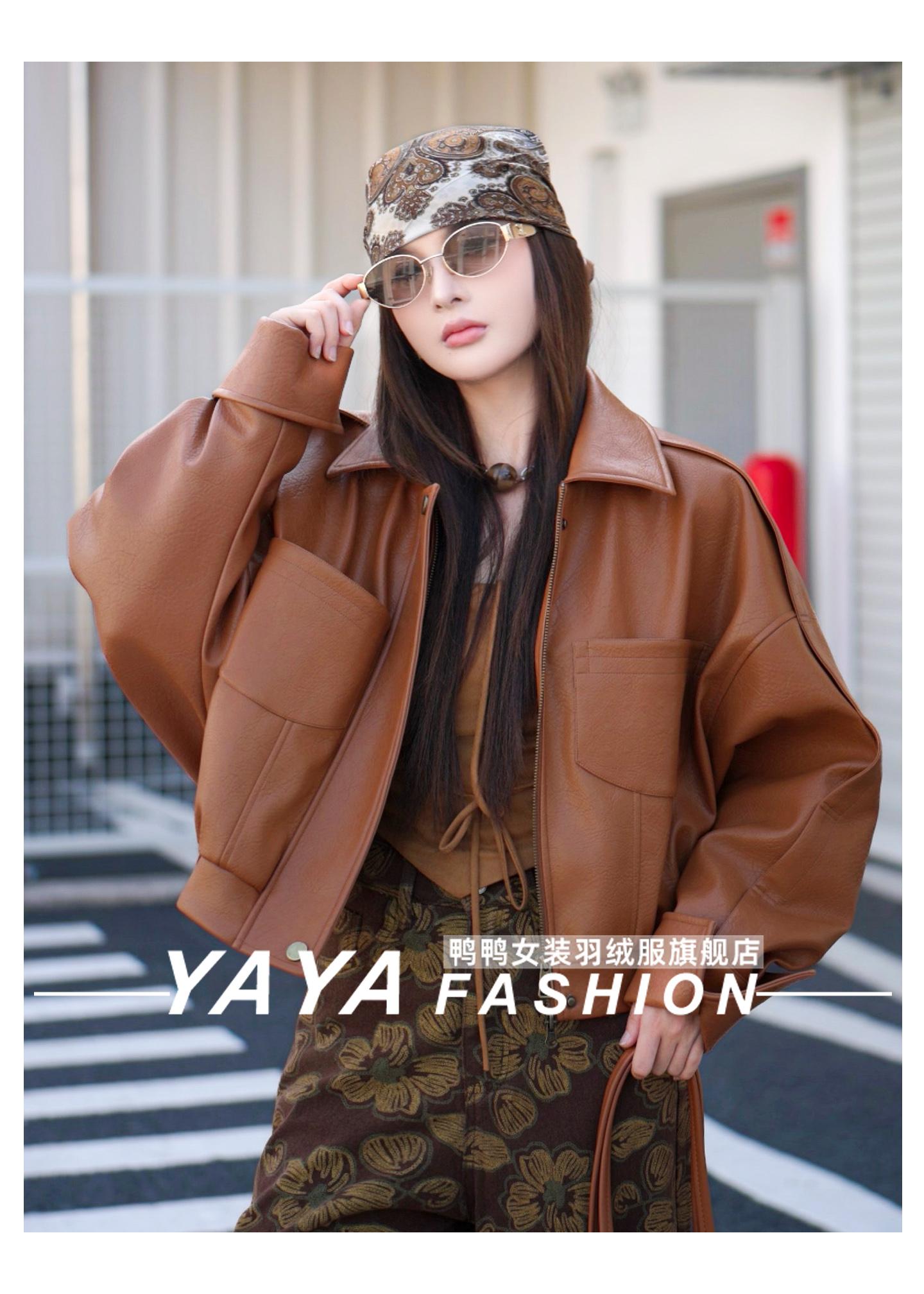 Yaya 2025 Otoño Nuevo Chaqueta de Plumas de Cuero Moda Retro Ámbar Brillante Color Café Chaqueta de Cuero Ropa Exterior de Alta Gama Mujer