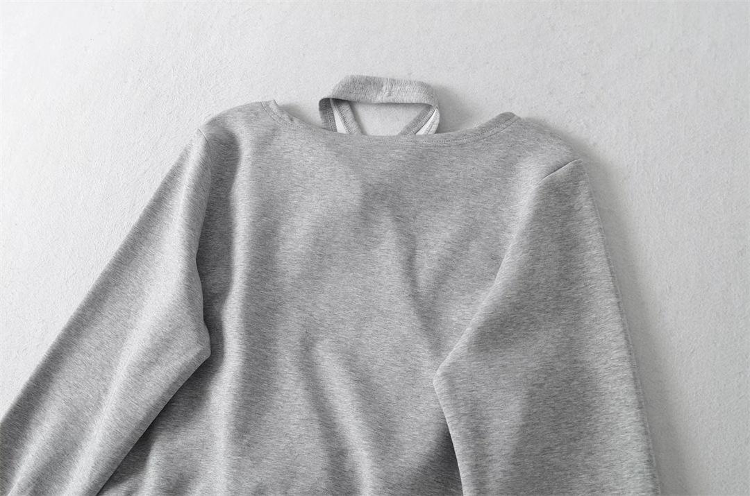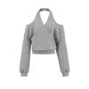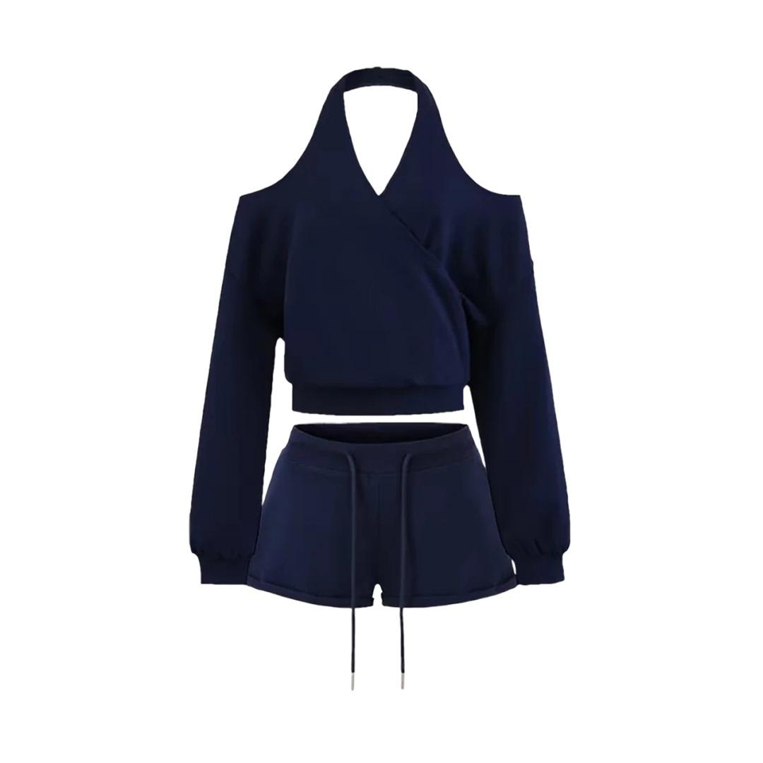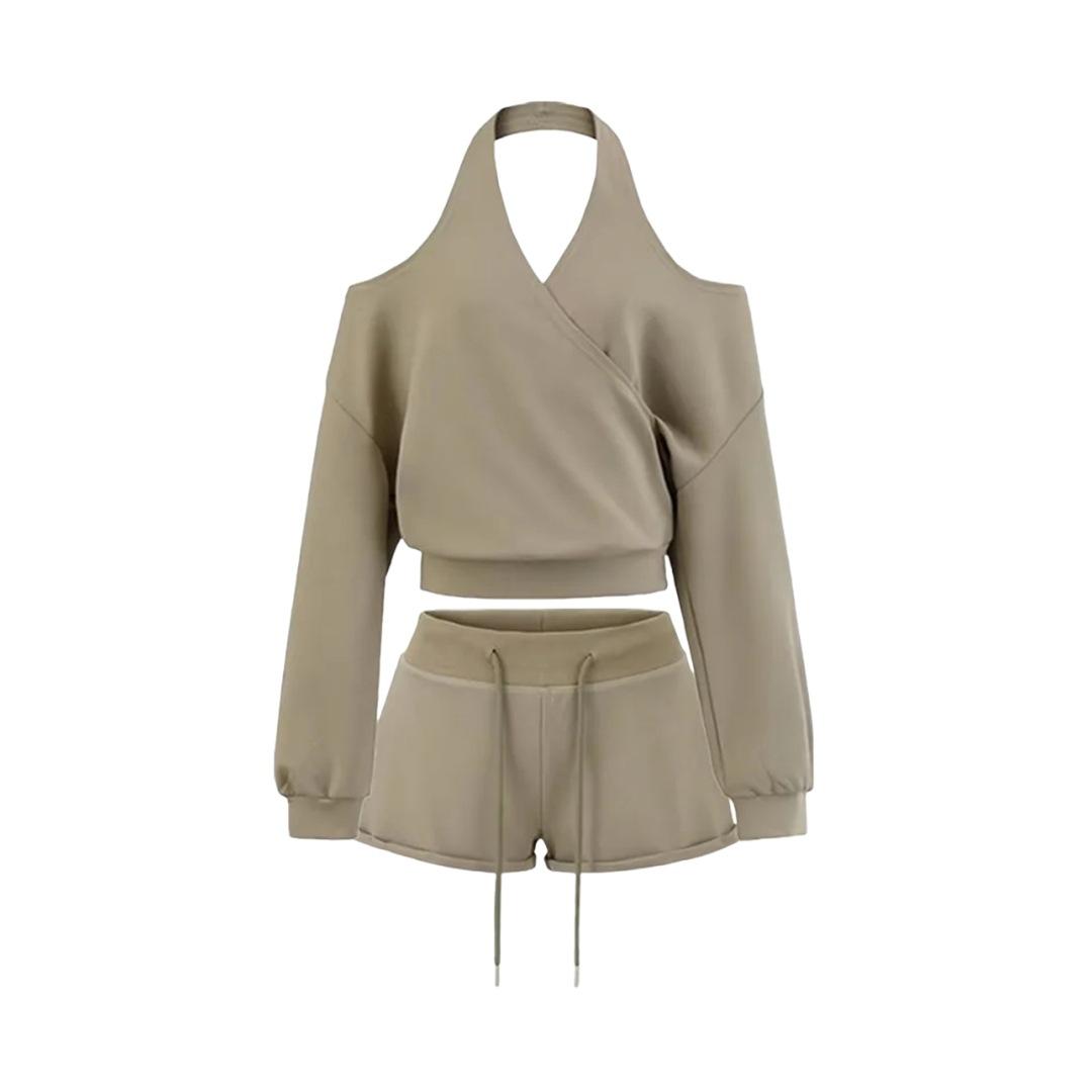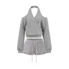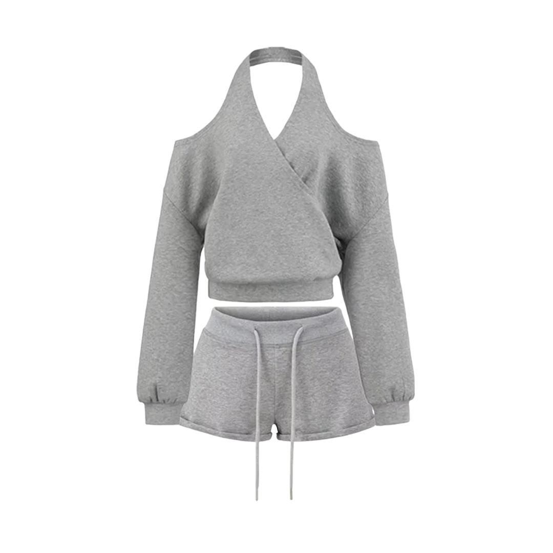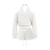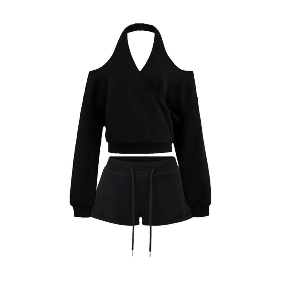 Sudadera de cuello en V halter sin espalda de manga larga para mujer, conjunto de pantalones cortos y sudadera de pierna recta casual holgados con cordón y cintura elástica