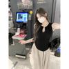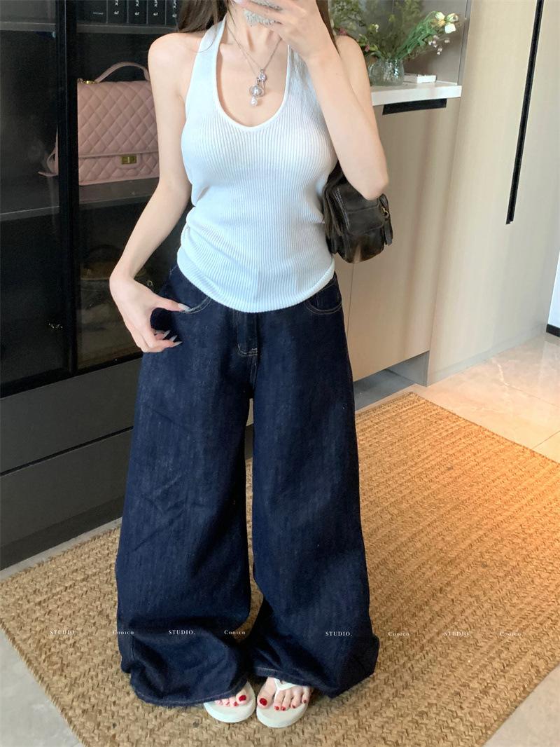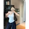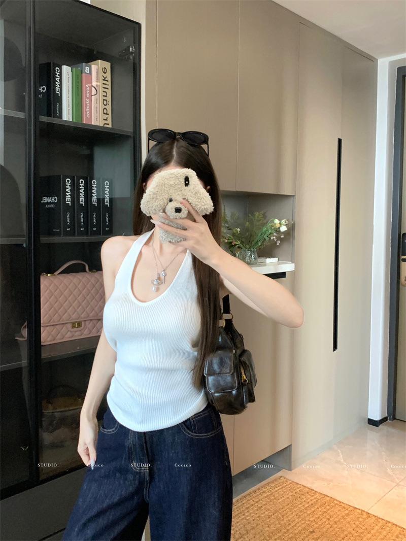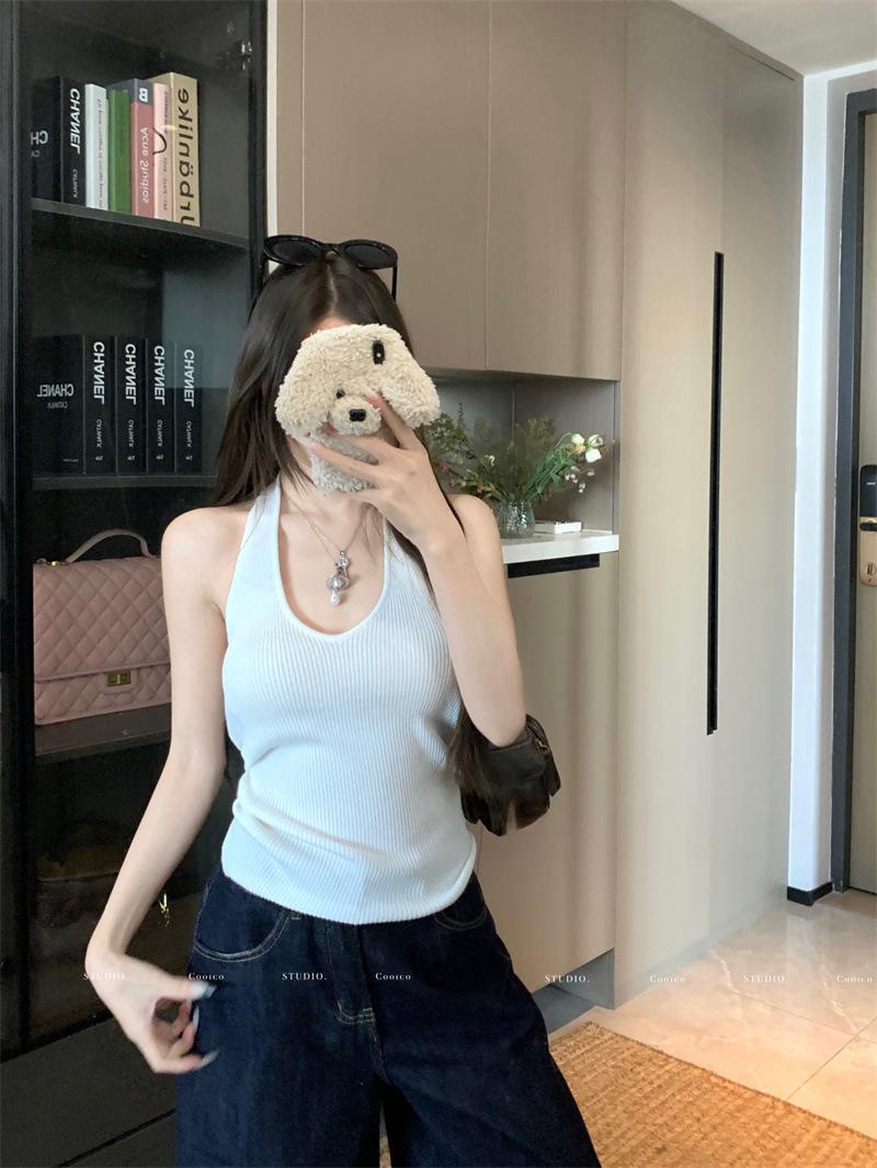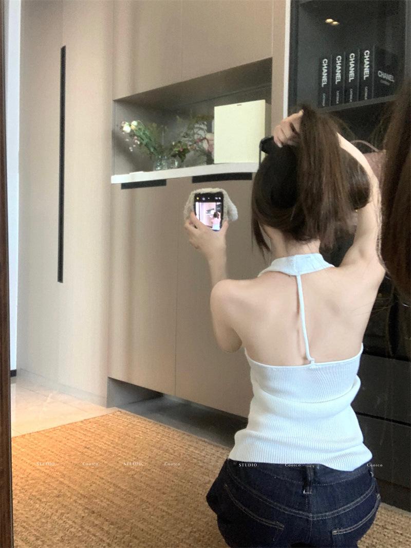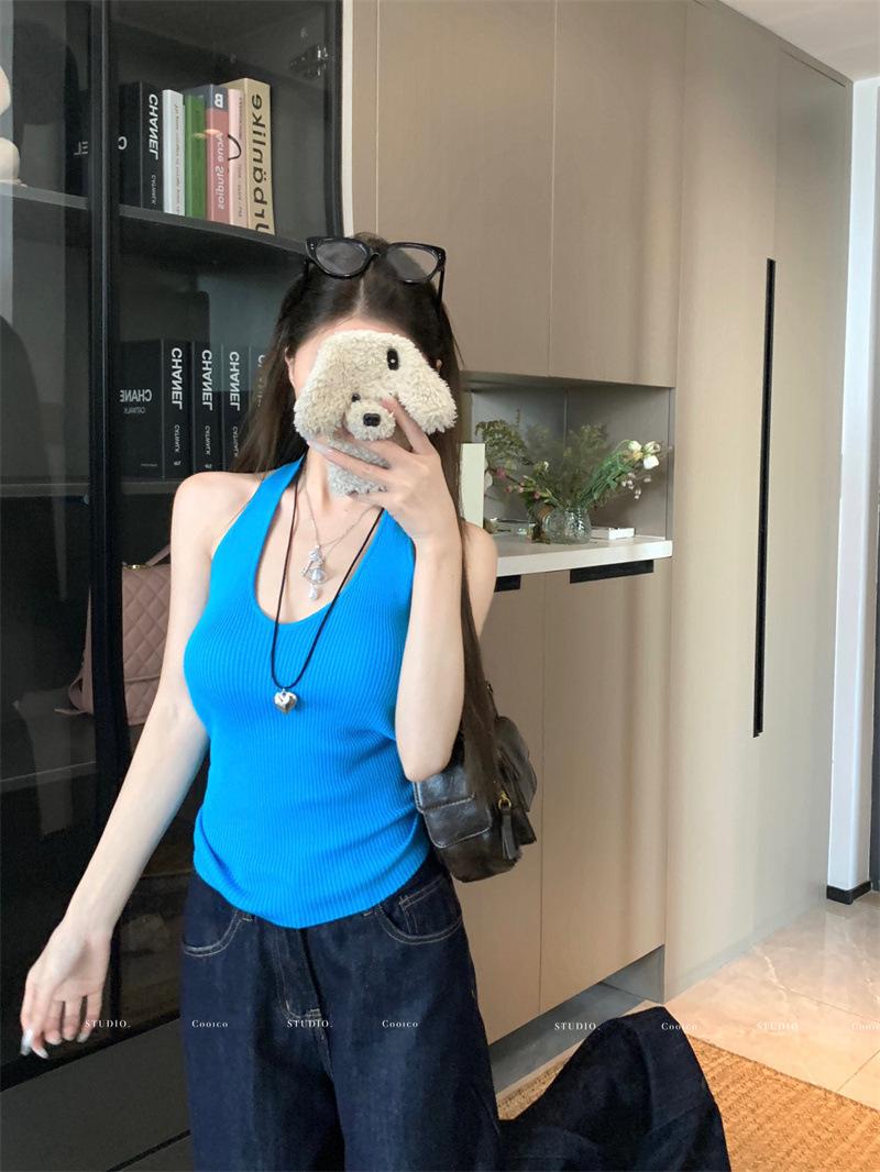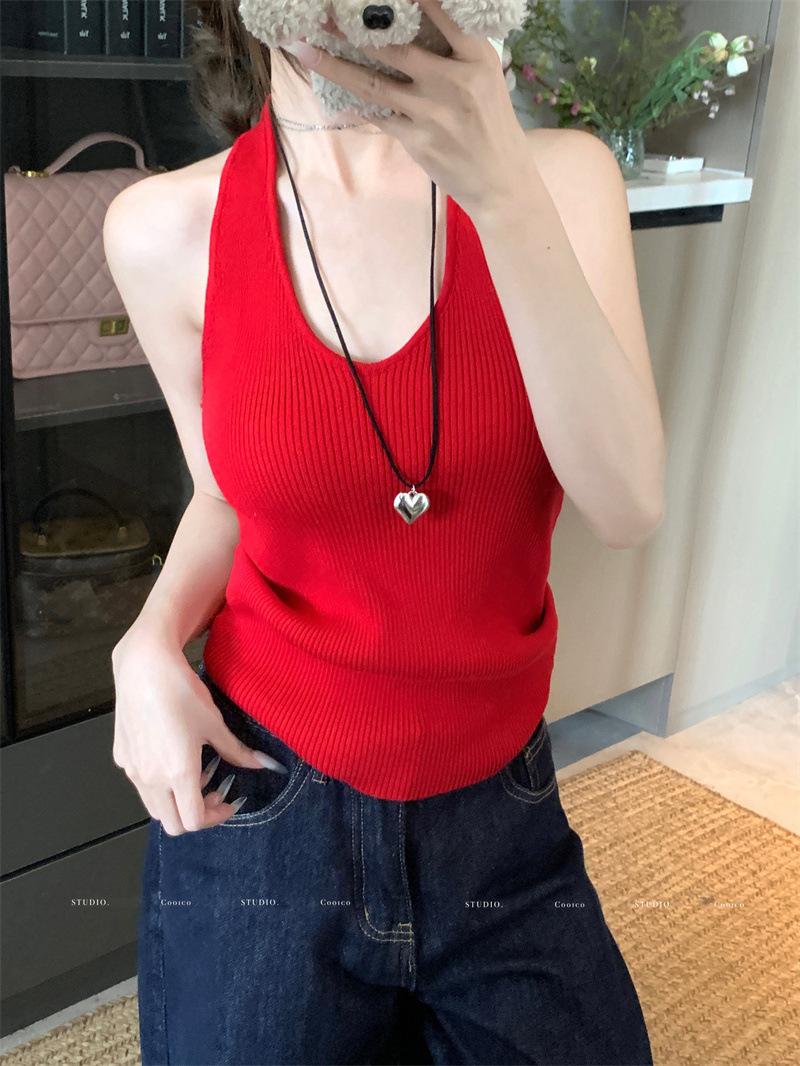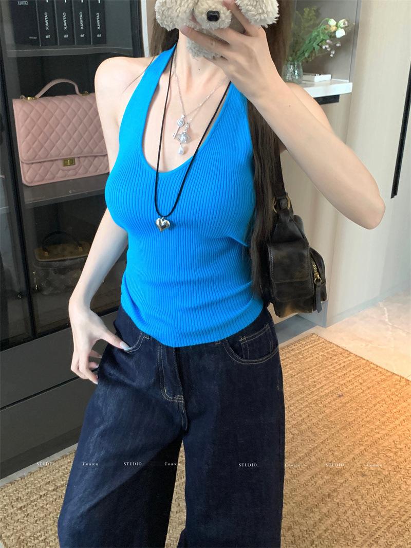 Verano Nuevo Retro Cuello en V Espalda Descubierta Sin Mangas Ajustado Tejido de Lana Halter Top Chaleco de Color Puro para Mujer