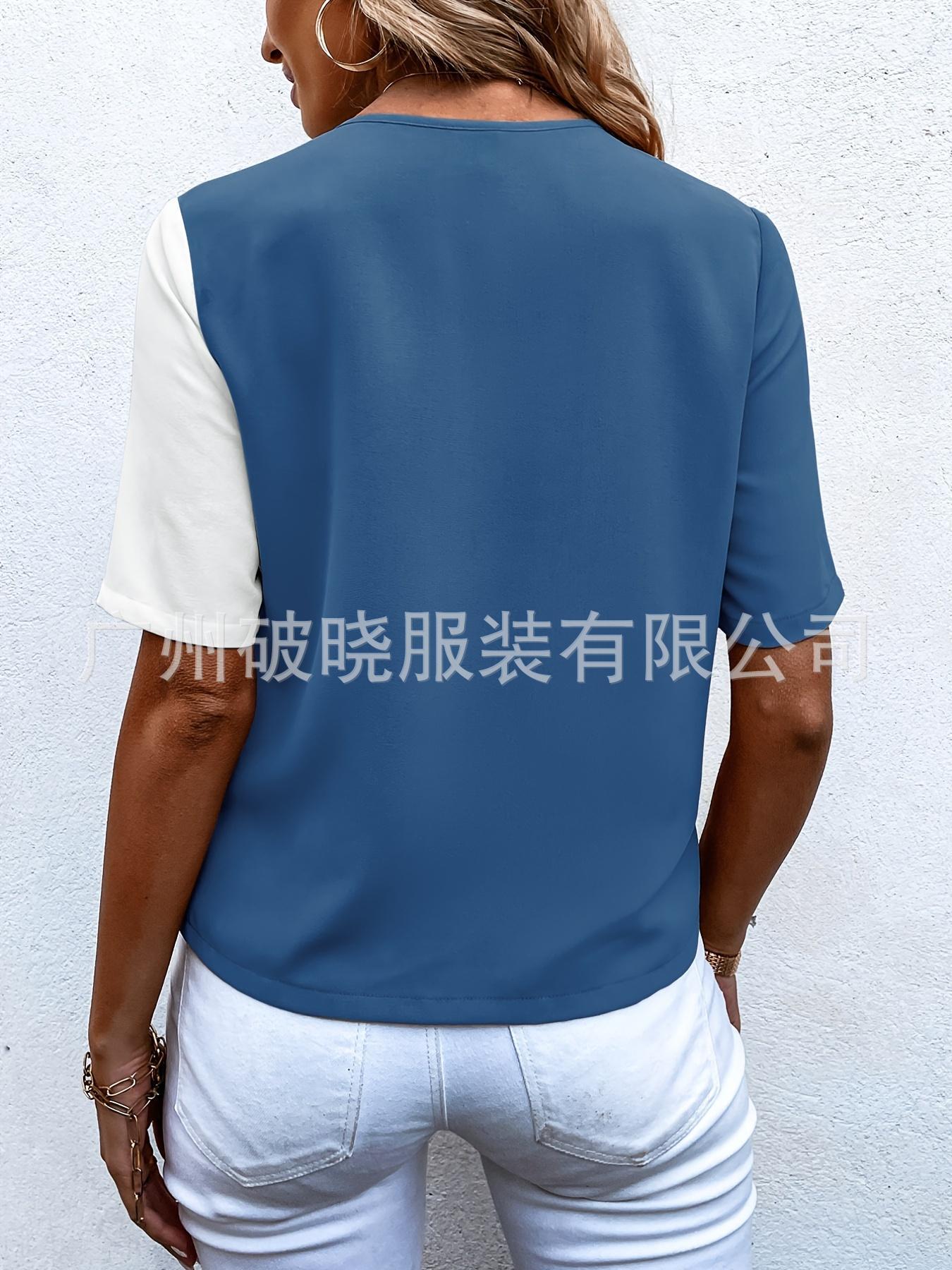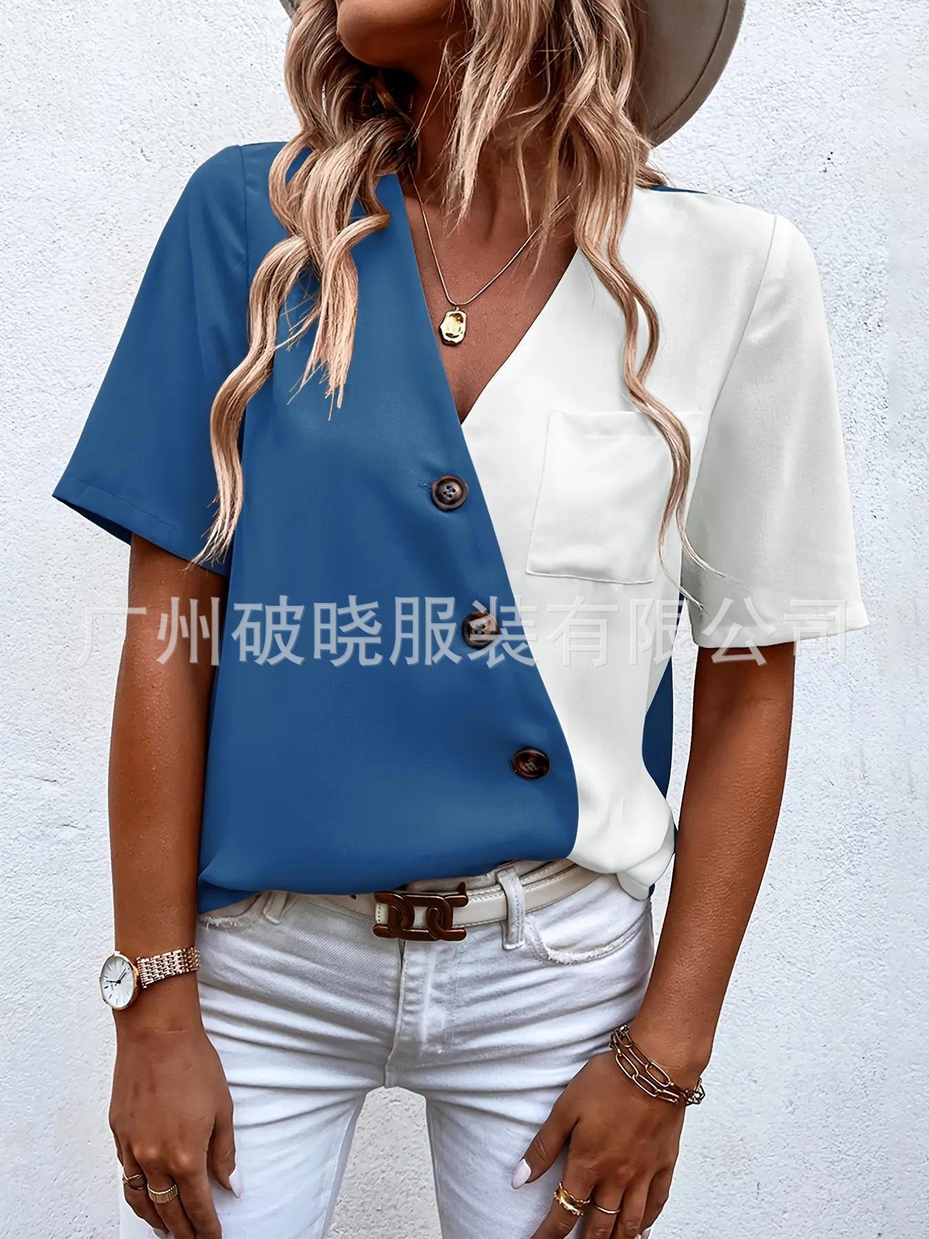 2024 Verano Nuevo Exportación Europeo y Americano Transfronterizo para Mujer Cuello en V Moda Casual Manga Corta Contraste Botón Cárdigan Camisa