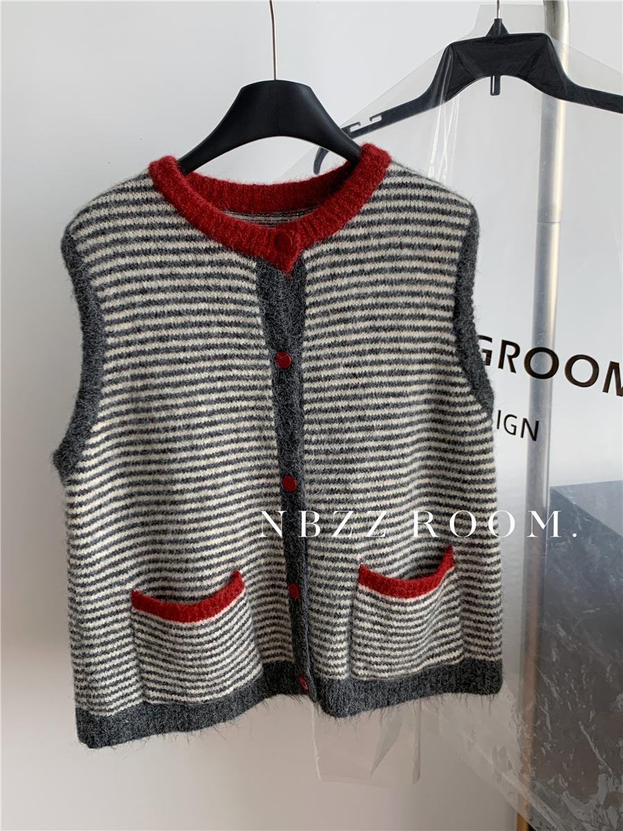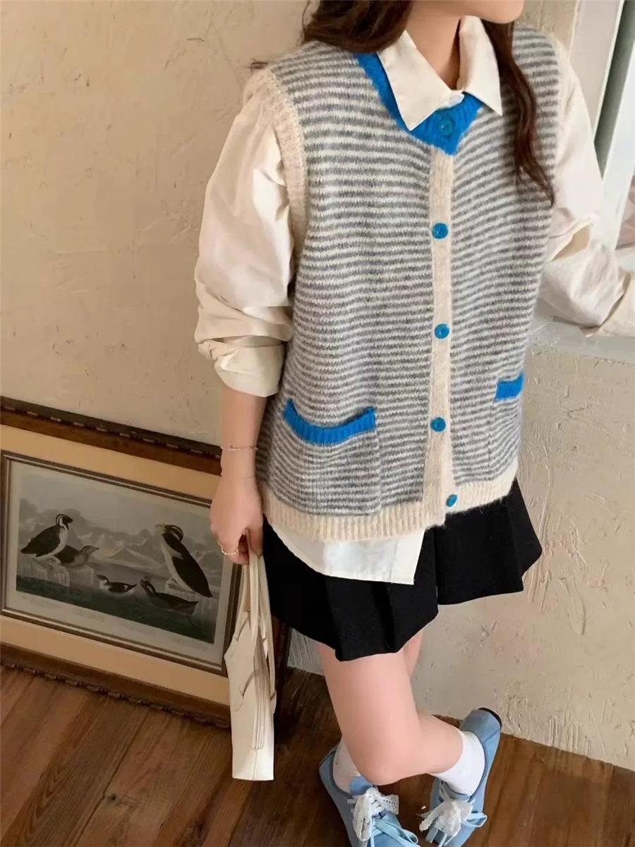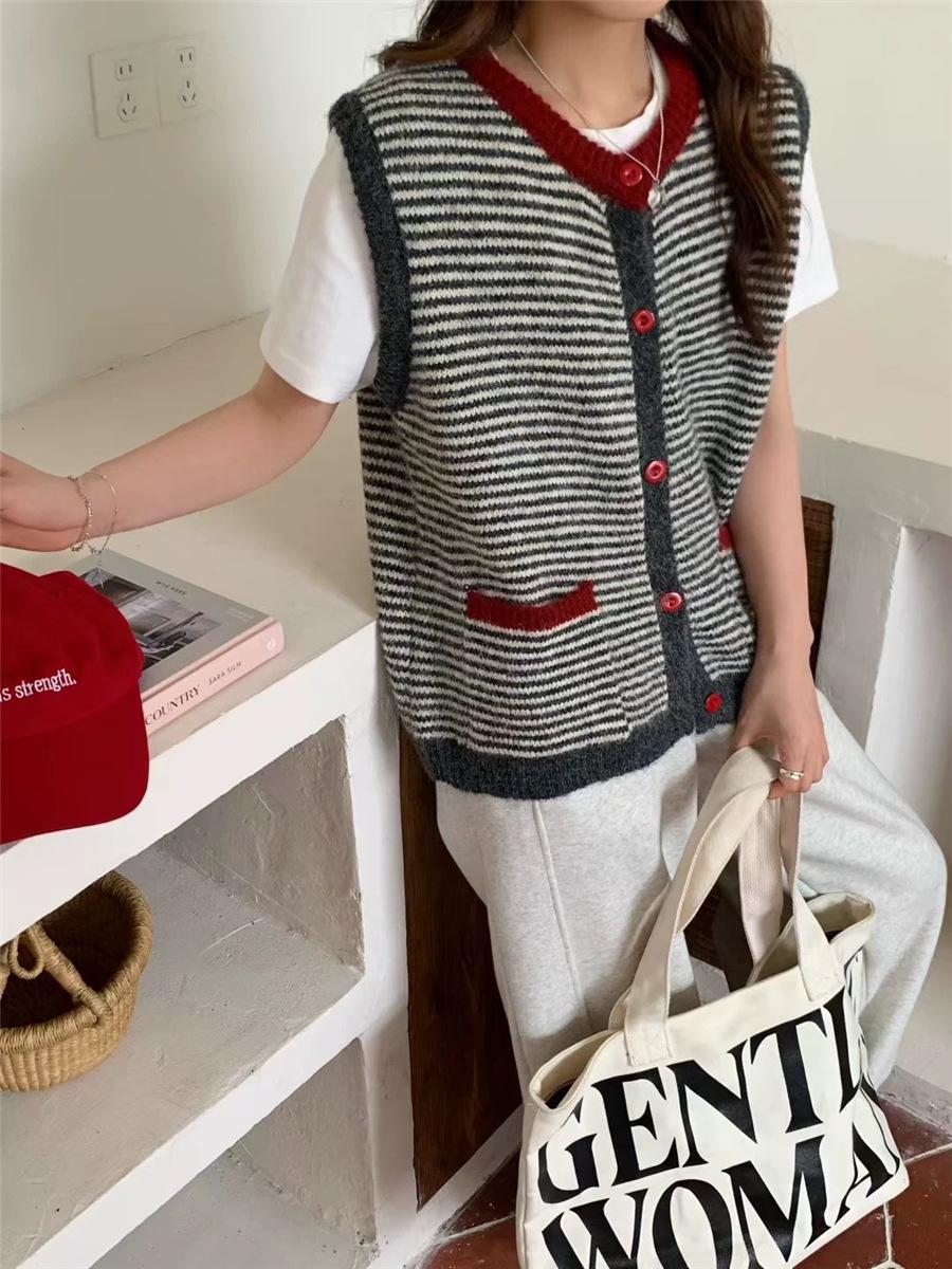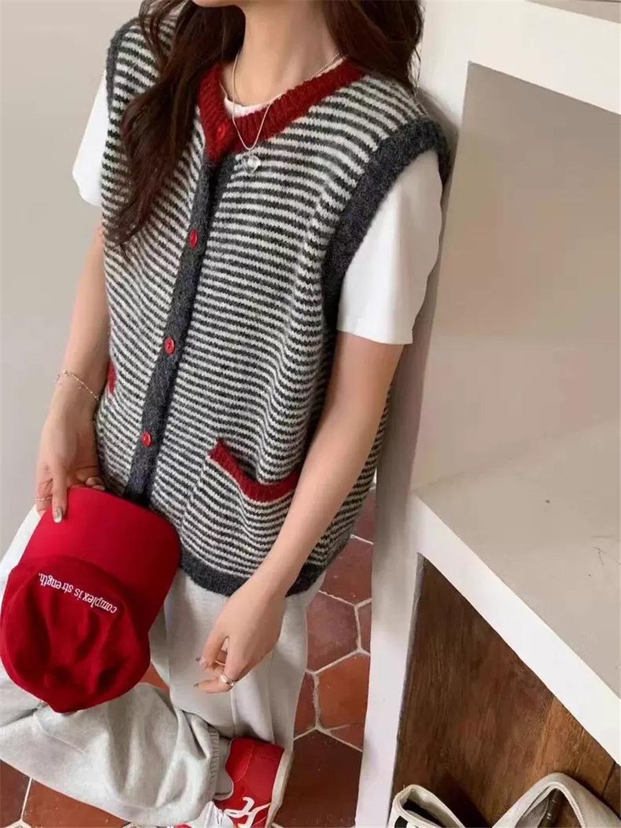 Chaleco de Punto a Rayas con Bloque de Color Retro de Lana Merino 11.5% para Mujer, Suéter Versátil para Capas, Tendencia Otoño/Invierno 2025