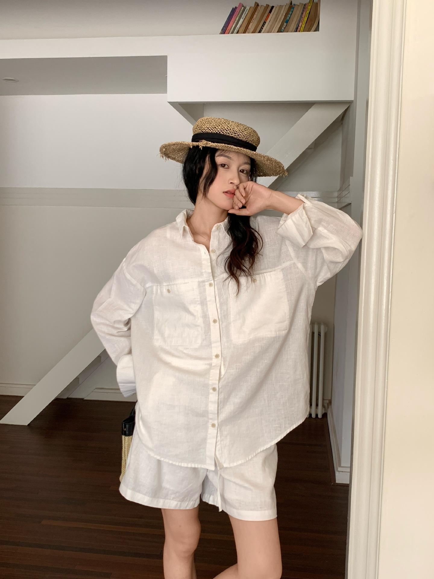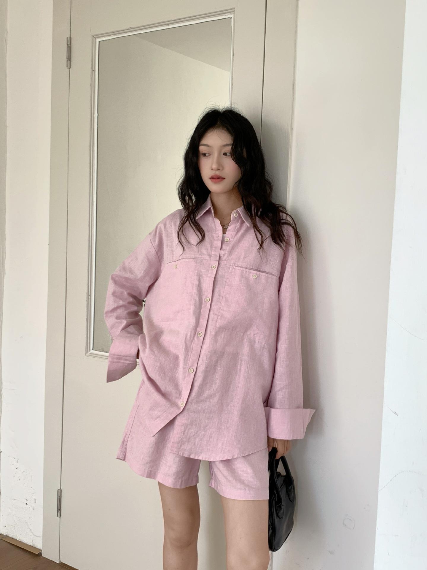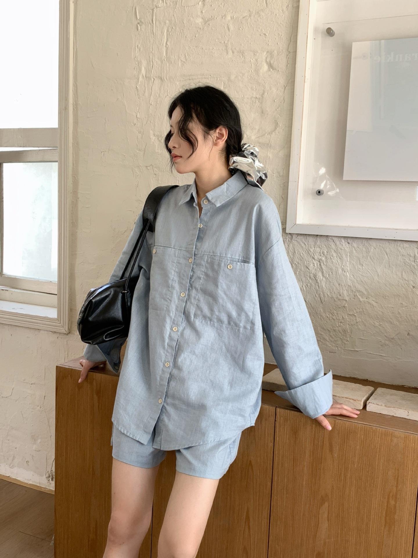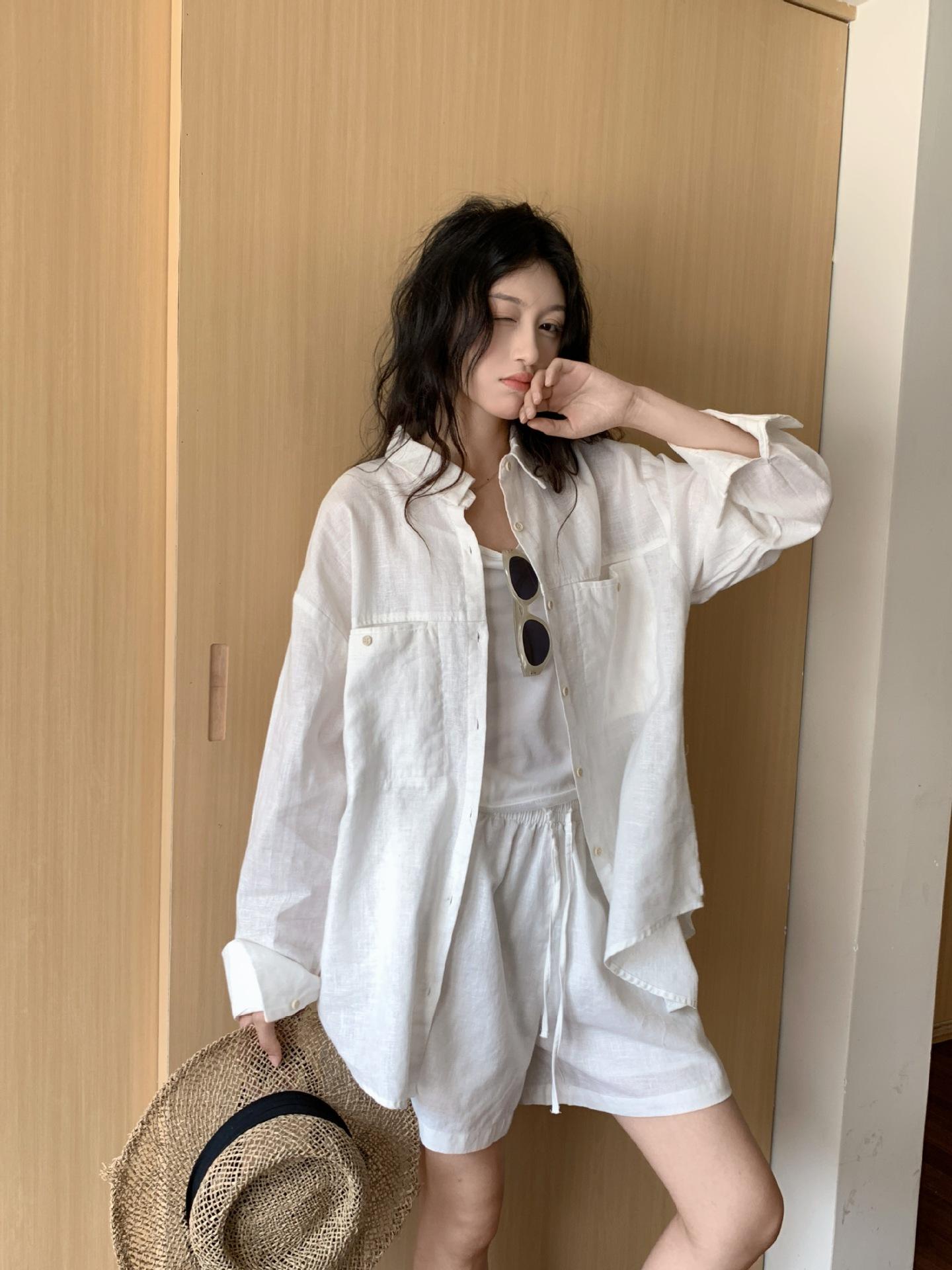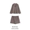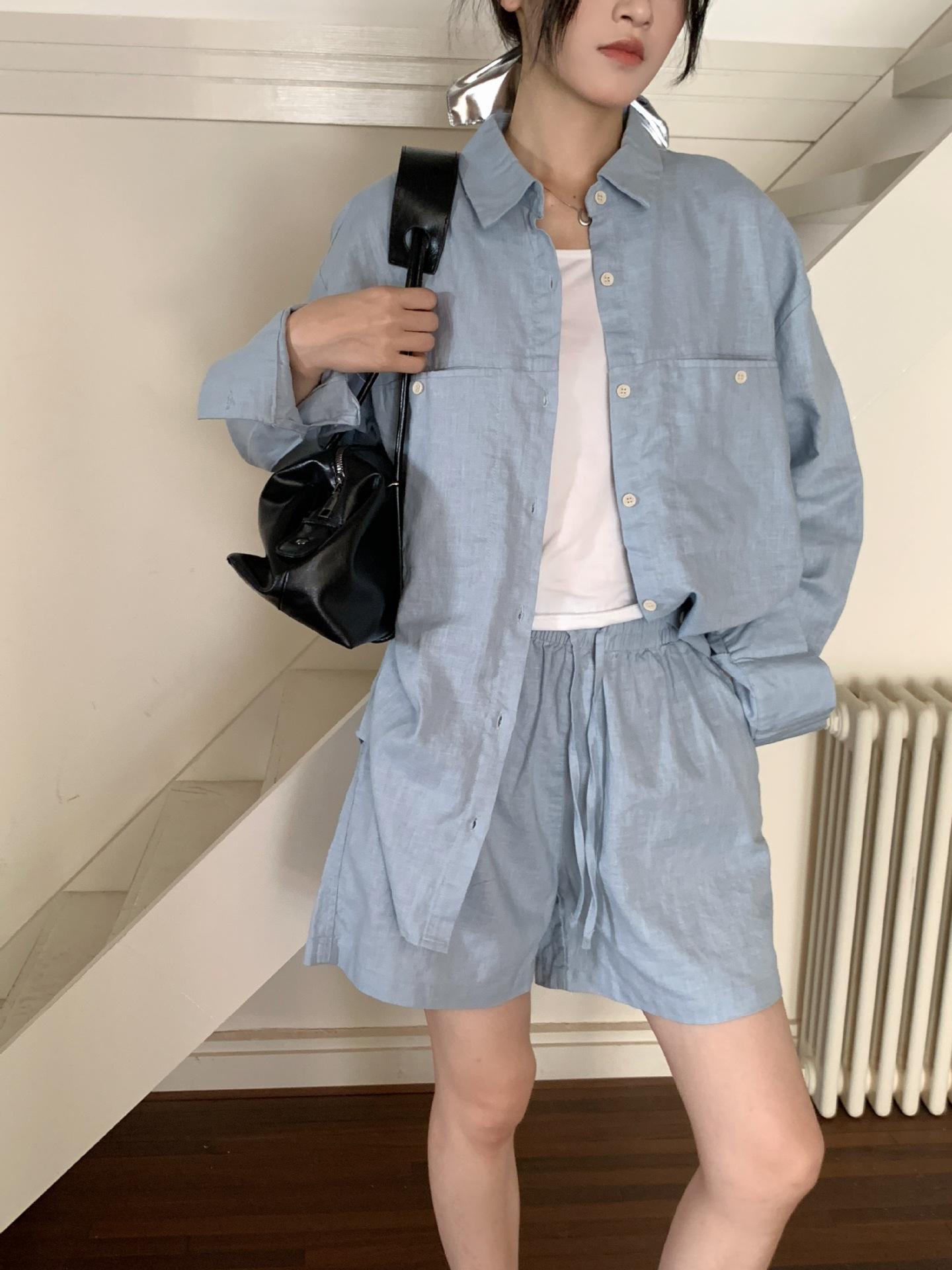 Traje Nuevo de Lino Lavado 2025 para Mujer Verano Dos Piezas de Alta Gama Slim Casual Camisa de Manga Larga Traje de Shorts