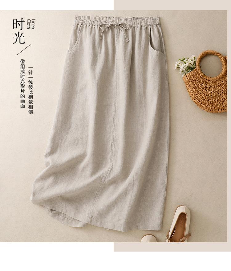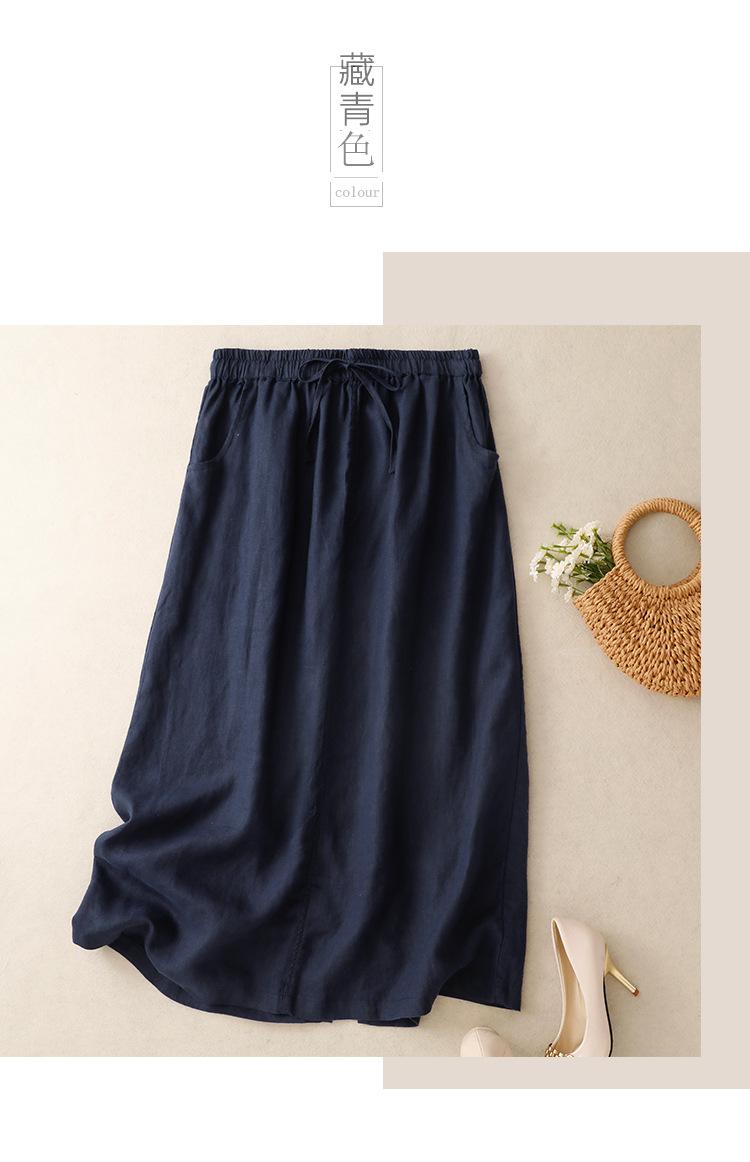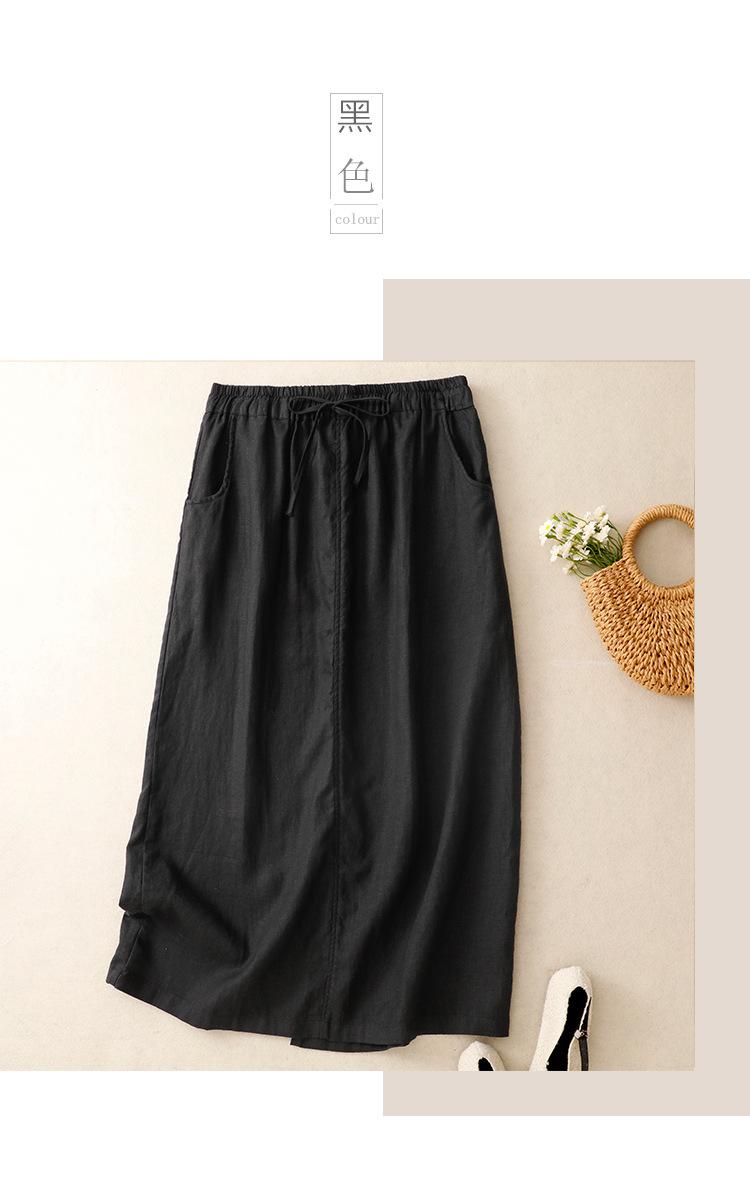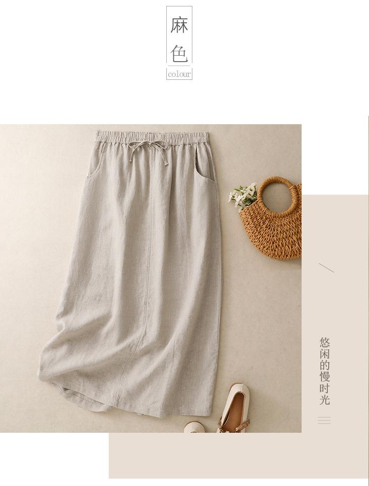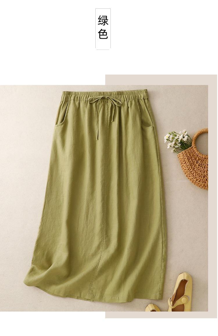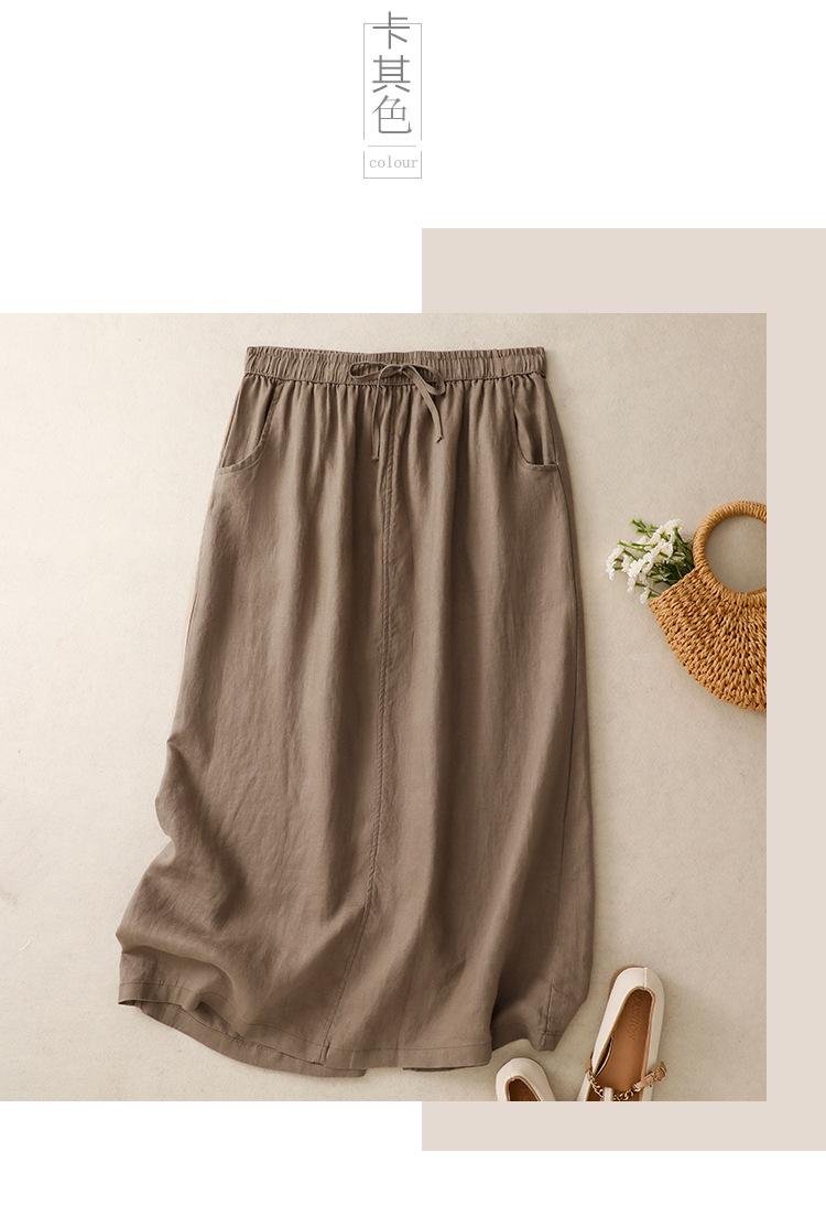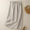 Falda de Lino Versátil de Largo Medio Literaria Adelgazante Línea A Color Sólido Lazo Falda Nueve Puntos Falda de Lino Fresca