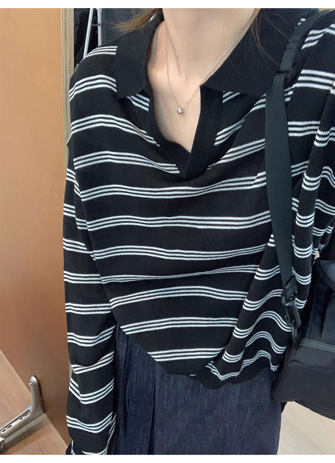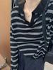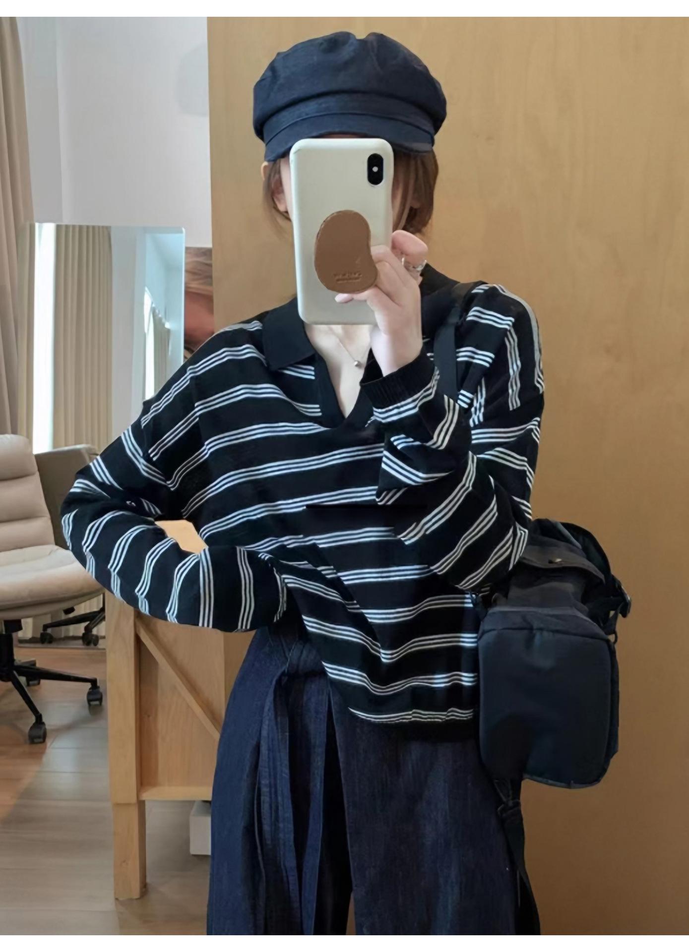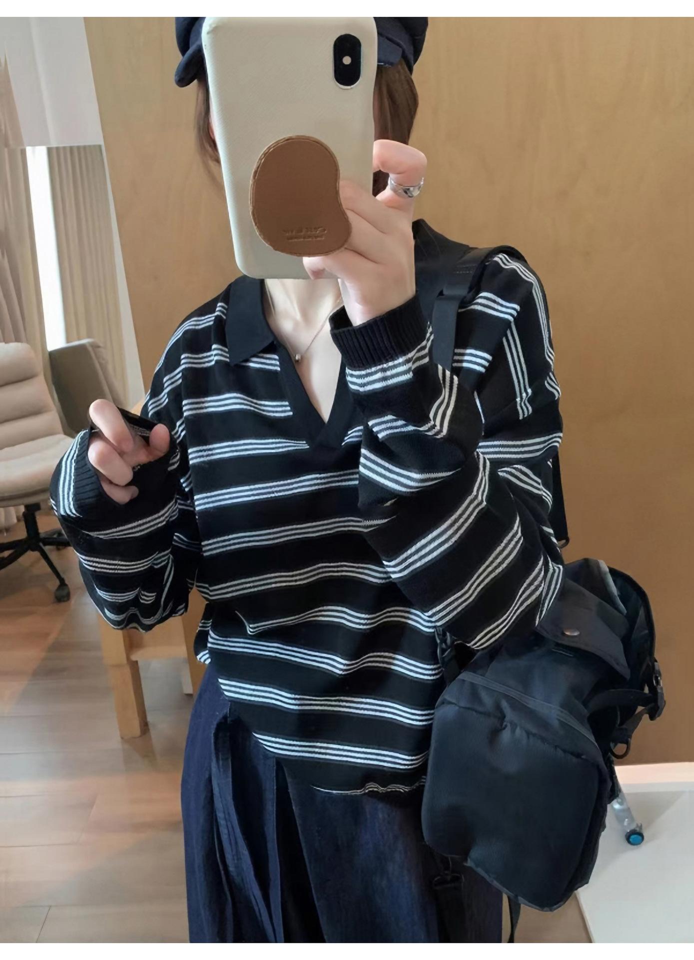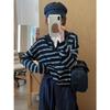 Suéter de Punto Holgado a Rayas con Cuello Polo de Estilo Retro Lazy para Mujer Primavera y Otoño 2025 Nuevo Top Casual de Manga Larga