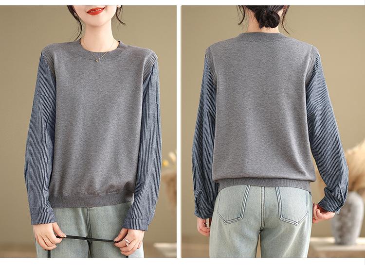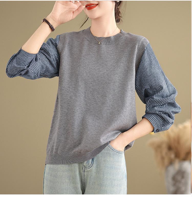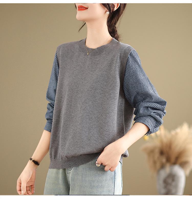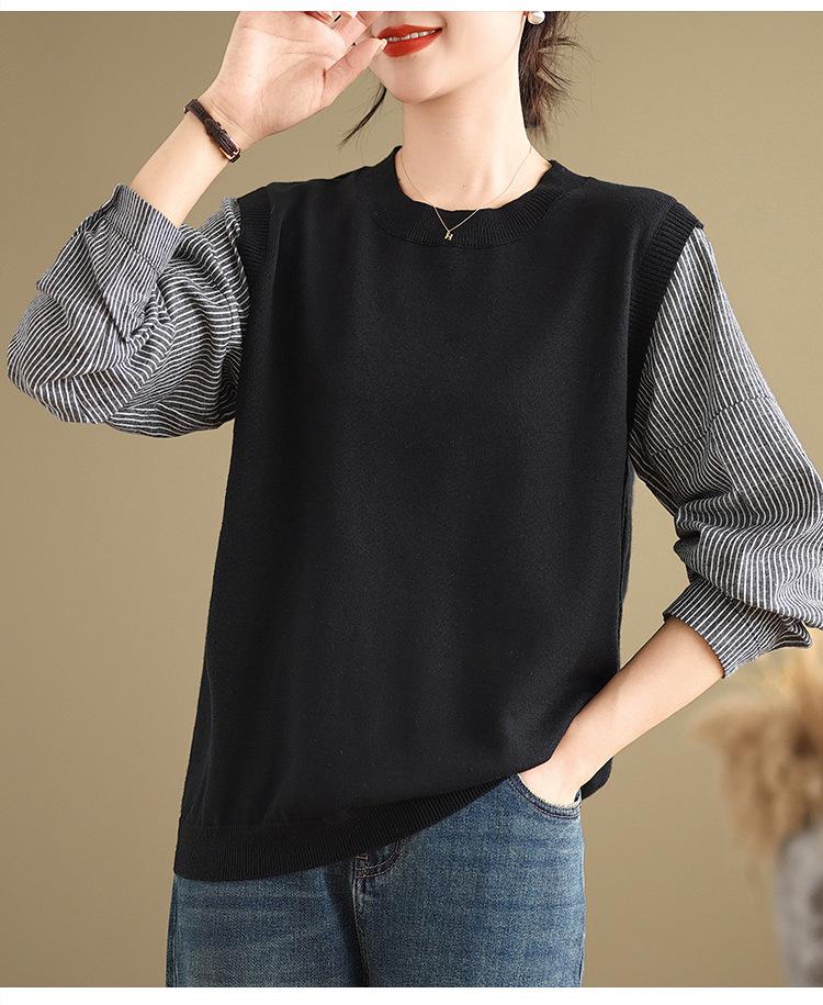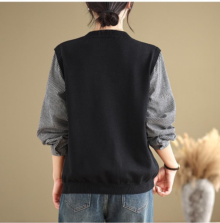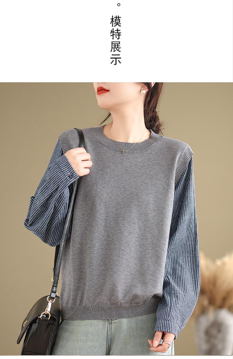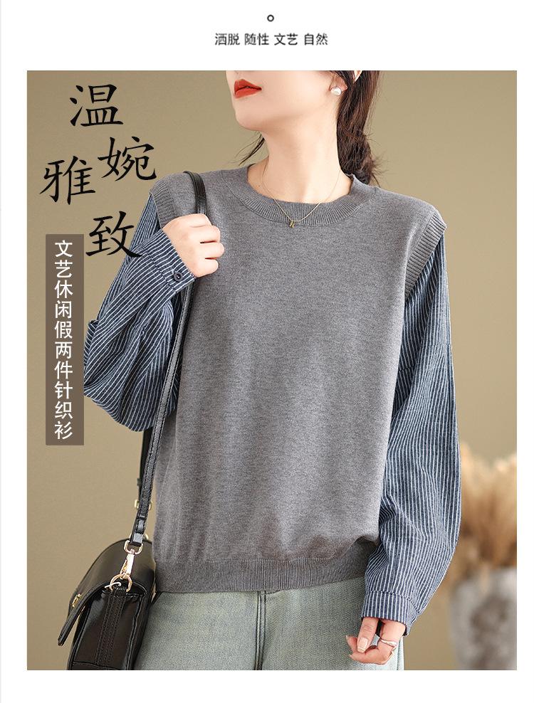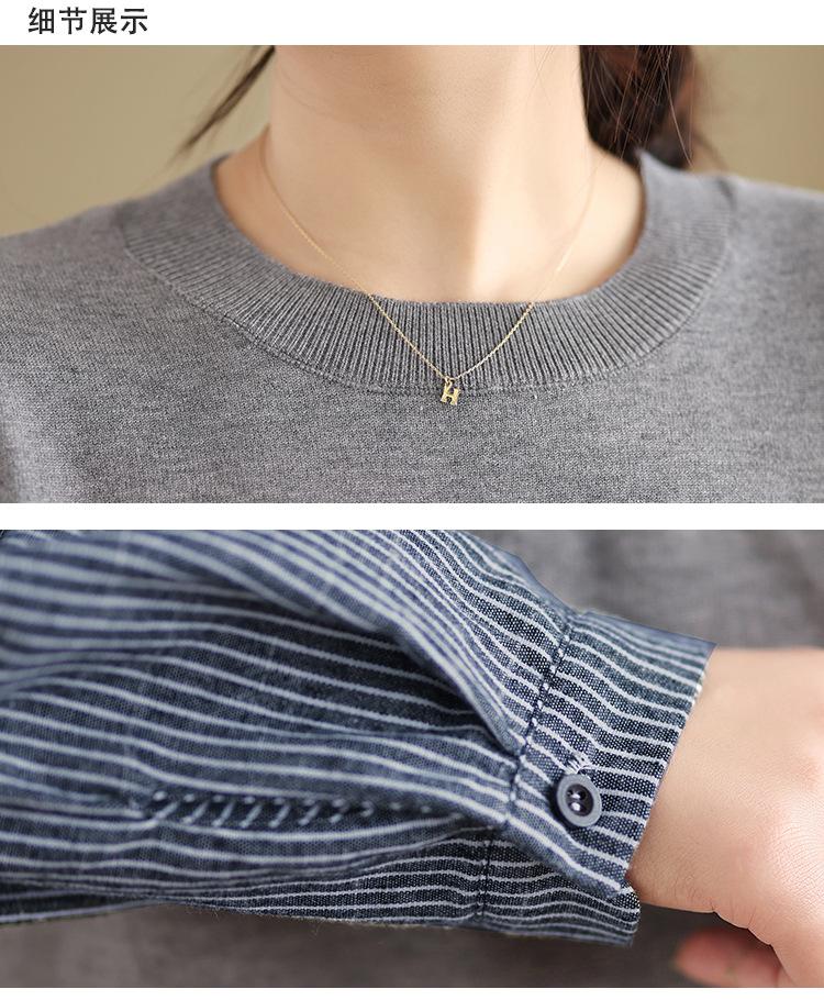 Toma real en stock otoño nuevo suéter de patchwork a rayas estilo holgazán camiseta top mujeres sentido del diseño top de dos piezas falsas