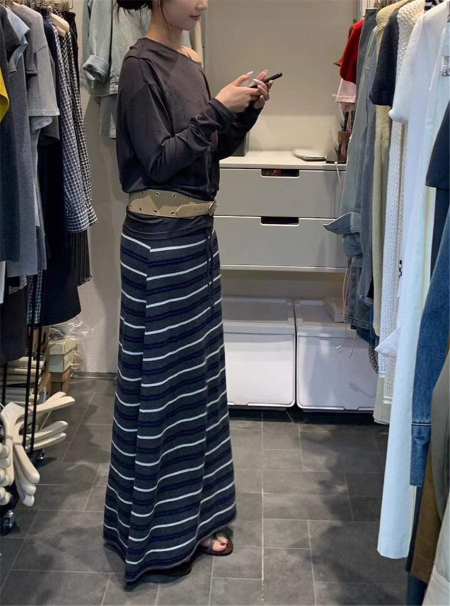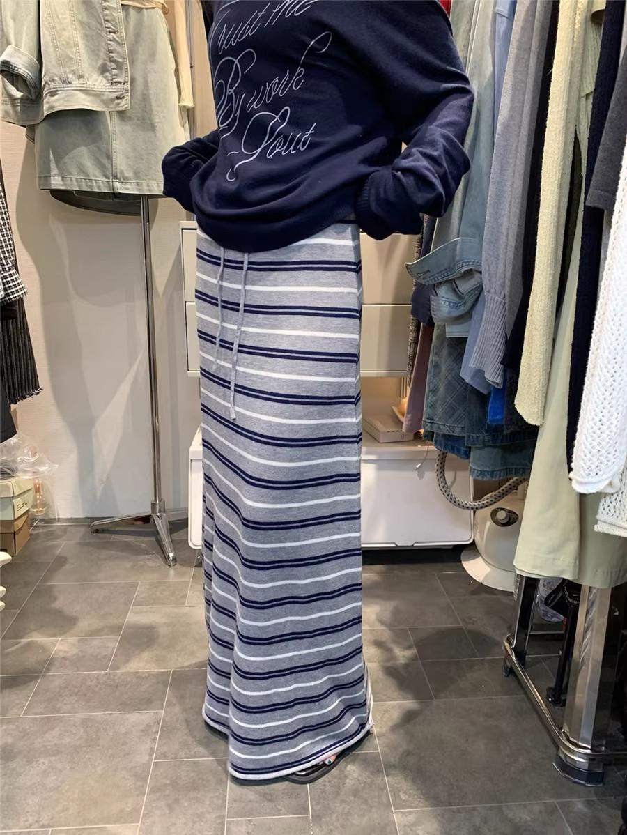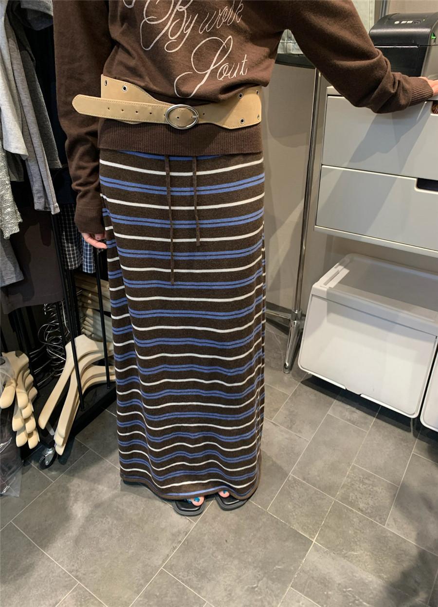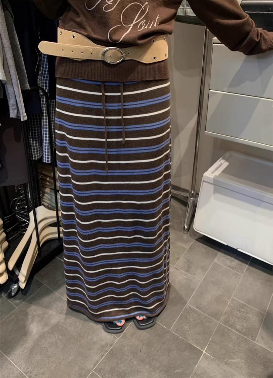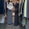 Chic coreano otoño nuevo retro nicho cintura alta anudada color block rayas falda midi ceñida a la cadera falda larga