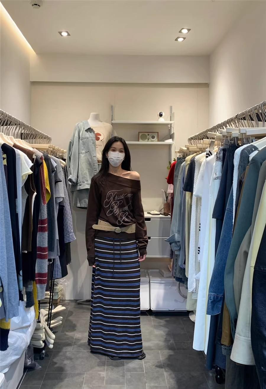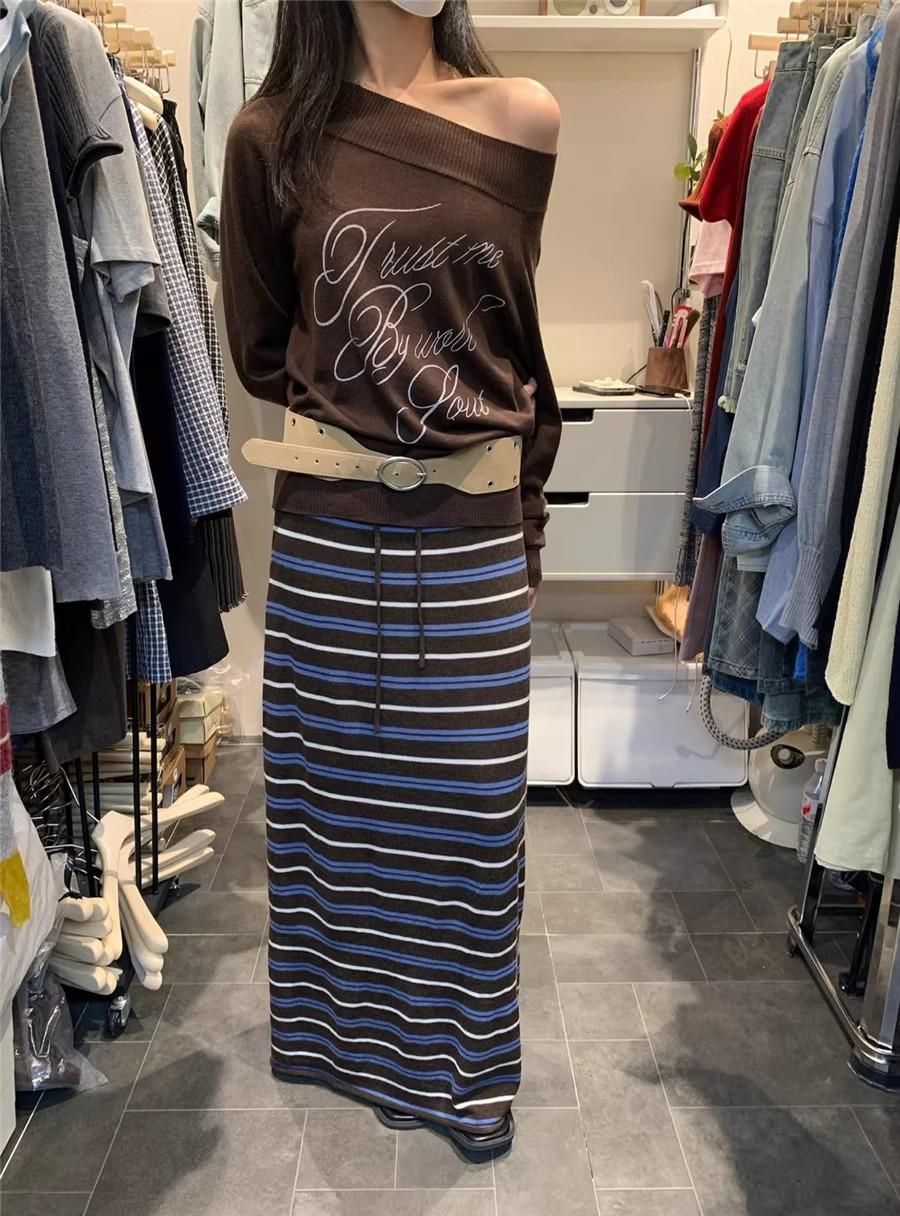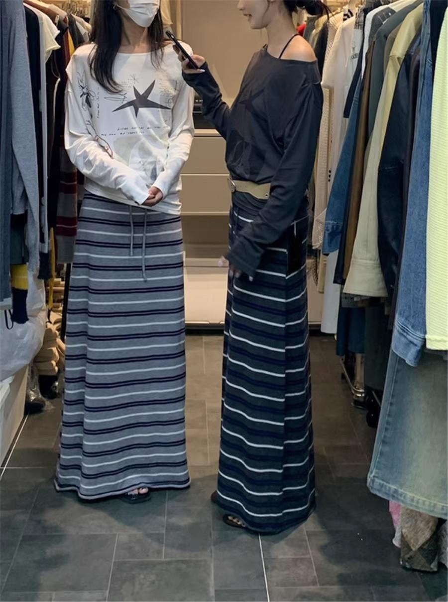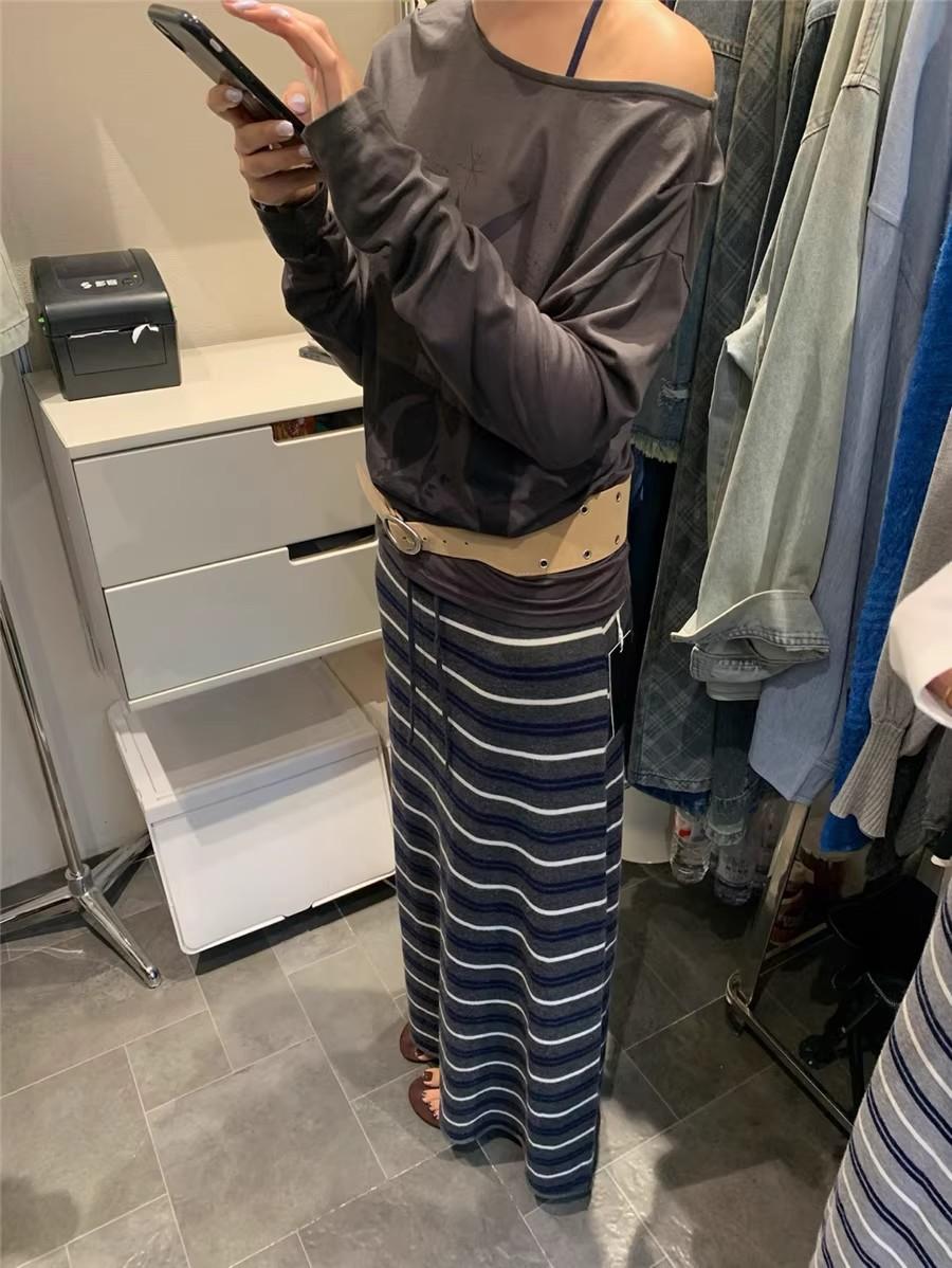 Chic coreano otoño nuevo retro nicho cintura alta anudada color block rayas falda midi ceñida a la cadera falda larga