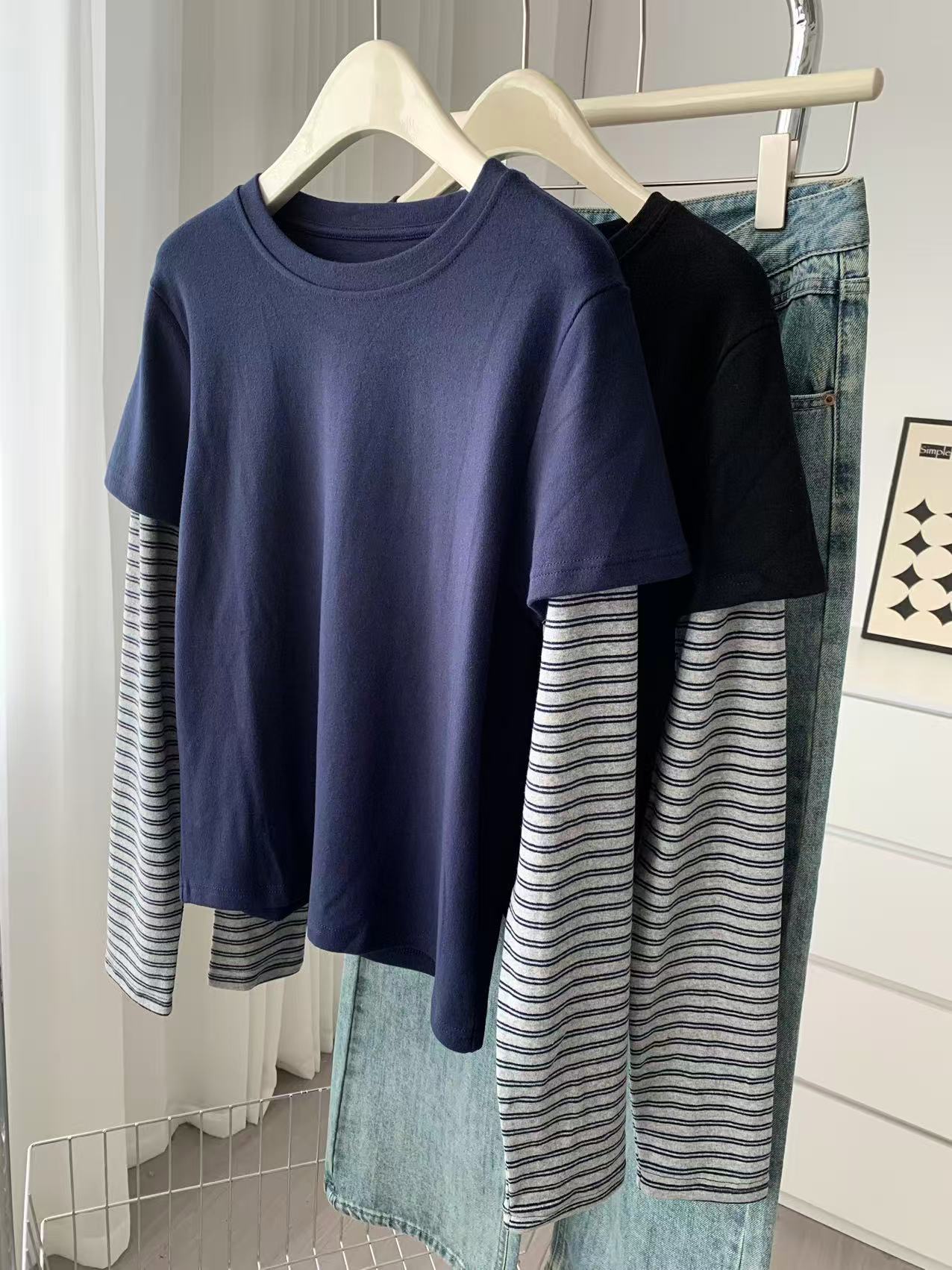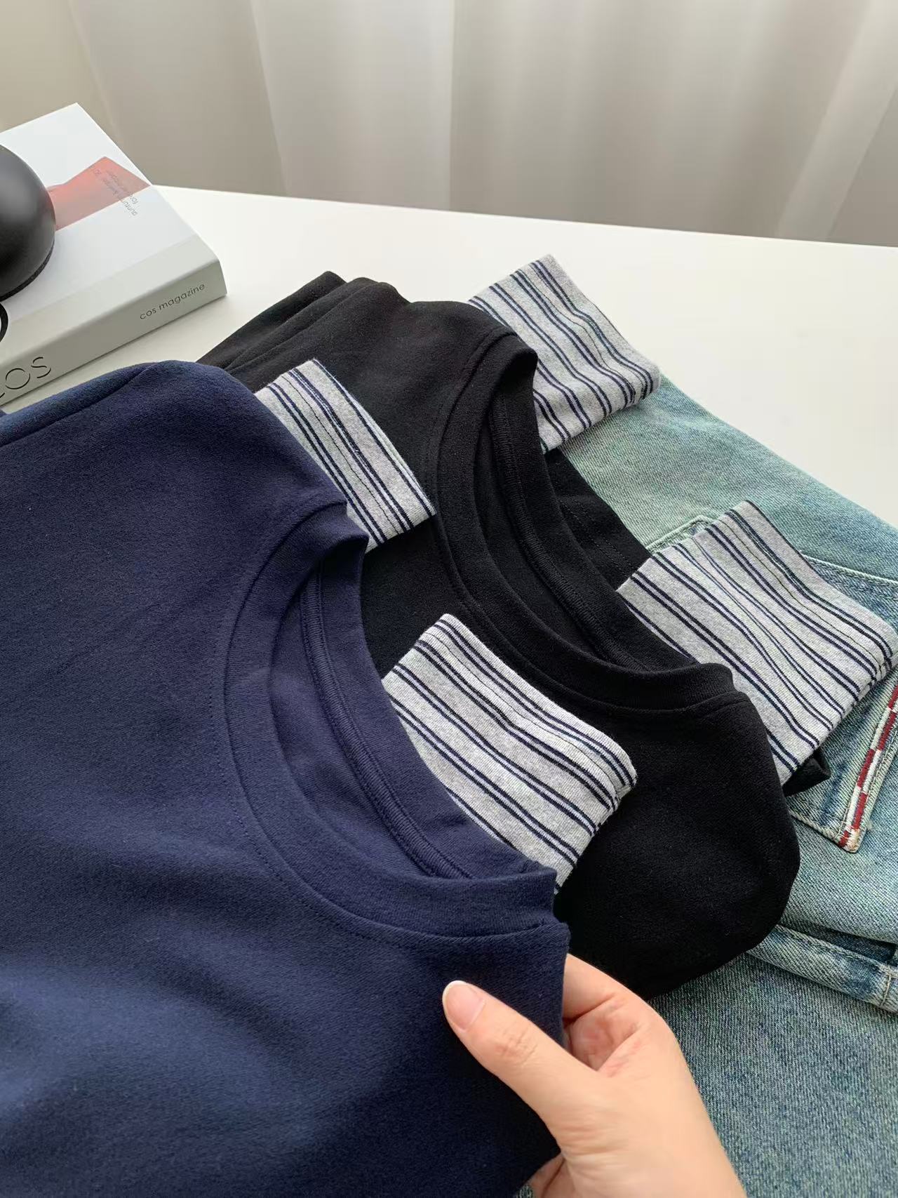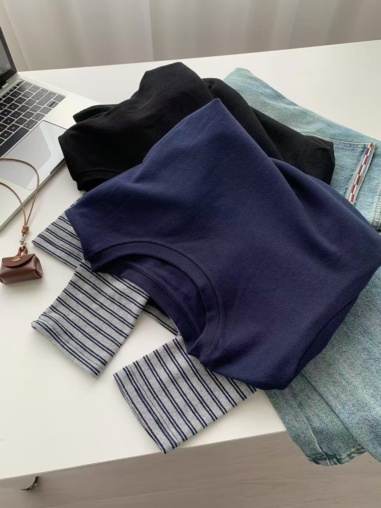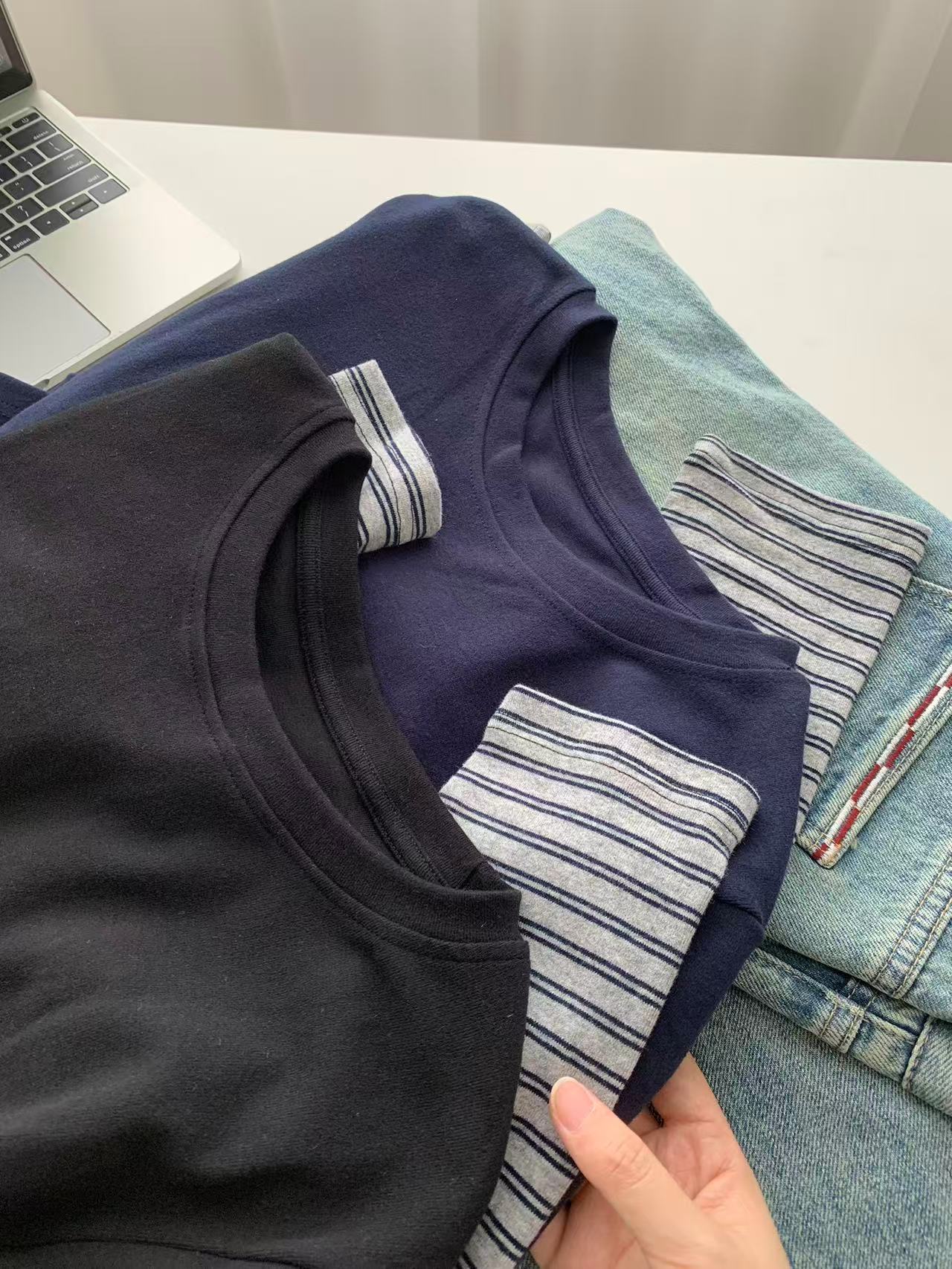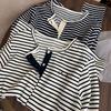 Sentido del diseño Camiseta de manga larga a rayas patchwork estilo coreano mujeres moda retro chic 25 otoño/invierno cepillada cuello redondo camisa base