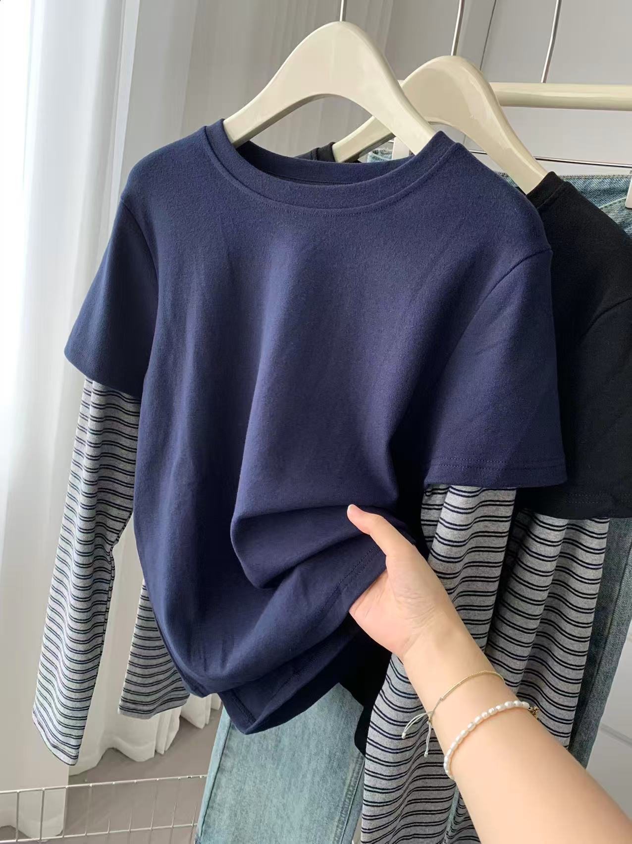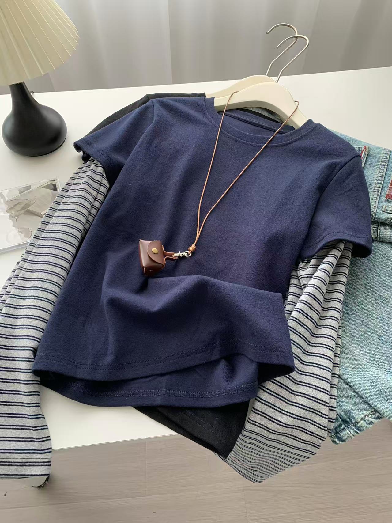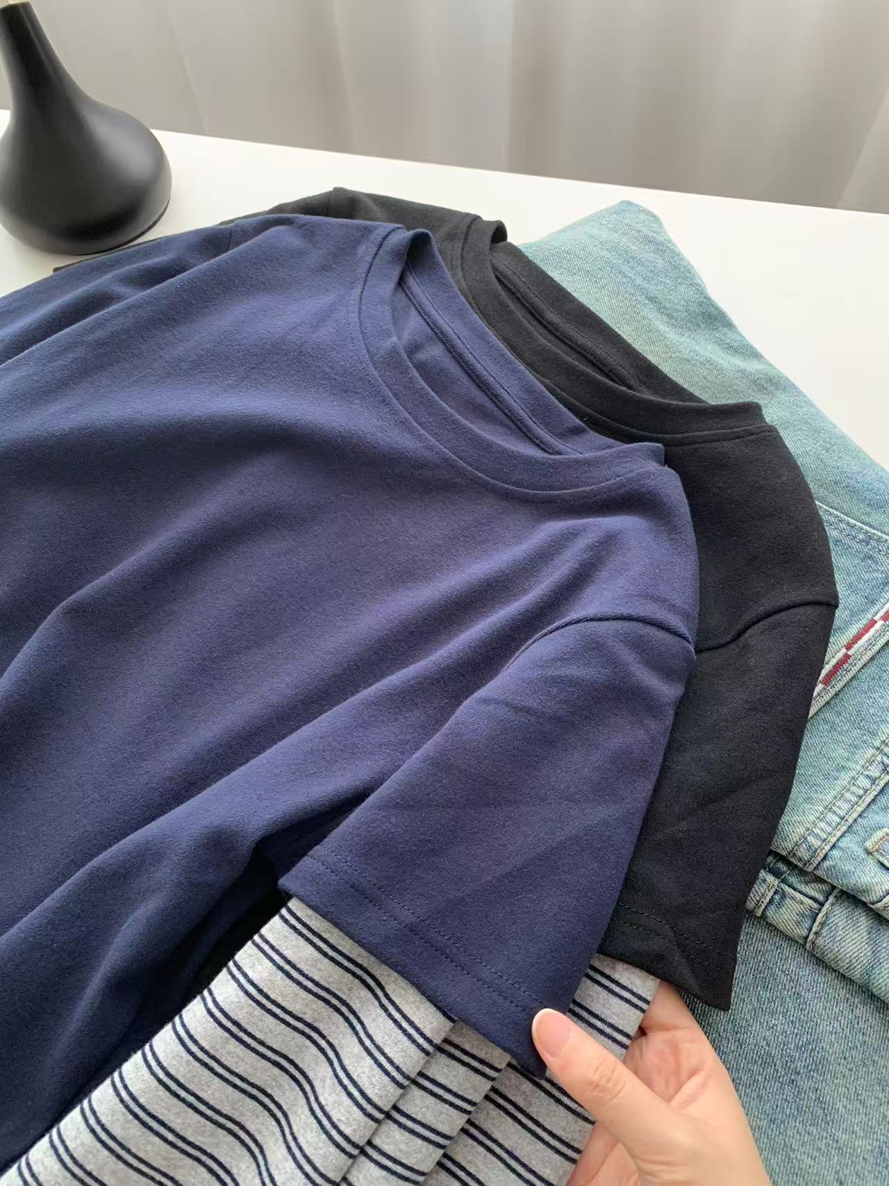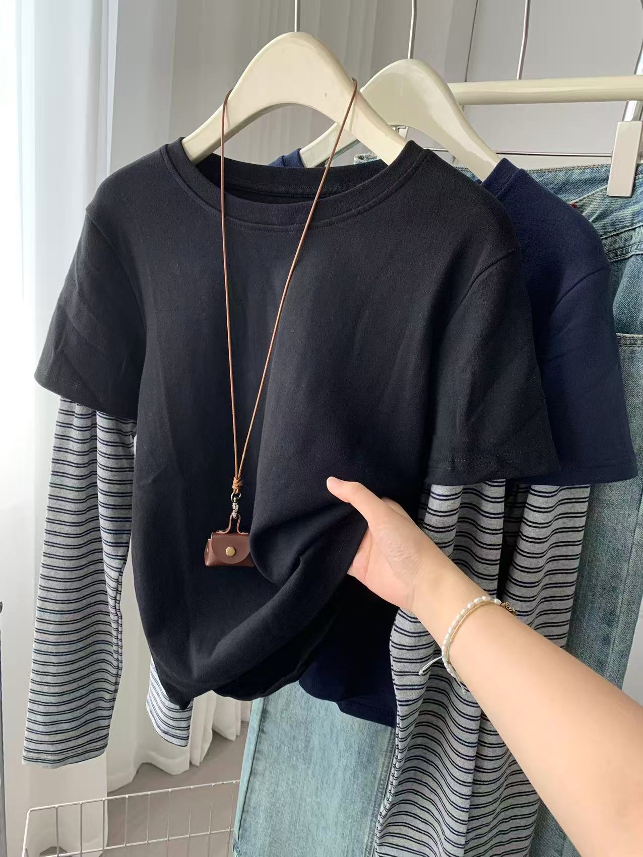 Sentido del diseño Camiseta de manga larga a rayas patchwork estilo coreano mujeres moda retro chic 25 otoño/invierno cepillada cuello redondo camisa base