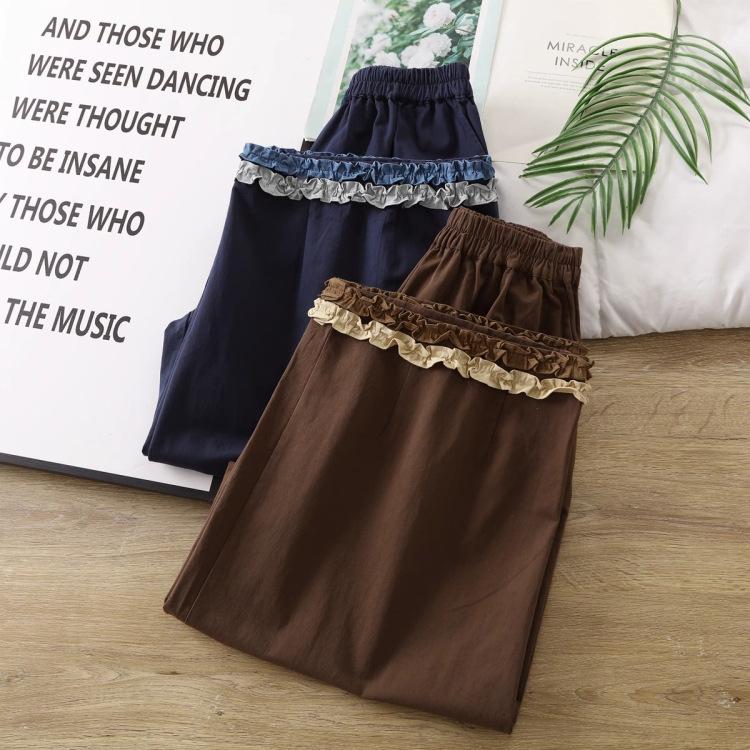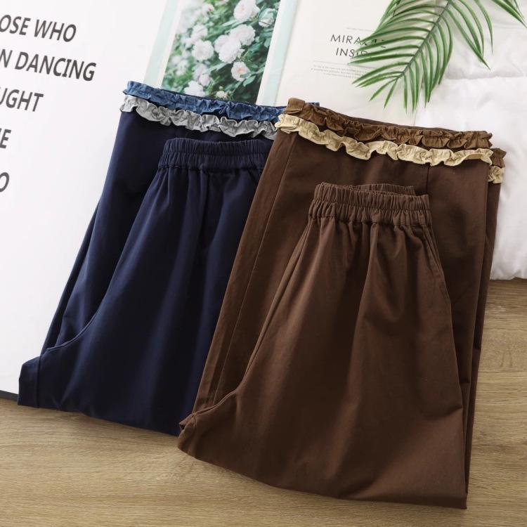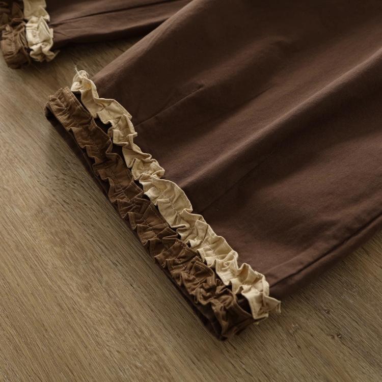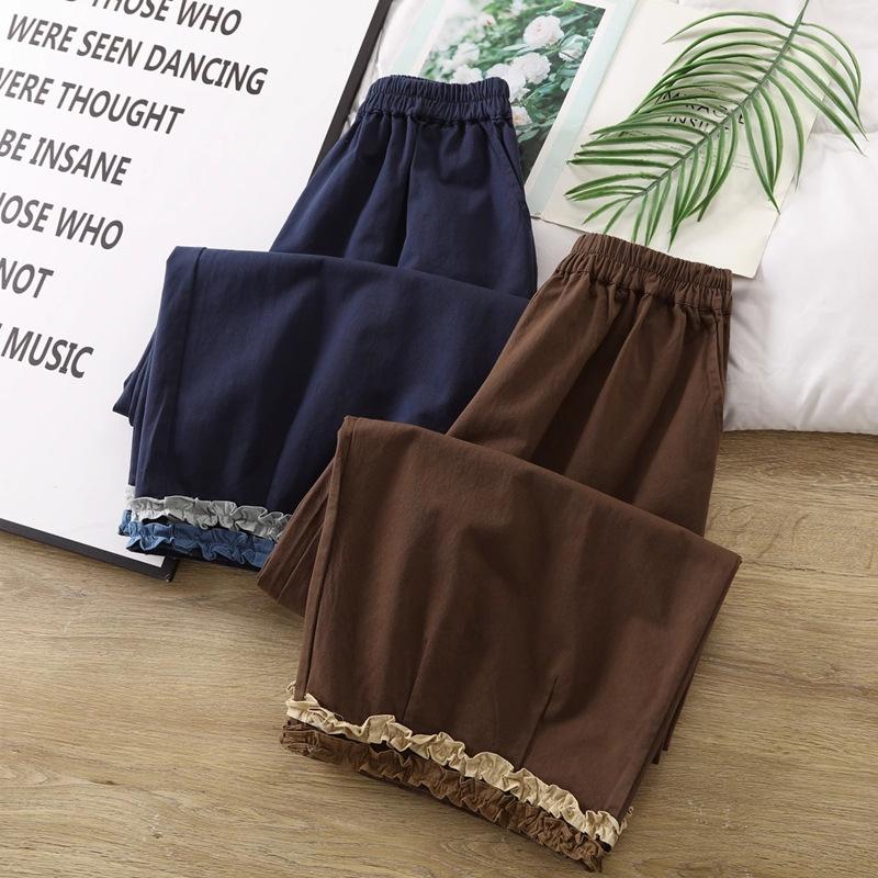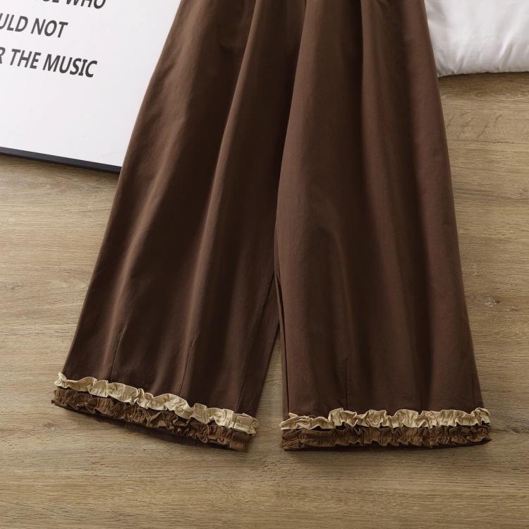 Foto Real En Stock Verano Bloque de Color Borde con Volantes Reductor de Edad Pantalones de Pierna Ancha para Mujer Pantalones Casuales Retro Empalmados de Pierna Recta Versátiles para Mujer