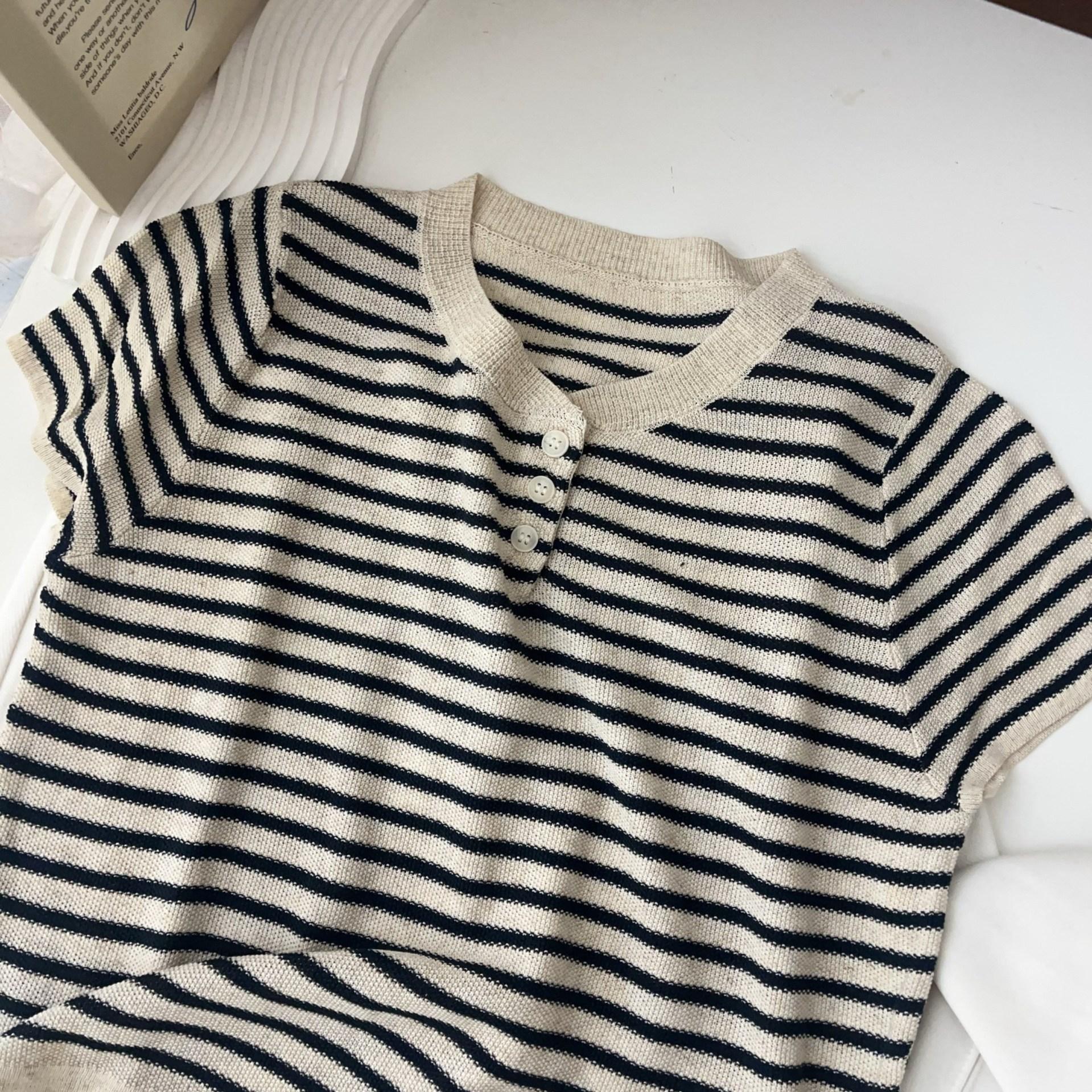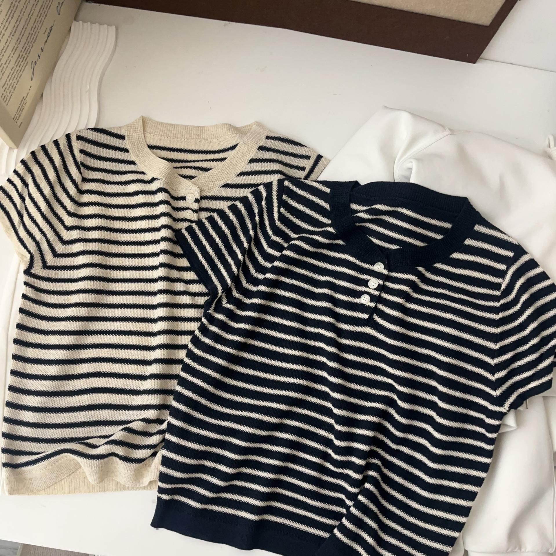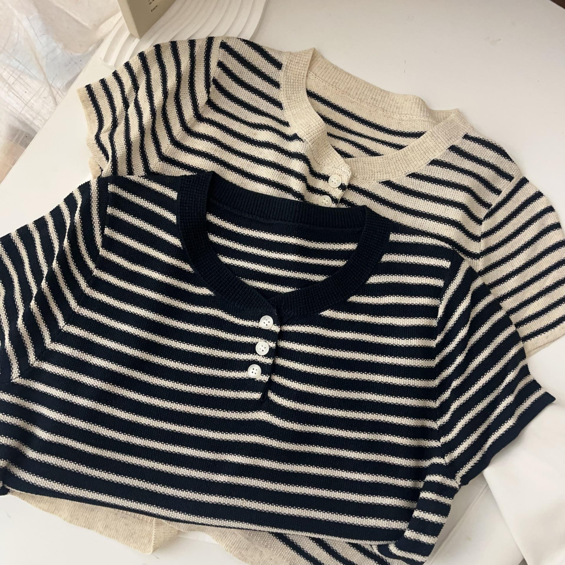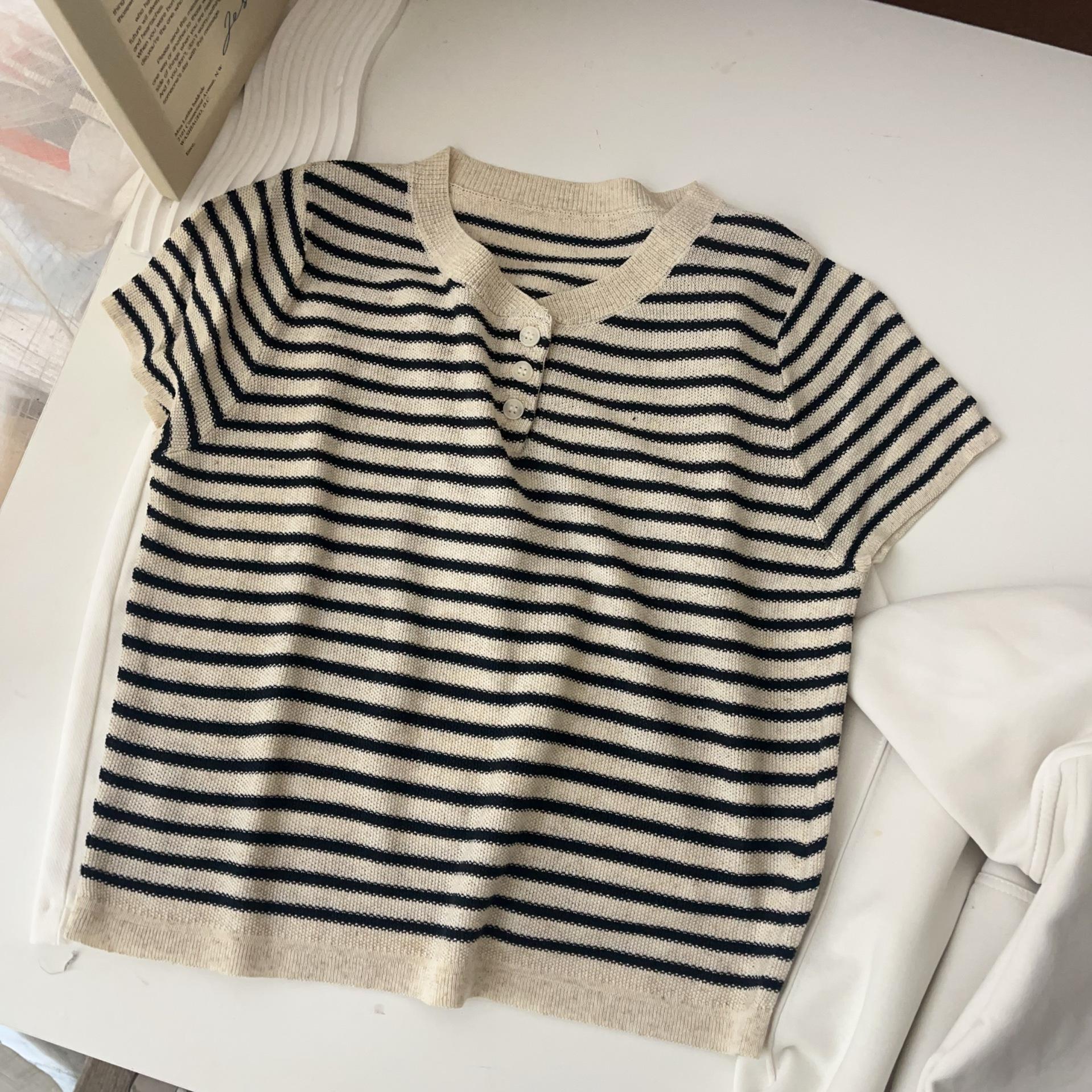 2025 Nuevo Verano Estilo Coreano Moda Versátil Suéter Rayado Manga Corta Elegante Cuello Redondo Contraste Top Sencillo