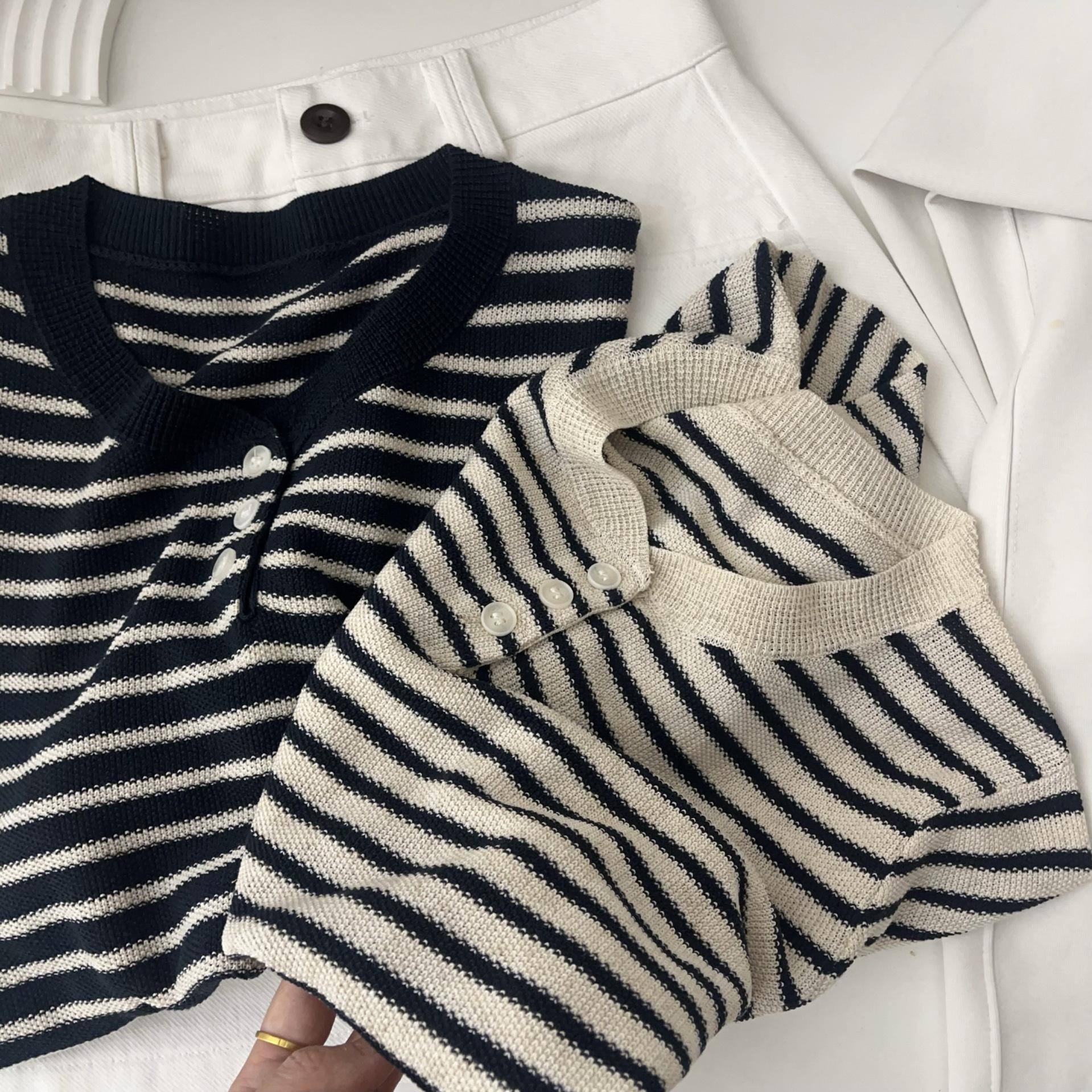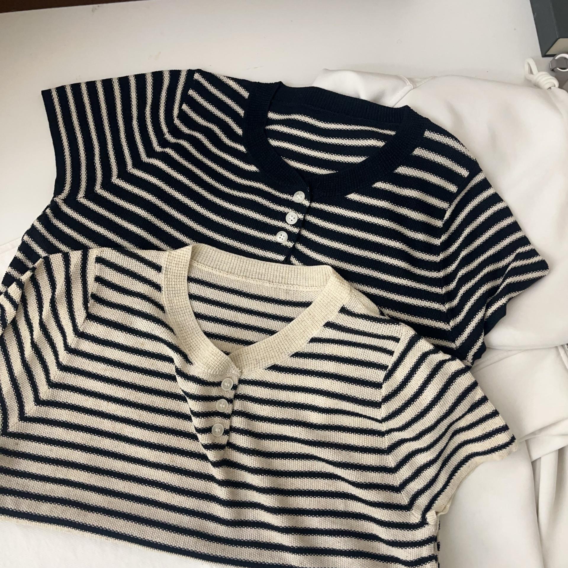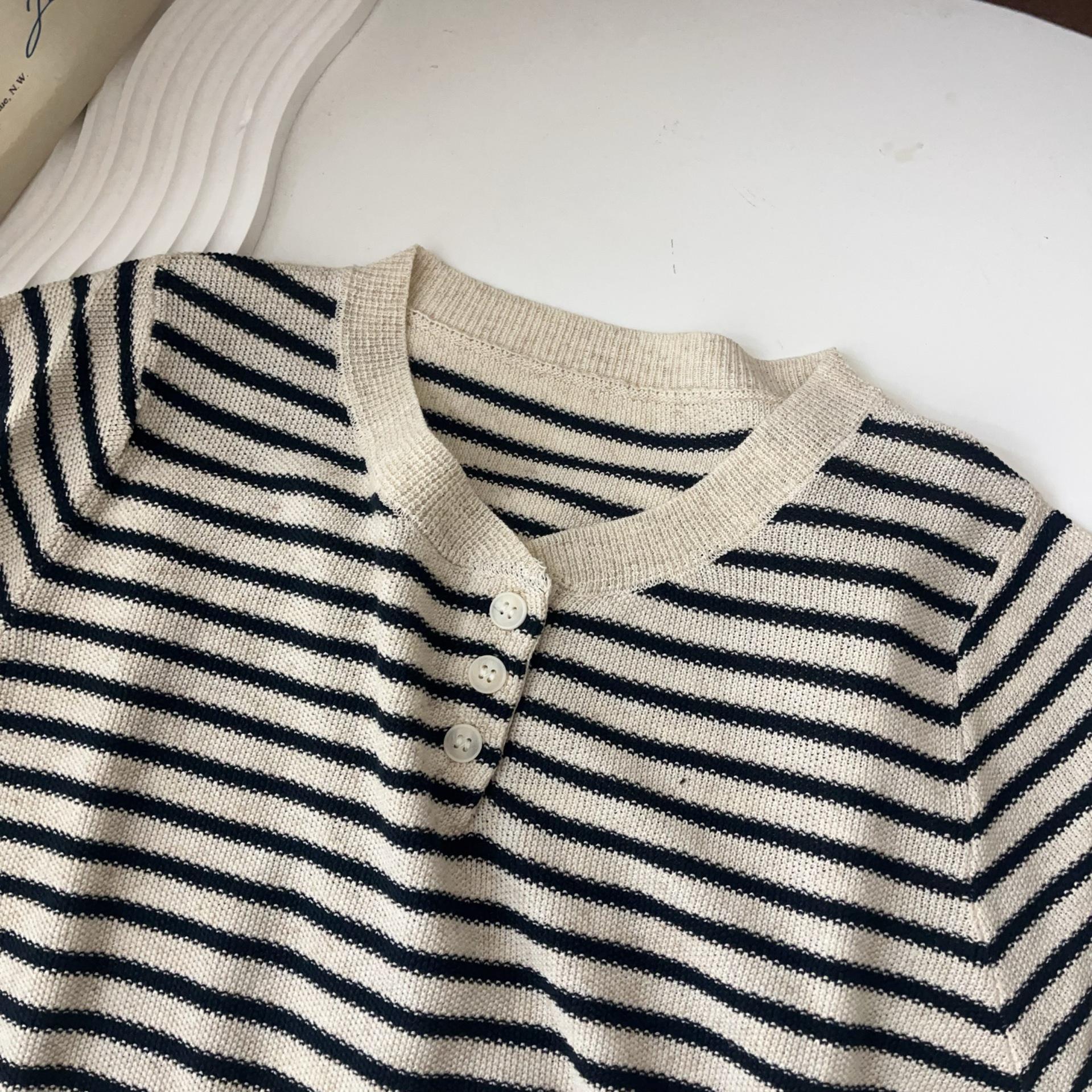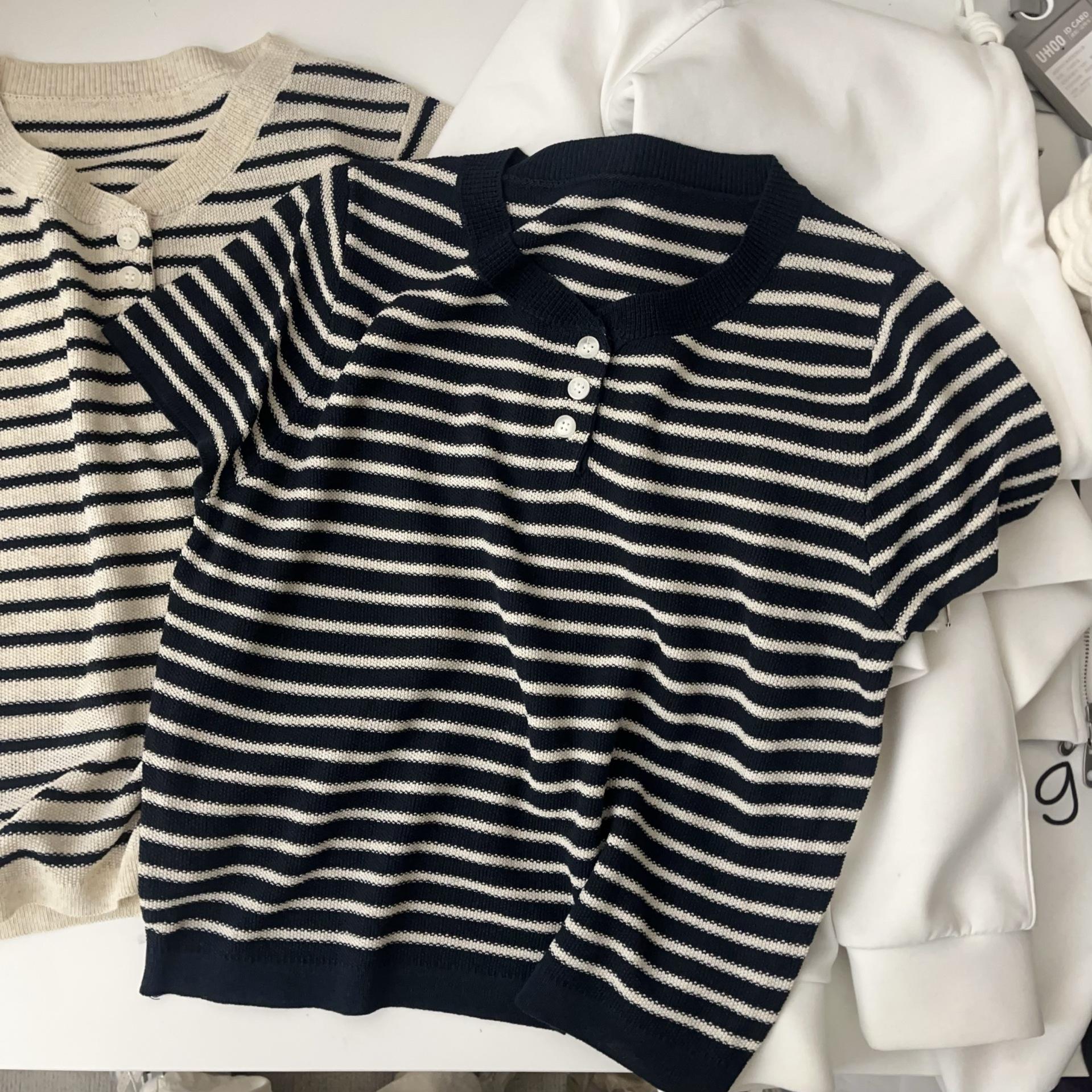2025 Nuevo Verano Estilo Coreano Moda Versátil Suéter Rayado Manga Corta Elegante Cuello Redondo Contraste Top Sencillo
