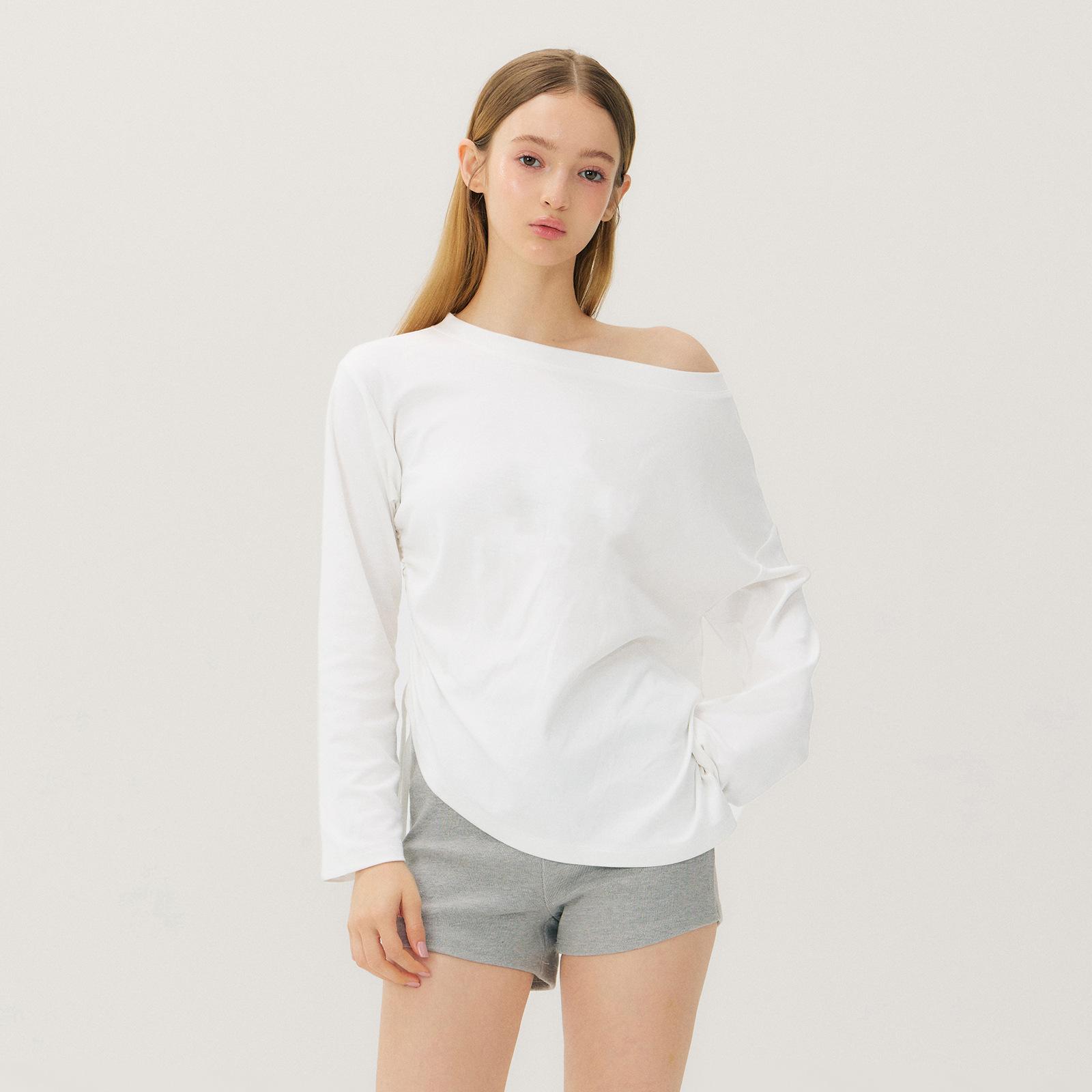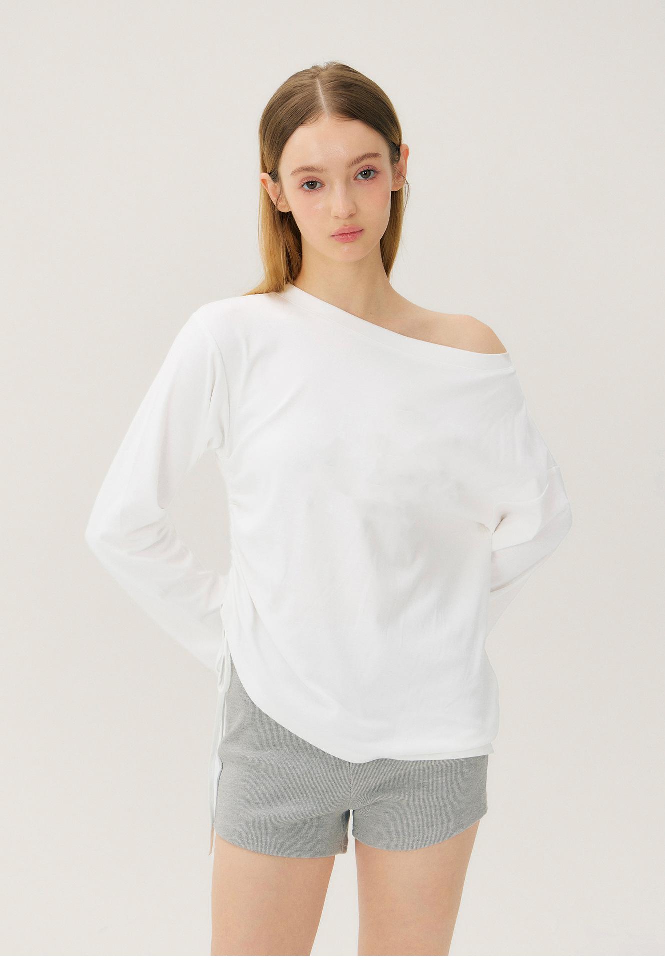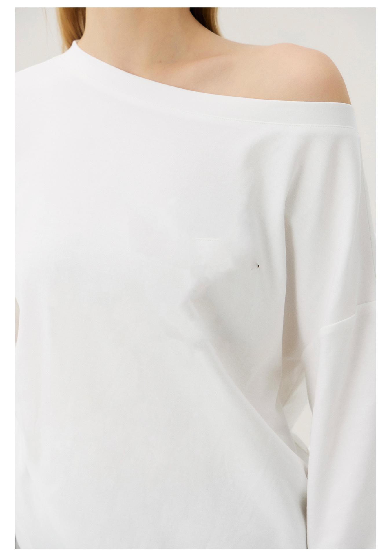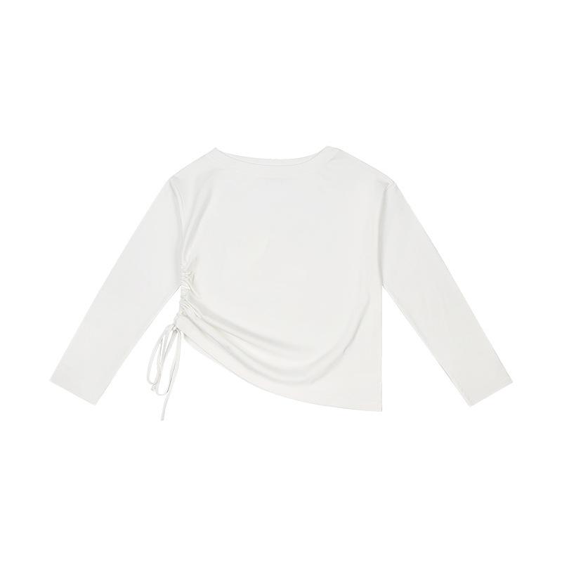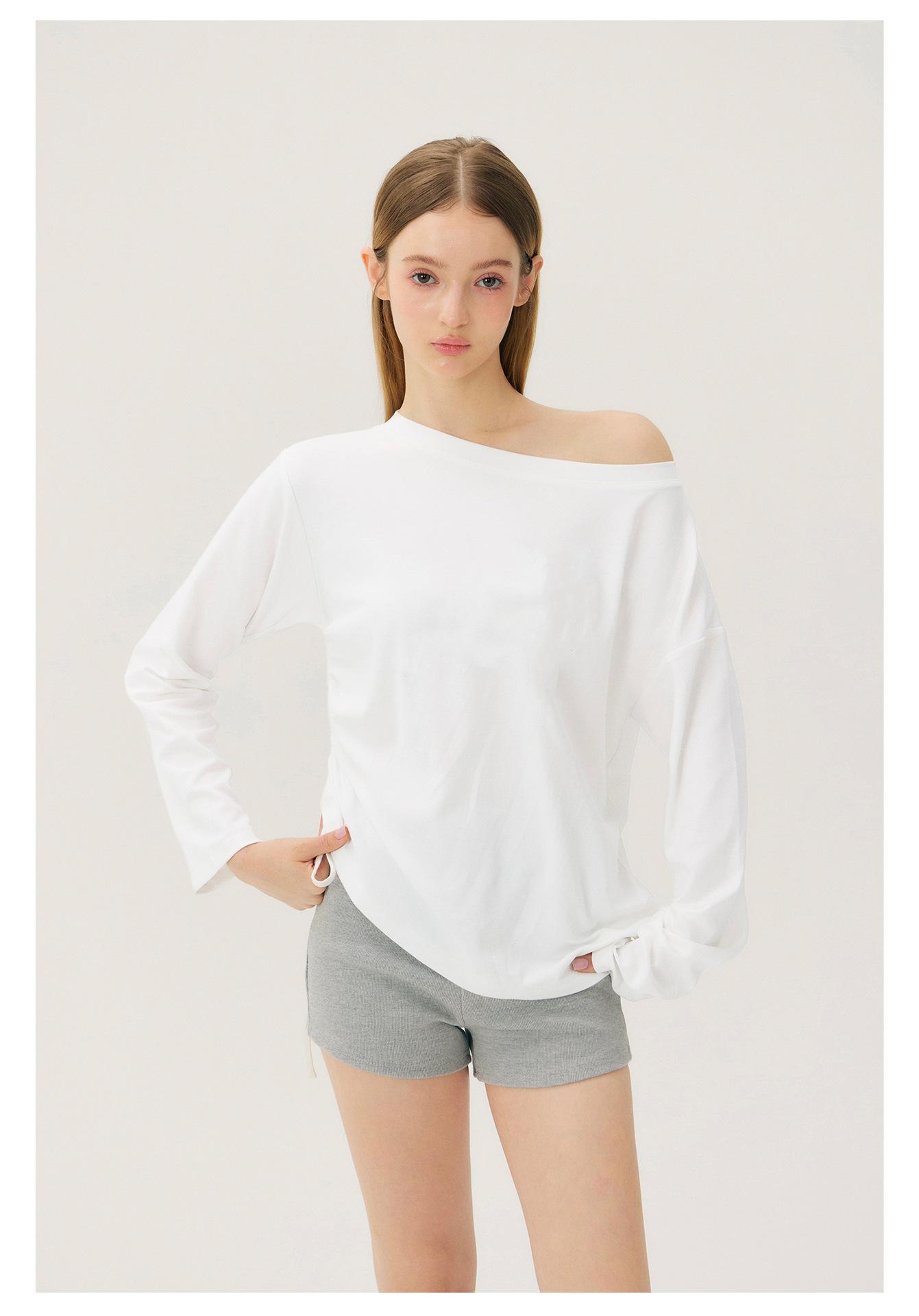 Diseño puro y sexy top de hombros descubiertos con escote asimétrico, manga larga, para mujer, otoño, cintura con cordón ajustable, blanco, holgado, ropa de mujer, camiseta de manga larga