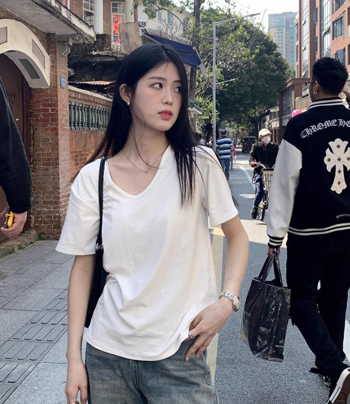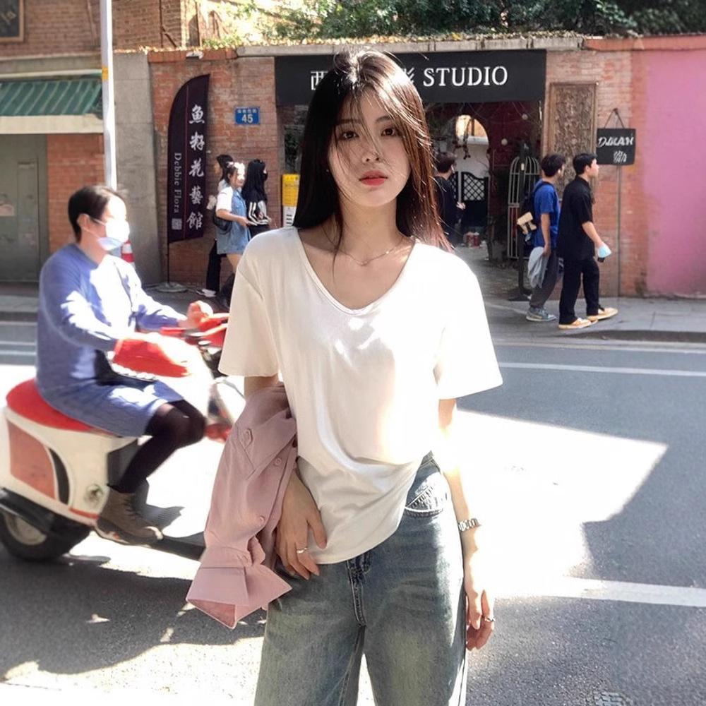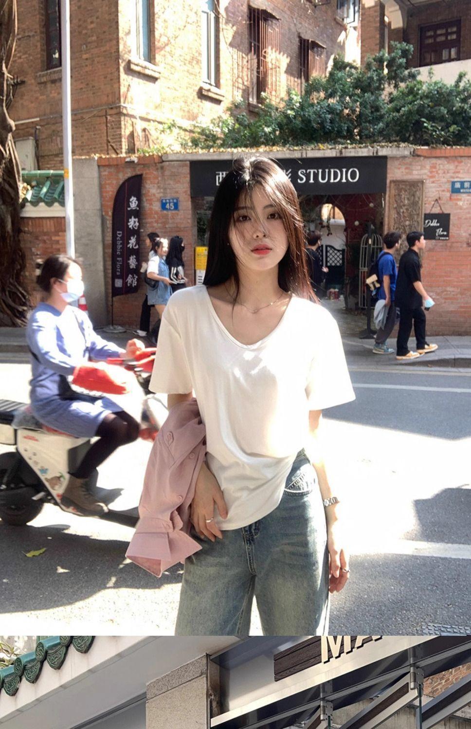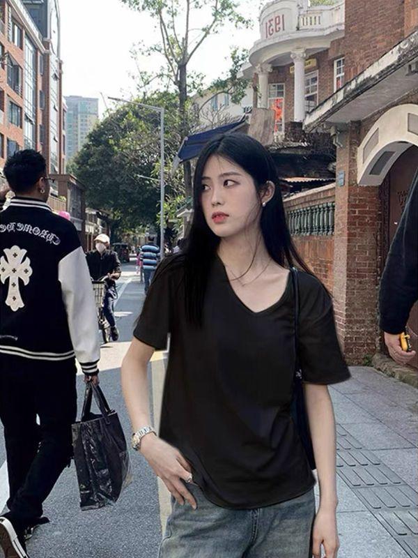 Playera de Manga Corta con Cuello en V de Estilo Holgazán para Mujer 2025 Nuevo Verano Delgada Suelta Casual Moda Color Puro Versátil Top Trendy