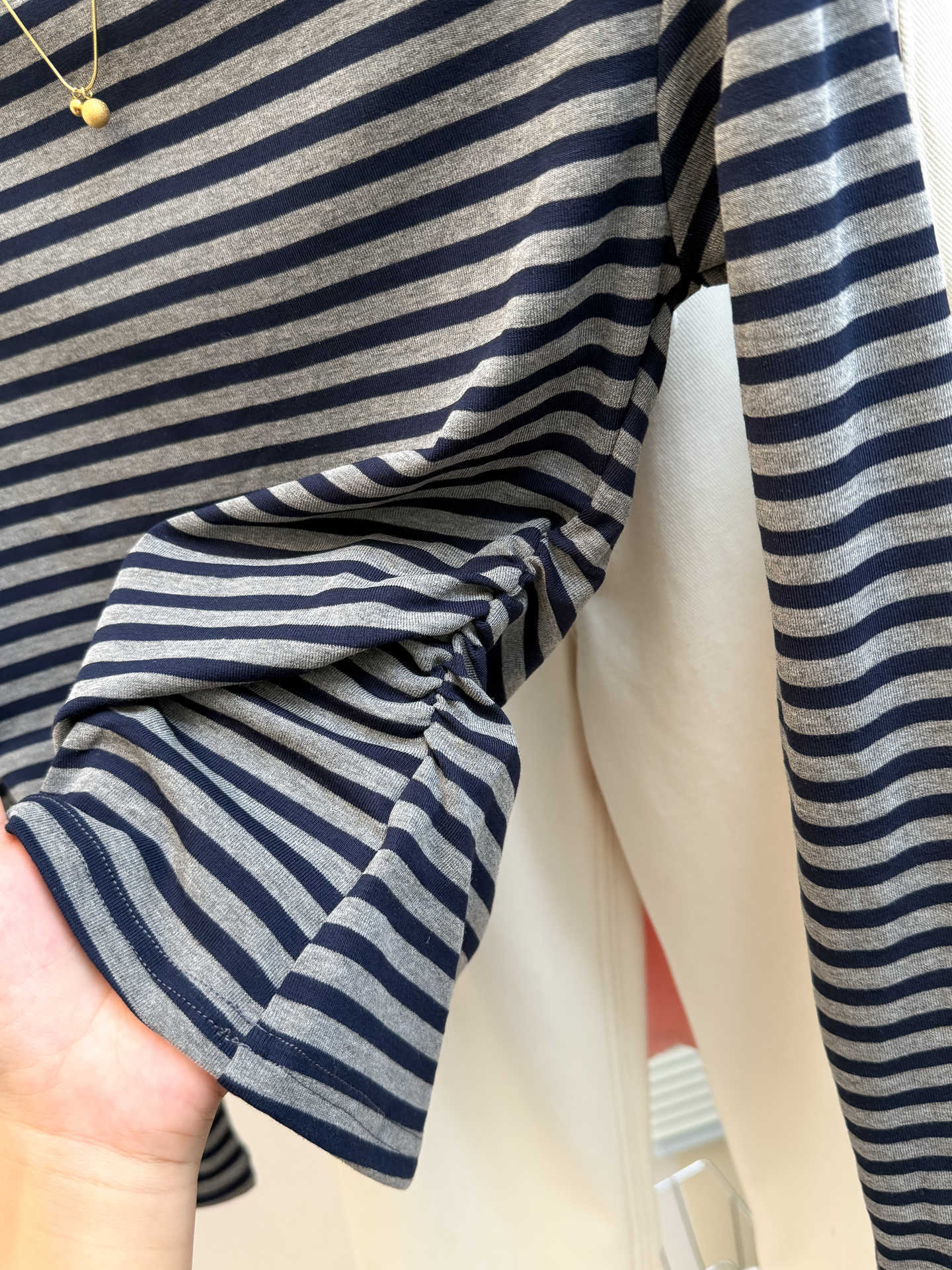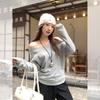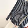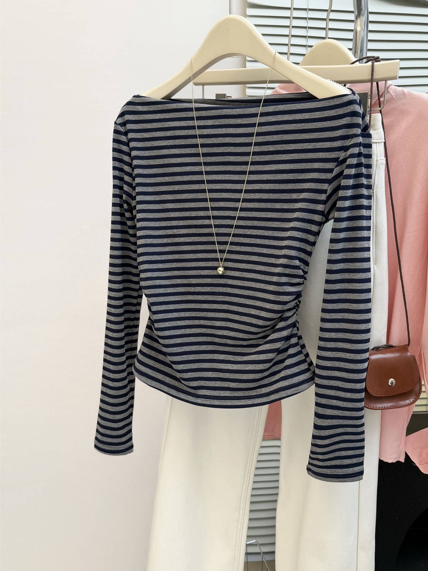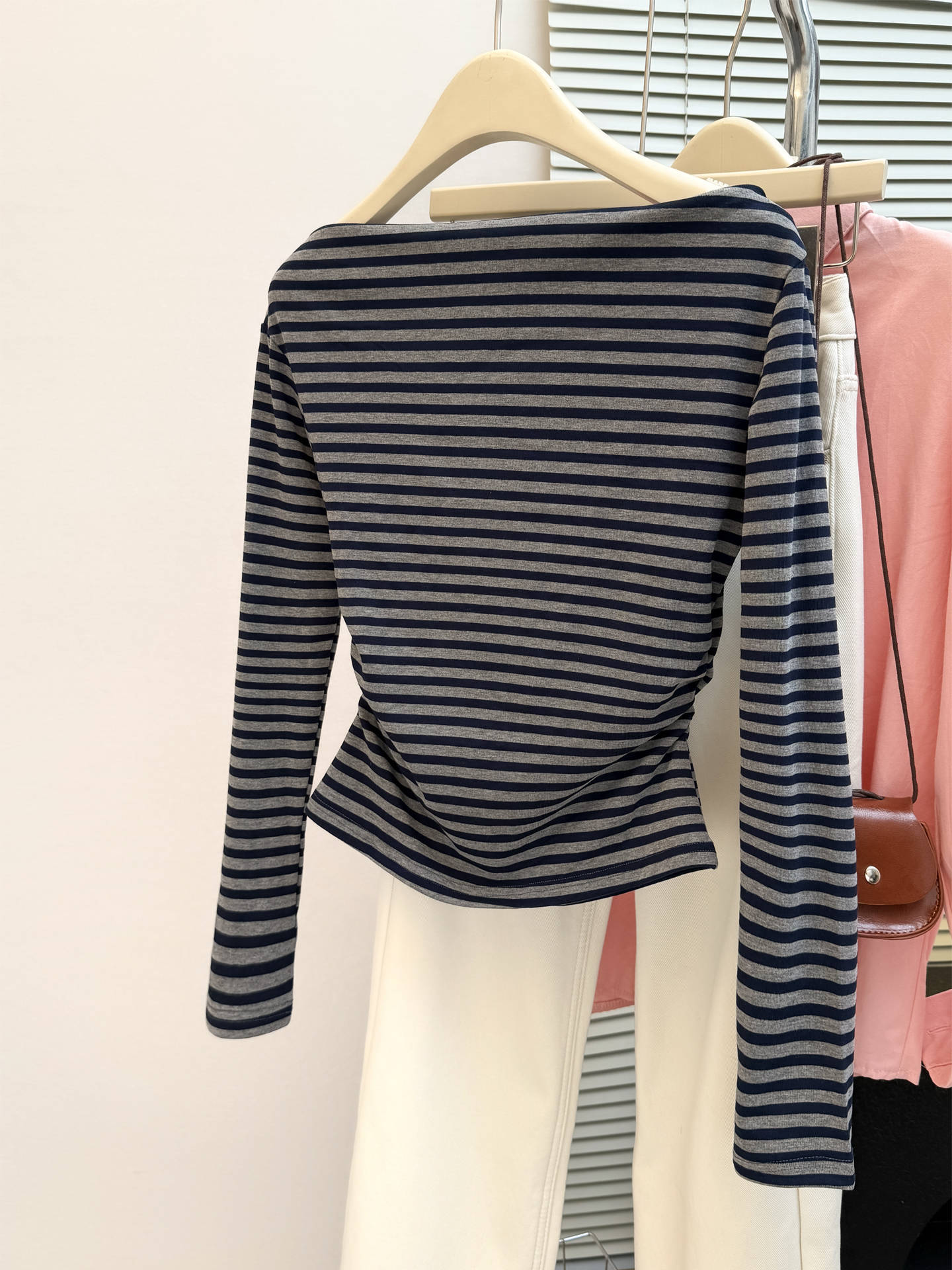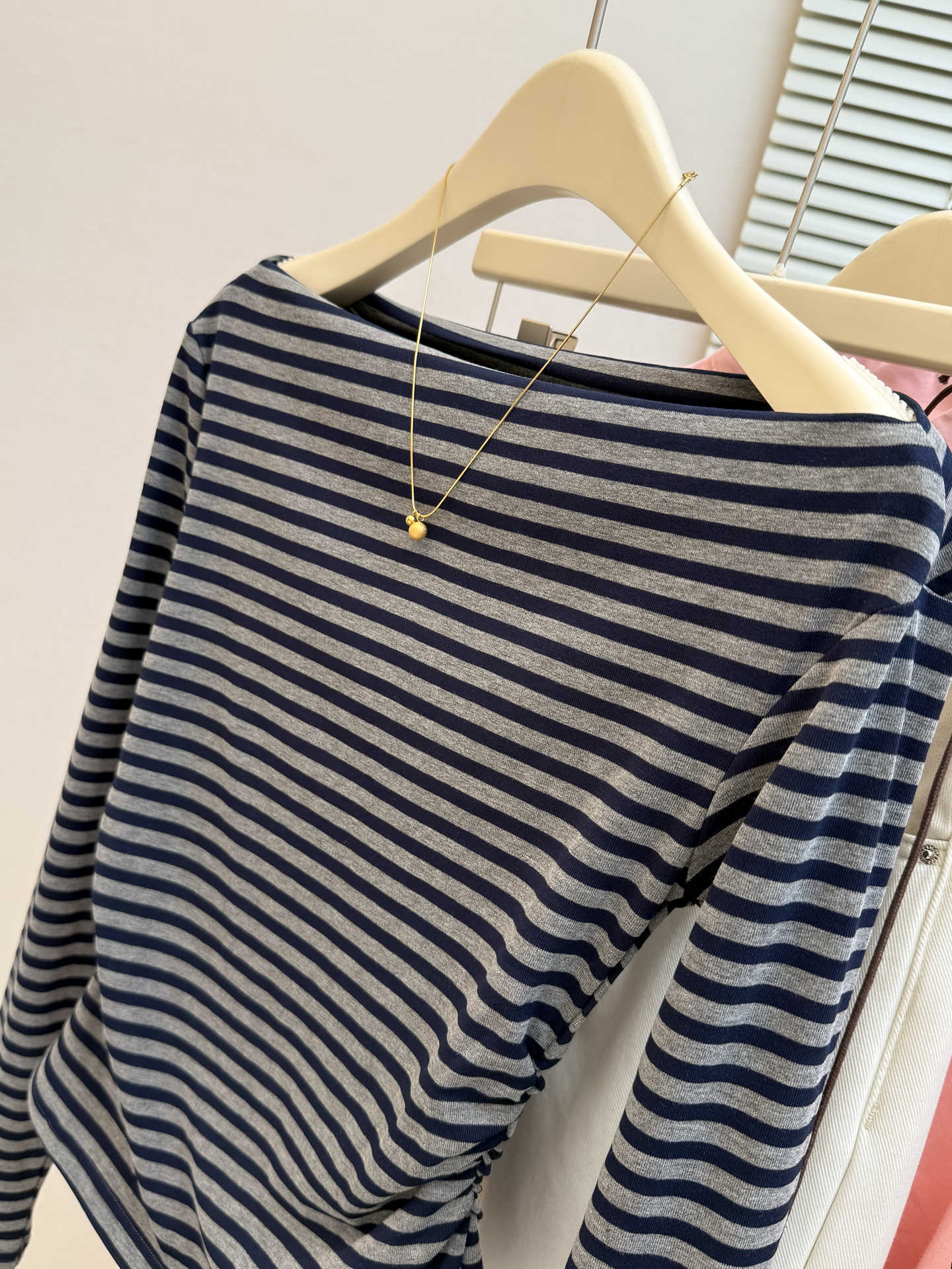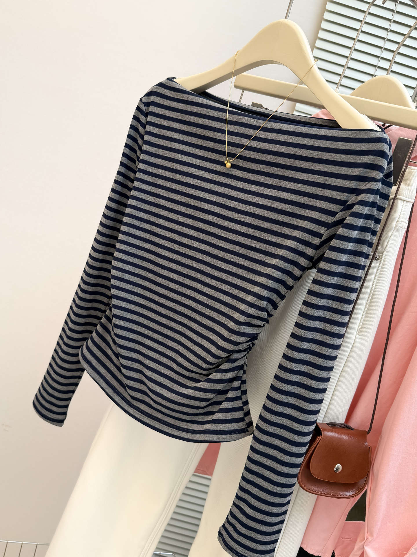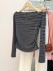 Camiseta de Manga Larga con Hombros Descubiertos a Rayas Estilo Americano Tiro Real Mujeres Primavera y Otoño 2025 Nueva Slim Estilo Coreano Camiseta Base Top