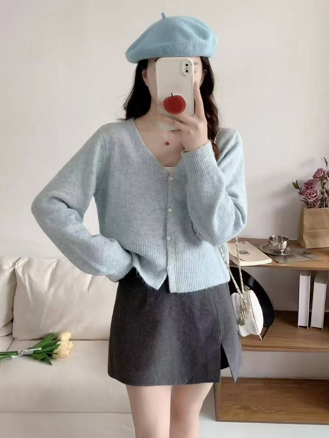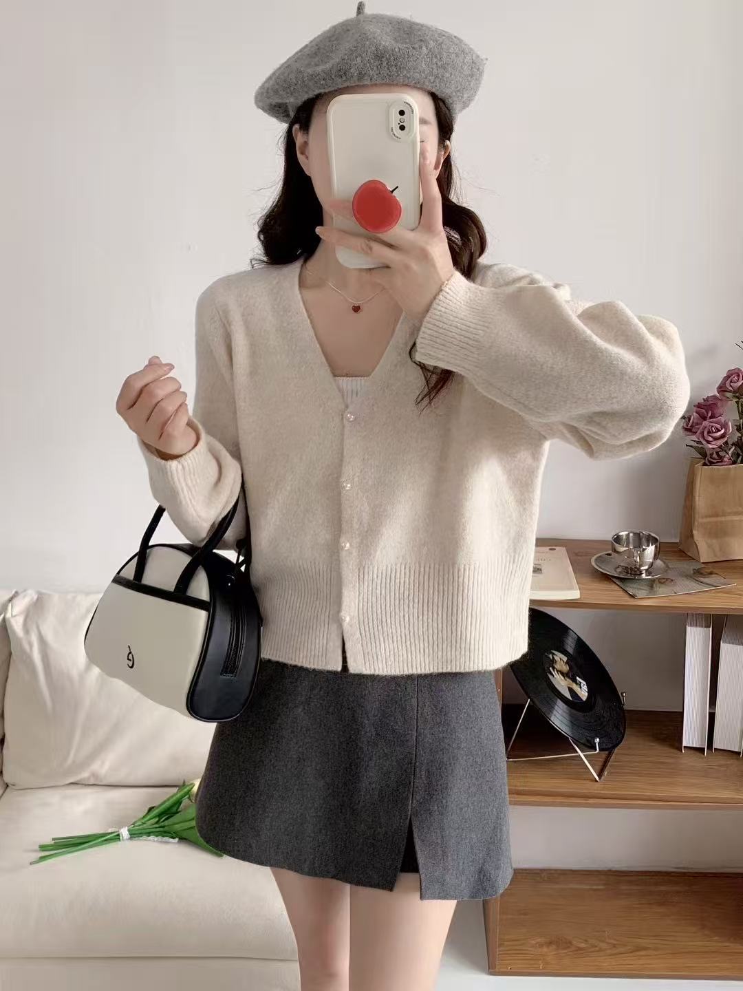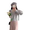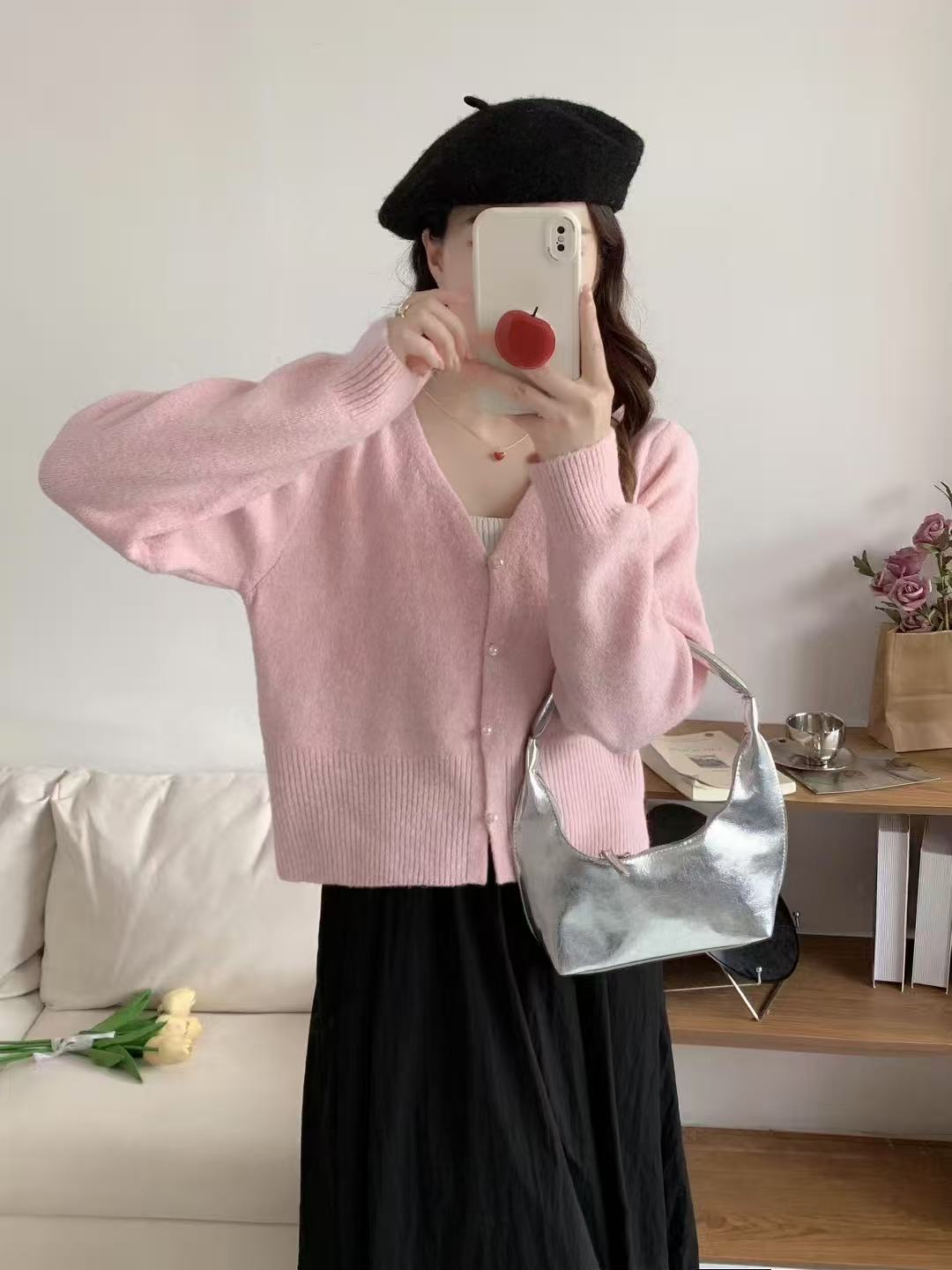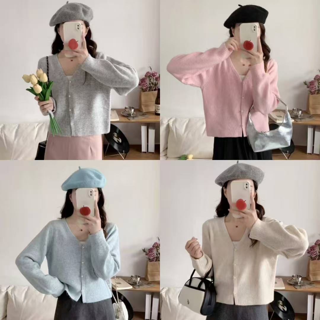 Estilo Coreano Nuevo 2025 Primavera y Otoño Camiseta Base Tejida Corta Cárdigan Suéter Abrigo Cuello en V Manga Larga Top Versátil
