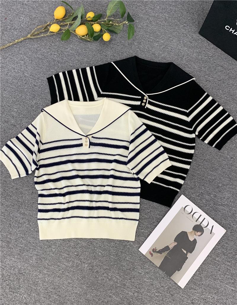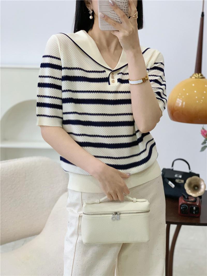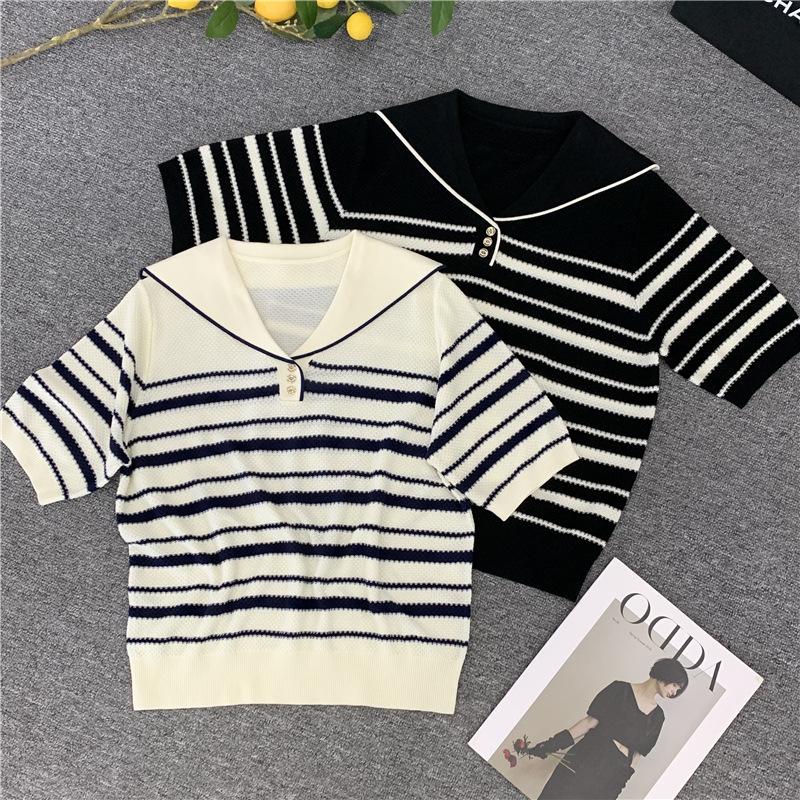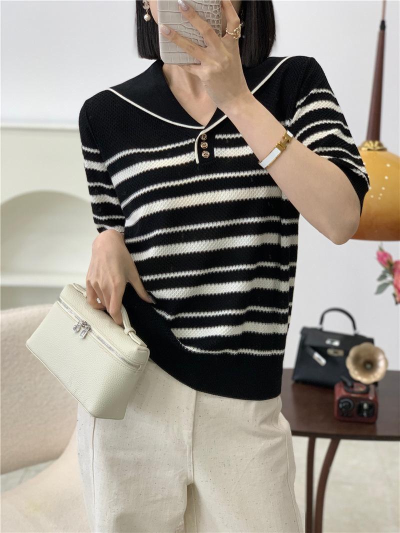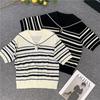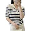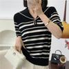 2025 Verano Nueva Llegada Camiseta de Punto de Manga Corta con Cuello Azul Marino a Rayas para Mujer Moda Elegante Suelta Adelgazante Combinable Top