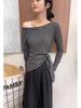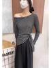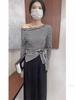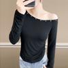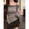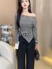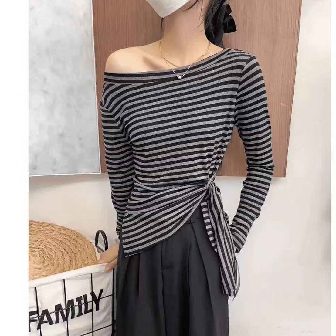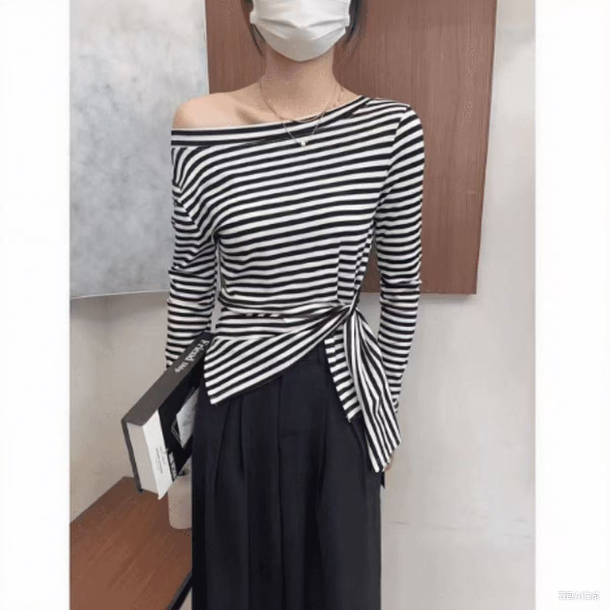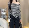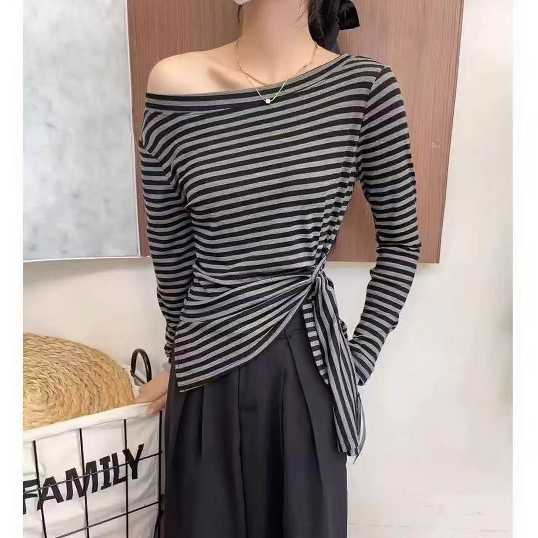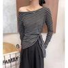 Playera Irregular de Hombro Inclinado a Rayas de Manga Larga para Mujer Otoño 2025 Nueva Adelgazante y Favorecedora de la Figura Fuera del Hombro Versátil Top con Temperamento