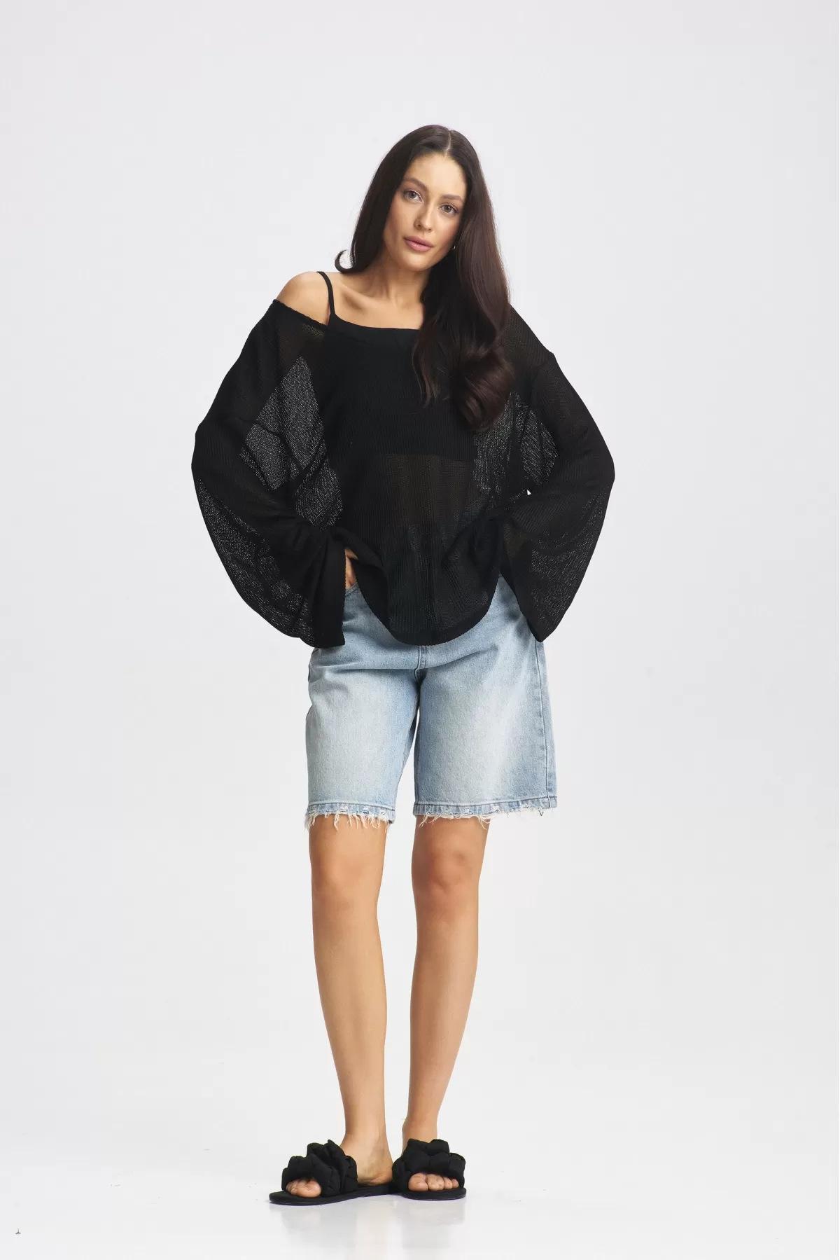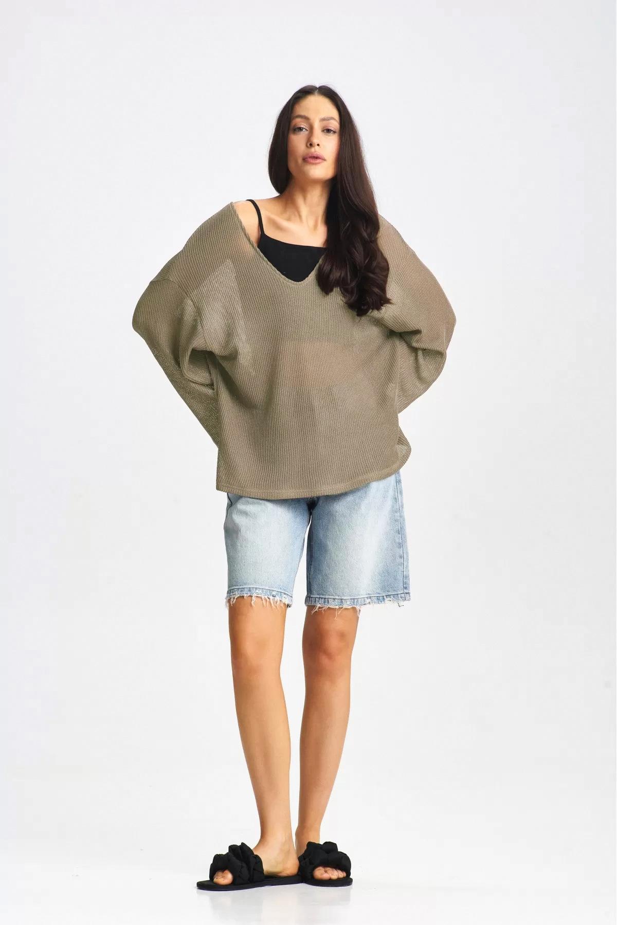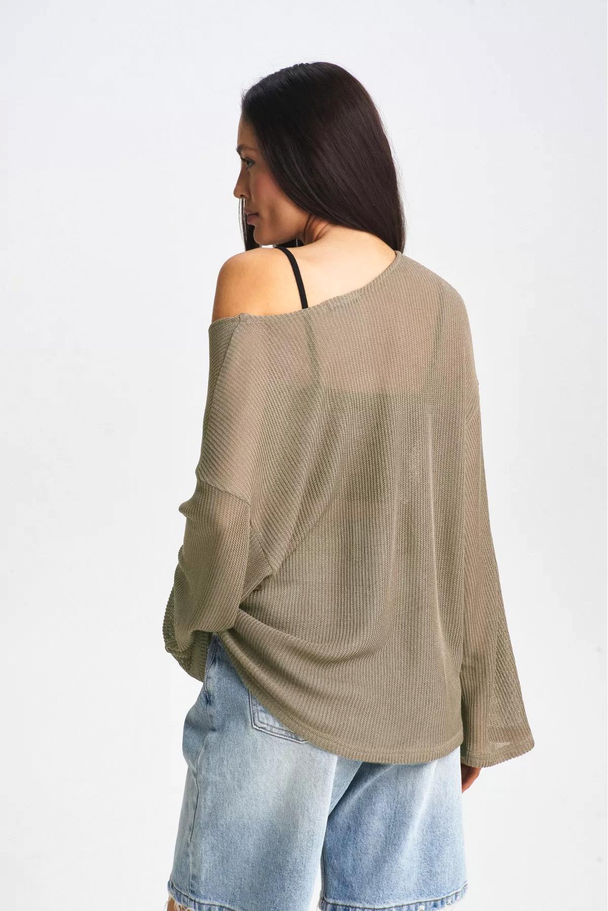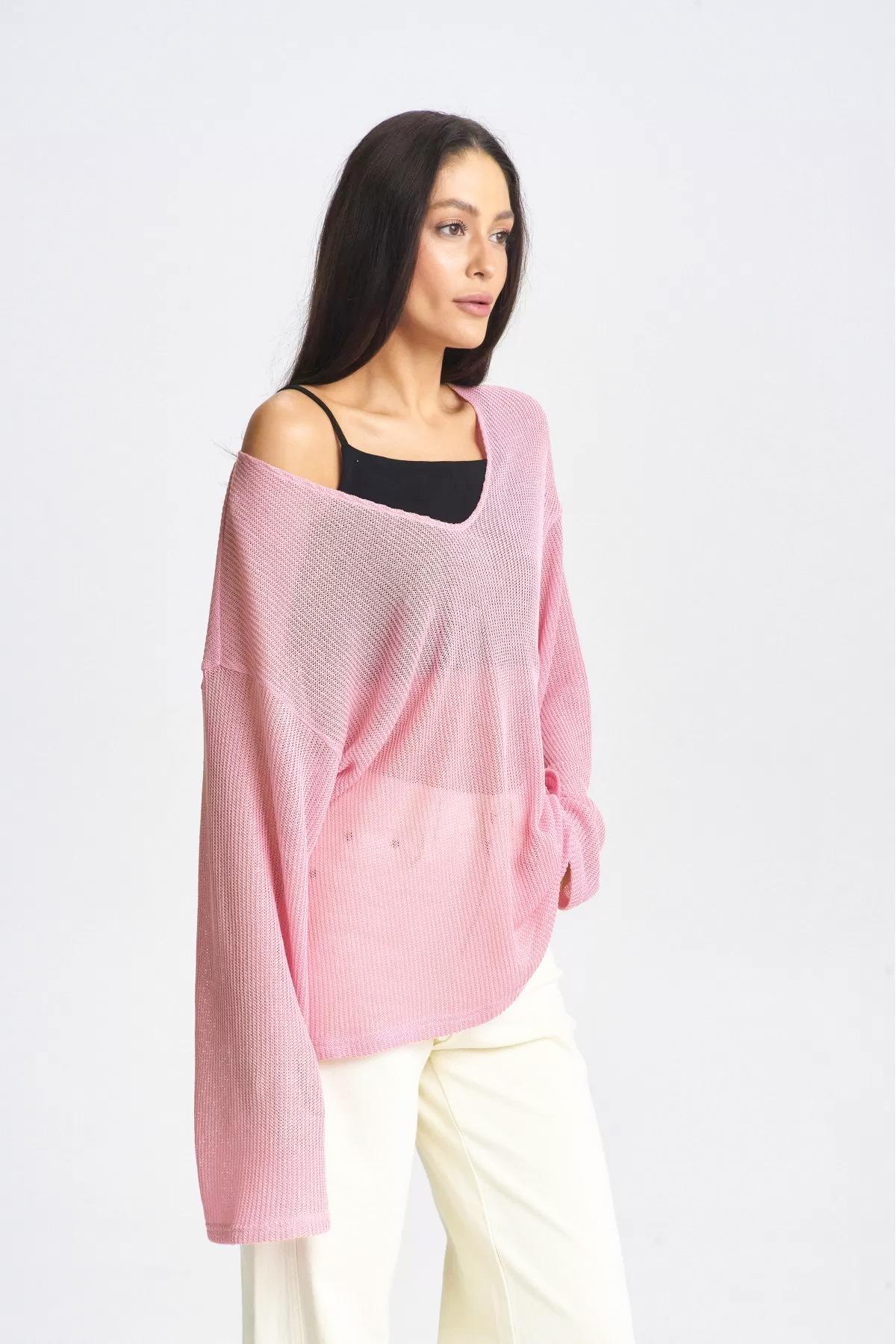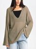 2025 Otoño e Invierno Nuevo Semi-Transparente Cuello en V Suelto Perezoso Tejido Camiseta de Manga Larga para Mujer con Diseño, Elegante y con Sentido del Diseño Transfronterizo